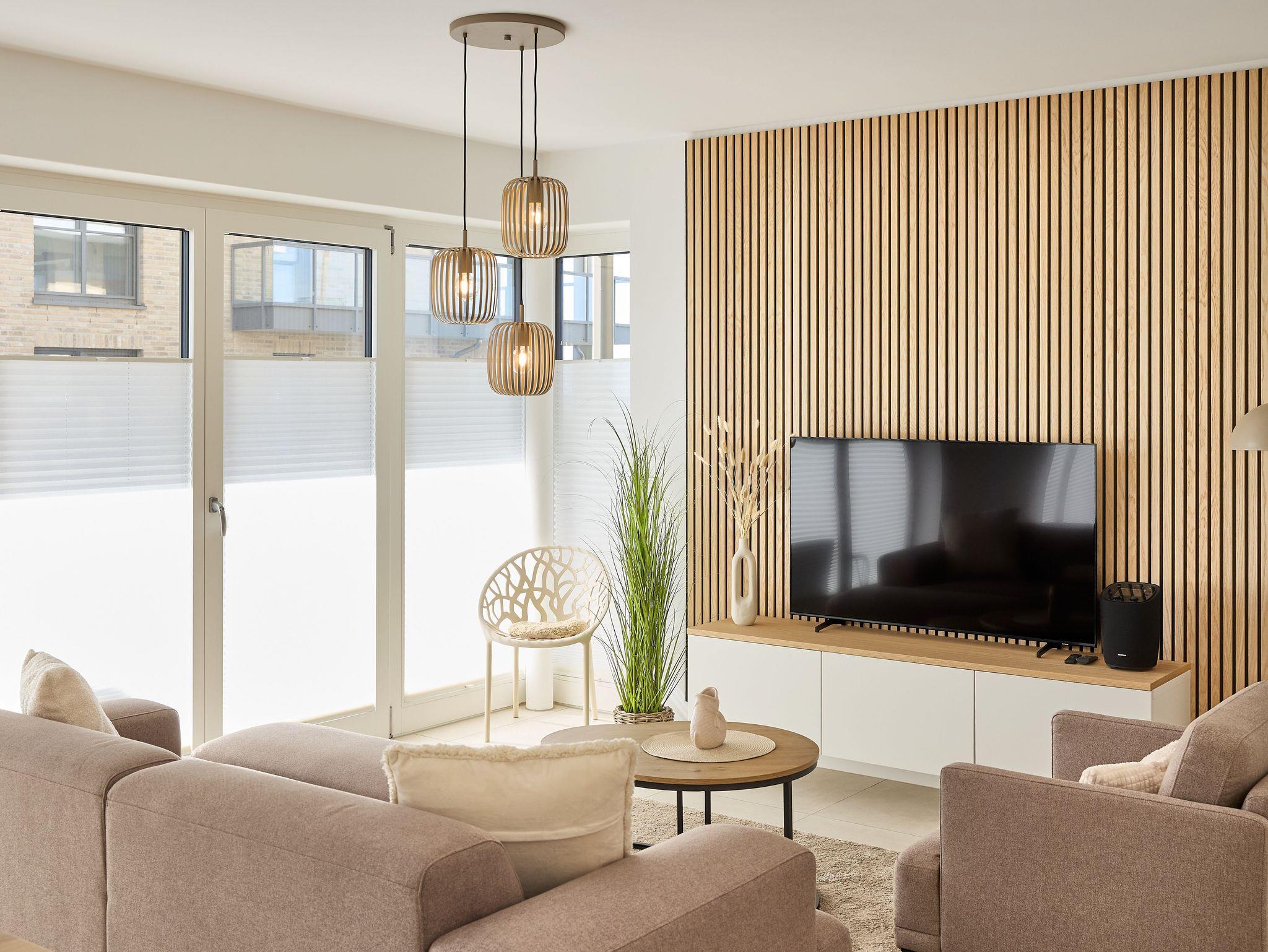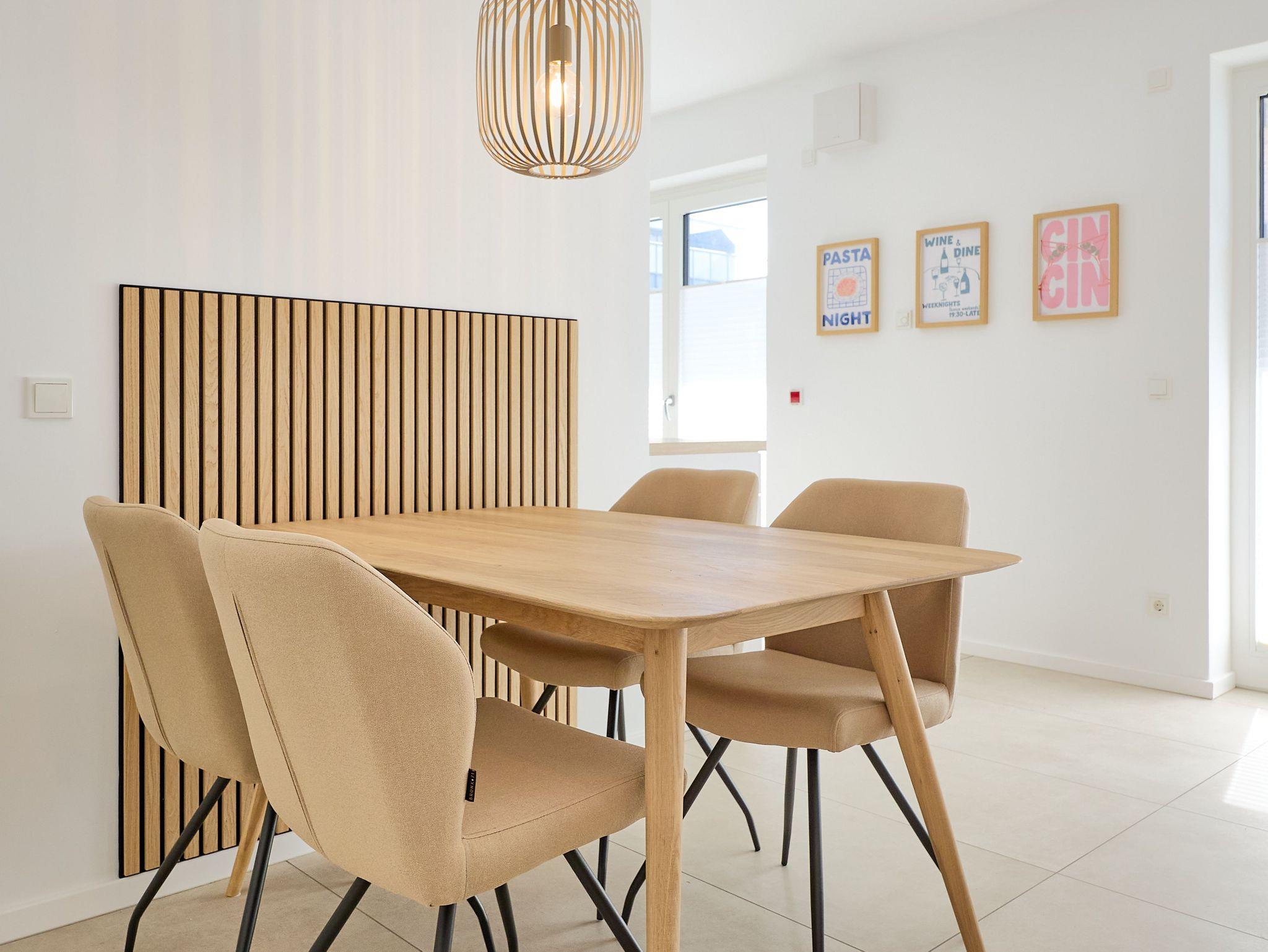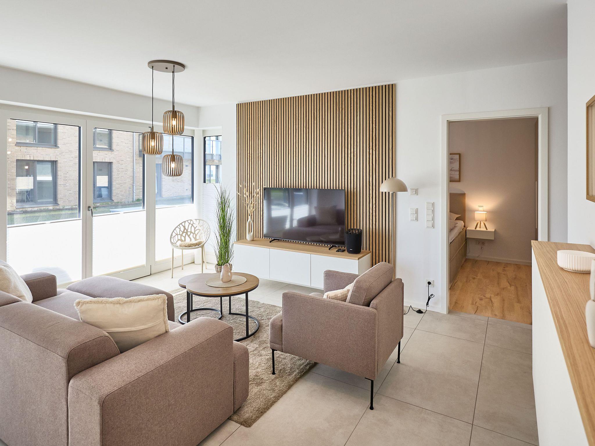 Die Wohnung überzeugt mit einem offenen Wohnbereich, der Kochen, Essen und Entspannen perfekt miteinander verbindet. Eine voll ausgestattete Küche mit Ceranfeld, Backofen, Kühlschrank mit Gefrierfach sowie einer Pad- und Filterkaffeemaschine lässt keine Wünsche offen. Der stilvolle Esstisch bietet Platz für gemeinsame Mahlzeiten, während das gemütliche Sofa und ein großer 55?? Flachbild-TV entspannte Stunden garantieren.