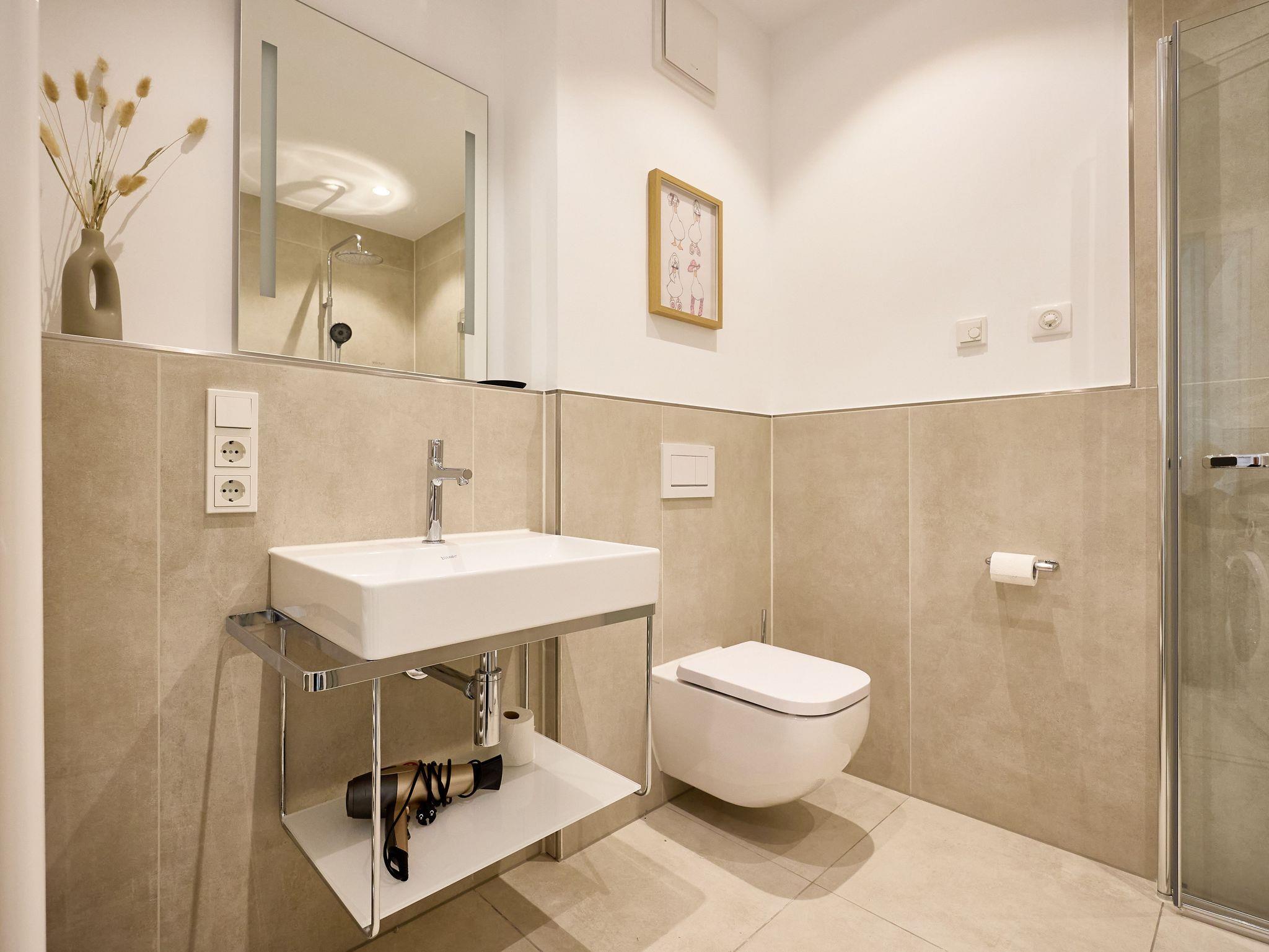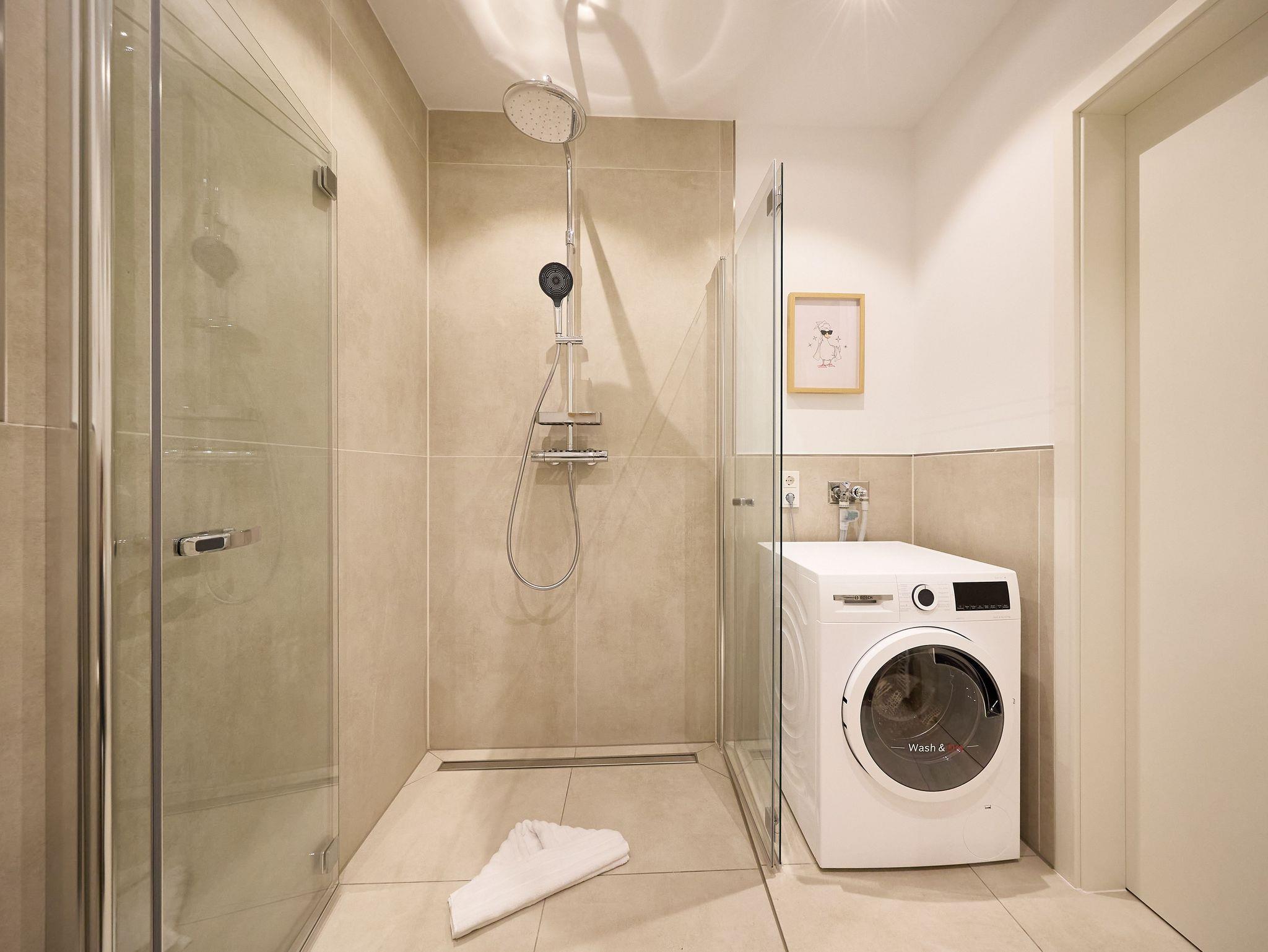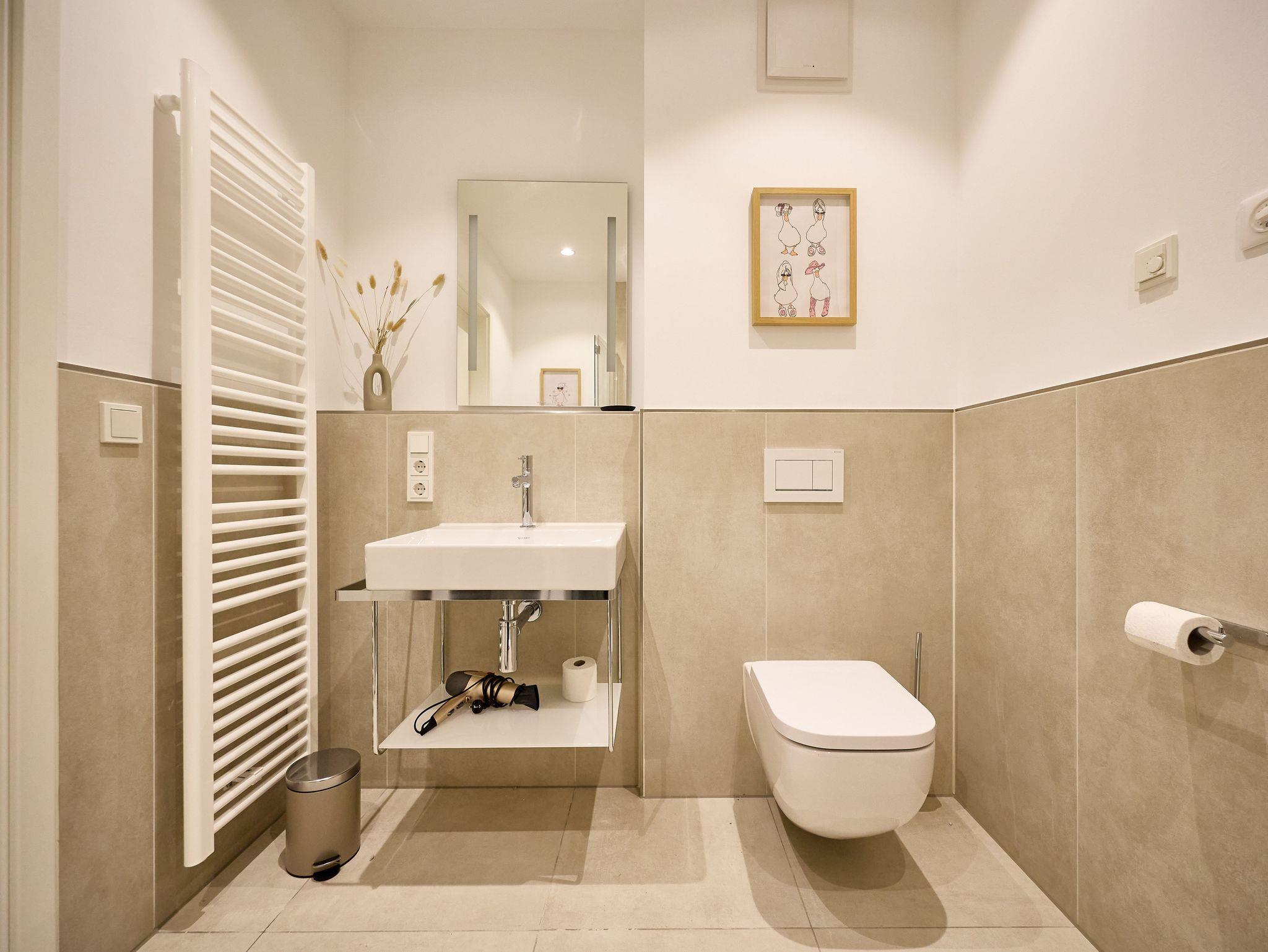 Das moderne Badezimmer besticht durch eine bodengleiche Regendusche, hochwertige Armaturen, eine Handtuchheizung sowie einen praktischen Waschtrockner. Ein zusätzliches Gäste-WC sorgt für noch mehr Komfort. Die gesamte Wohnung verfügt über eine angenehme Fußbodenheizung.