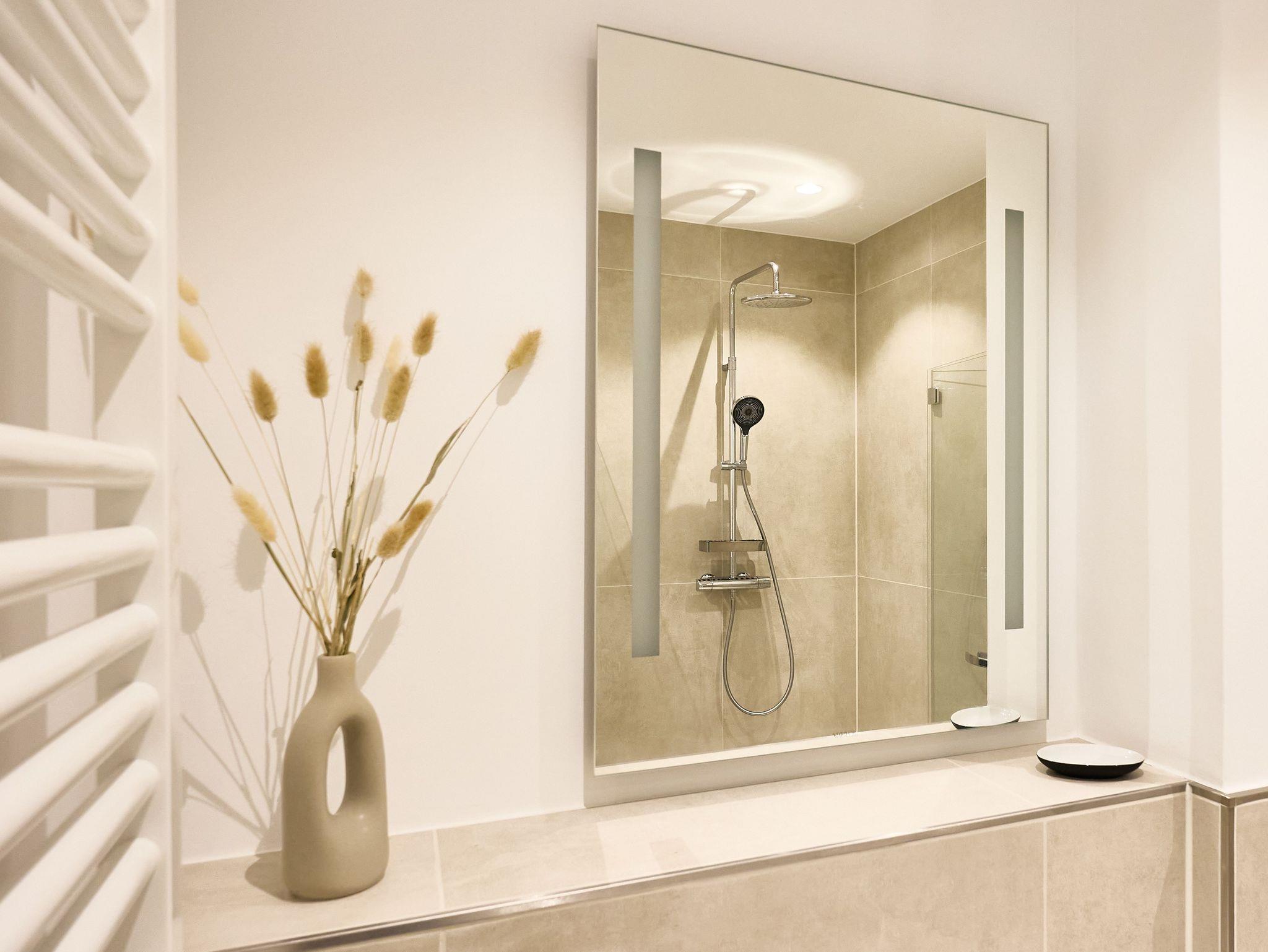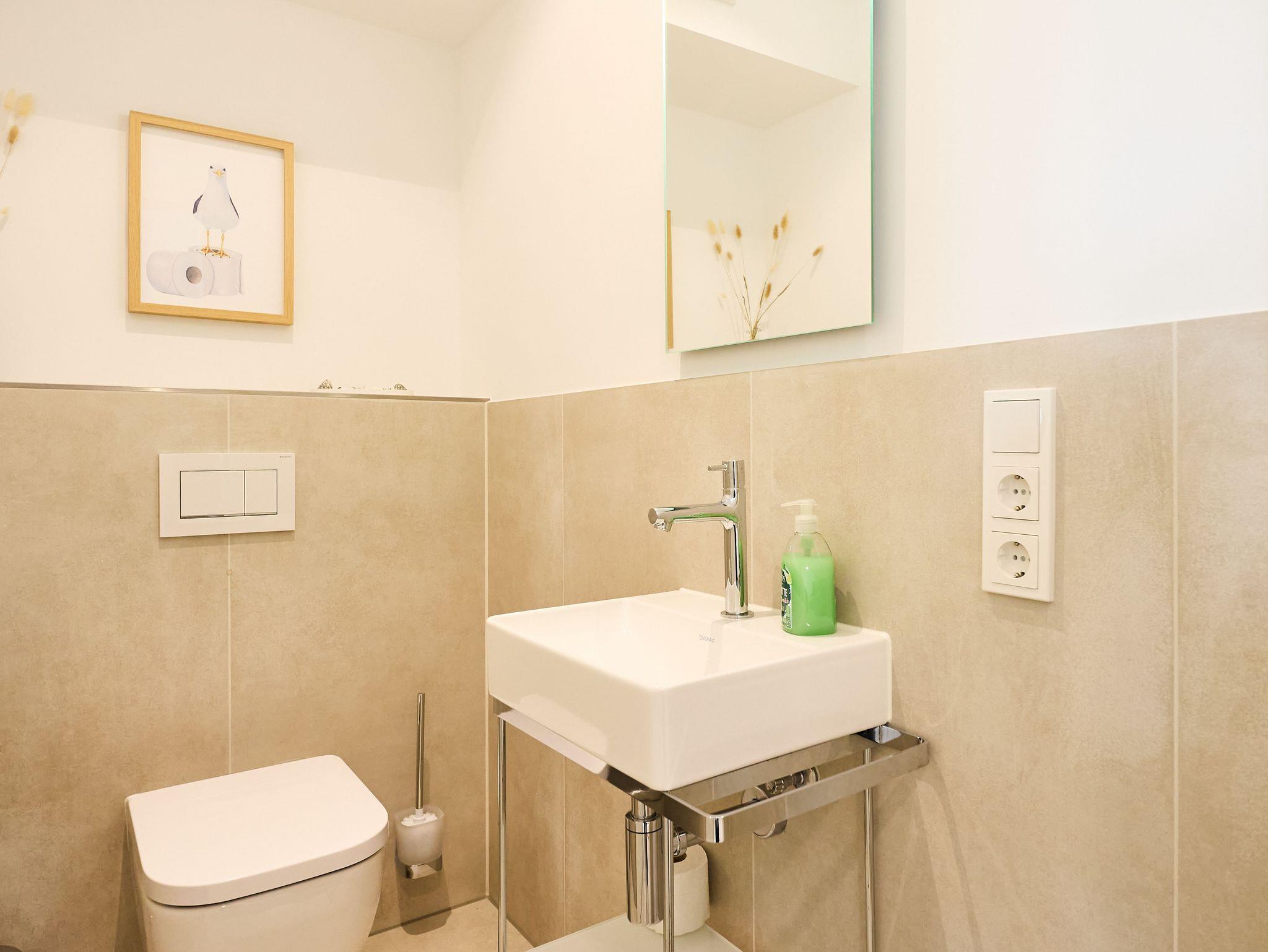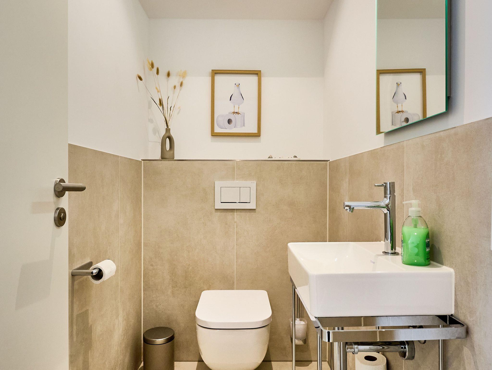 Das moderne Badezimmer besticht durch eine bodengleiche Regendusche, hochwertige Armaturen, eine Handtuchheizung sowie einen praktischen Waschtrockner. Ein zusätzliches Gäste-WC sorgt für noch mehr Komfort. Die gesamte Wohnung verfügt über eine angenehme Fußbodenheizung.