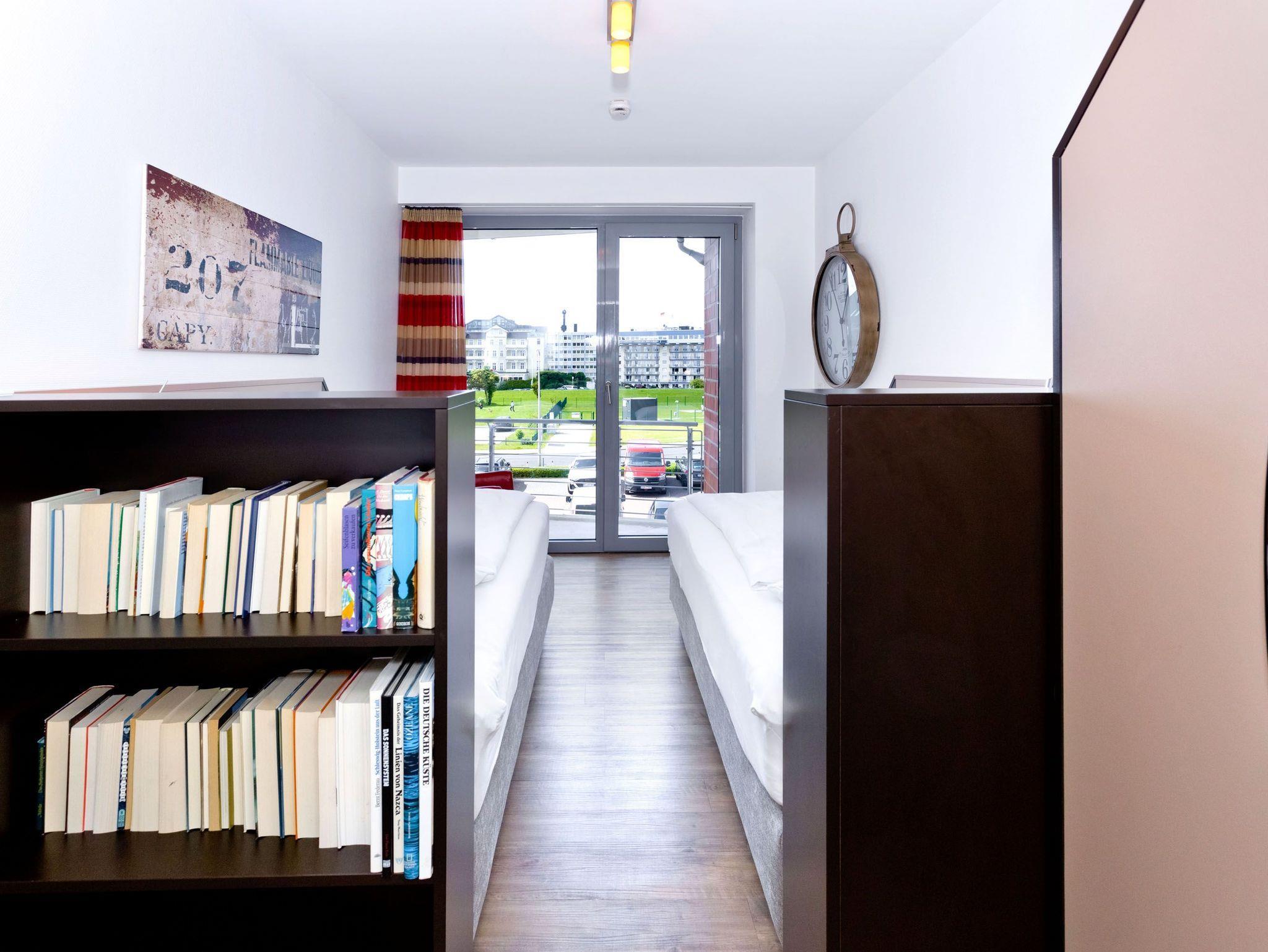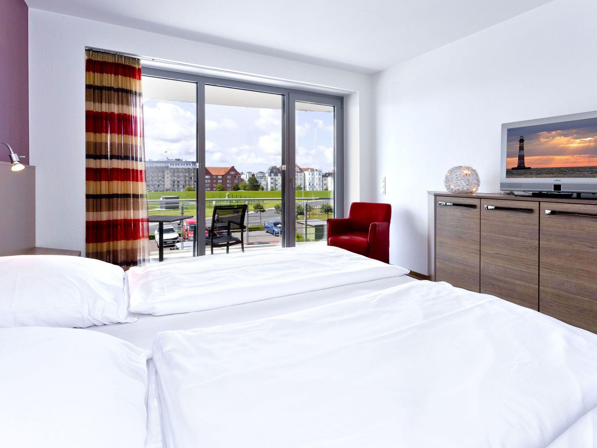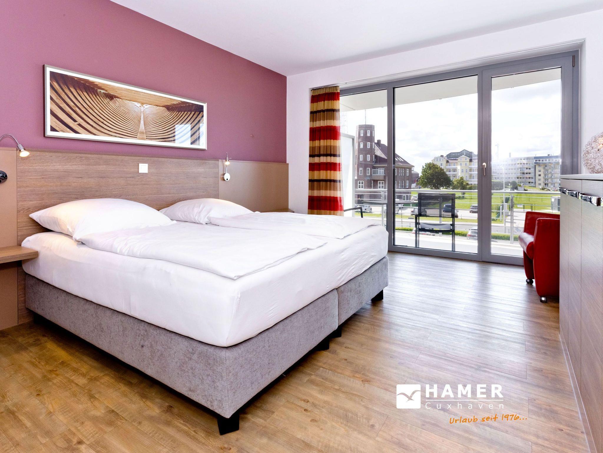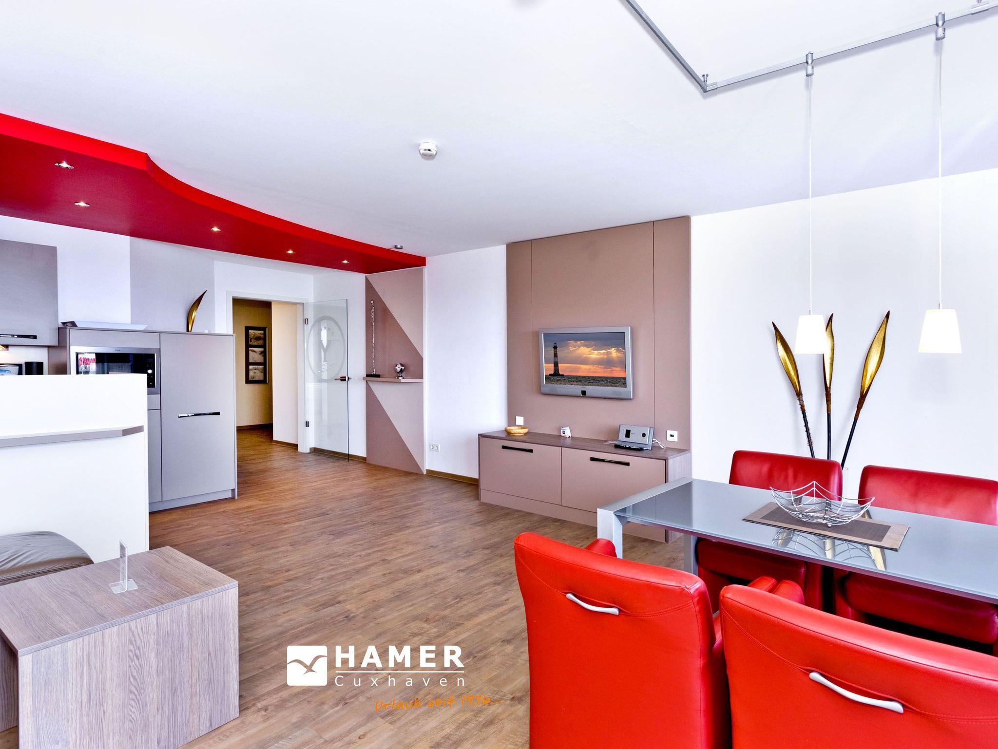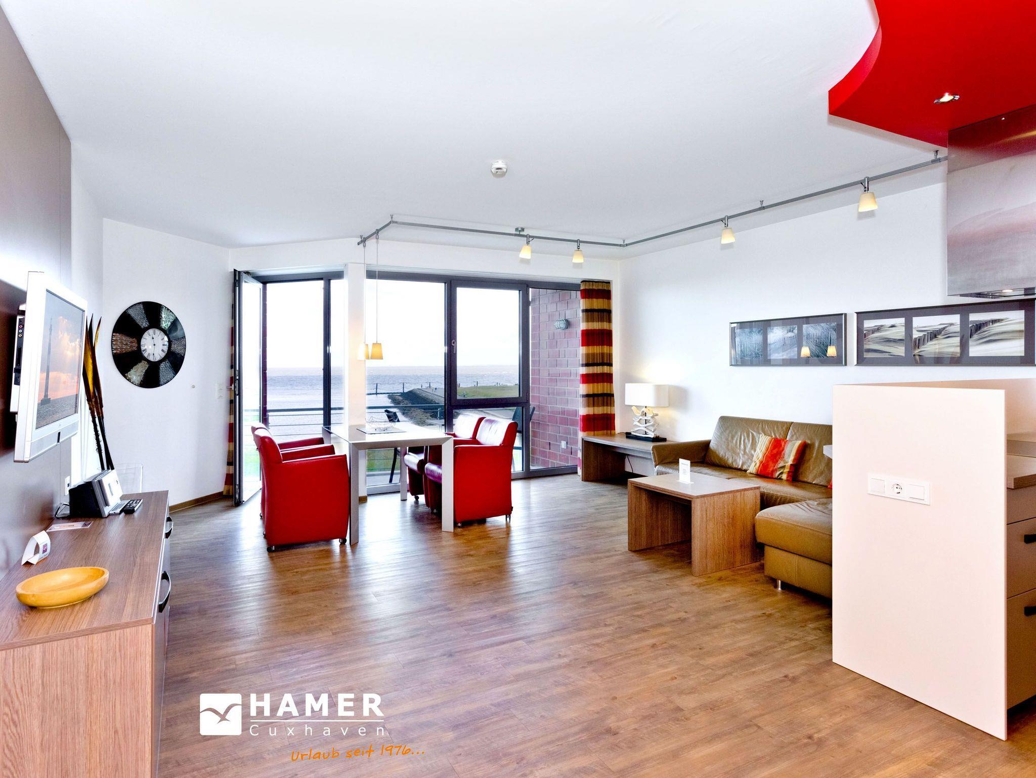 Sehr geschmackvolle Wohnung in der 1.Etage auf 102 m² mit voller Traumseesicht auf den Weltschifffahrtsweg und die Hafenanlagen. 1 Schlafzimmer mit Doppelbett (Boxspringbett) und TV, 1 Schlafzimmer mit 2 Einzelbetten, beide Schlafzimmer mit Rollläden, 1 Du/Wc und 1 Gäste-Wc, Föhn, großes Wohnzimmer mit komplett ausgestatteter Küchenzeile, TV, CD, 2 große Balkone (nord+süd). Zur Wohnung gehört ein reservierter Pkw-Stellplatz am Haus. Keine Haustiere. Nichtraucher. Fahrräder können auch bequem und sicher im ebenerdigen Fahrradraum des Nachbargebäudes abgestellt werden (separater Schlüssel).