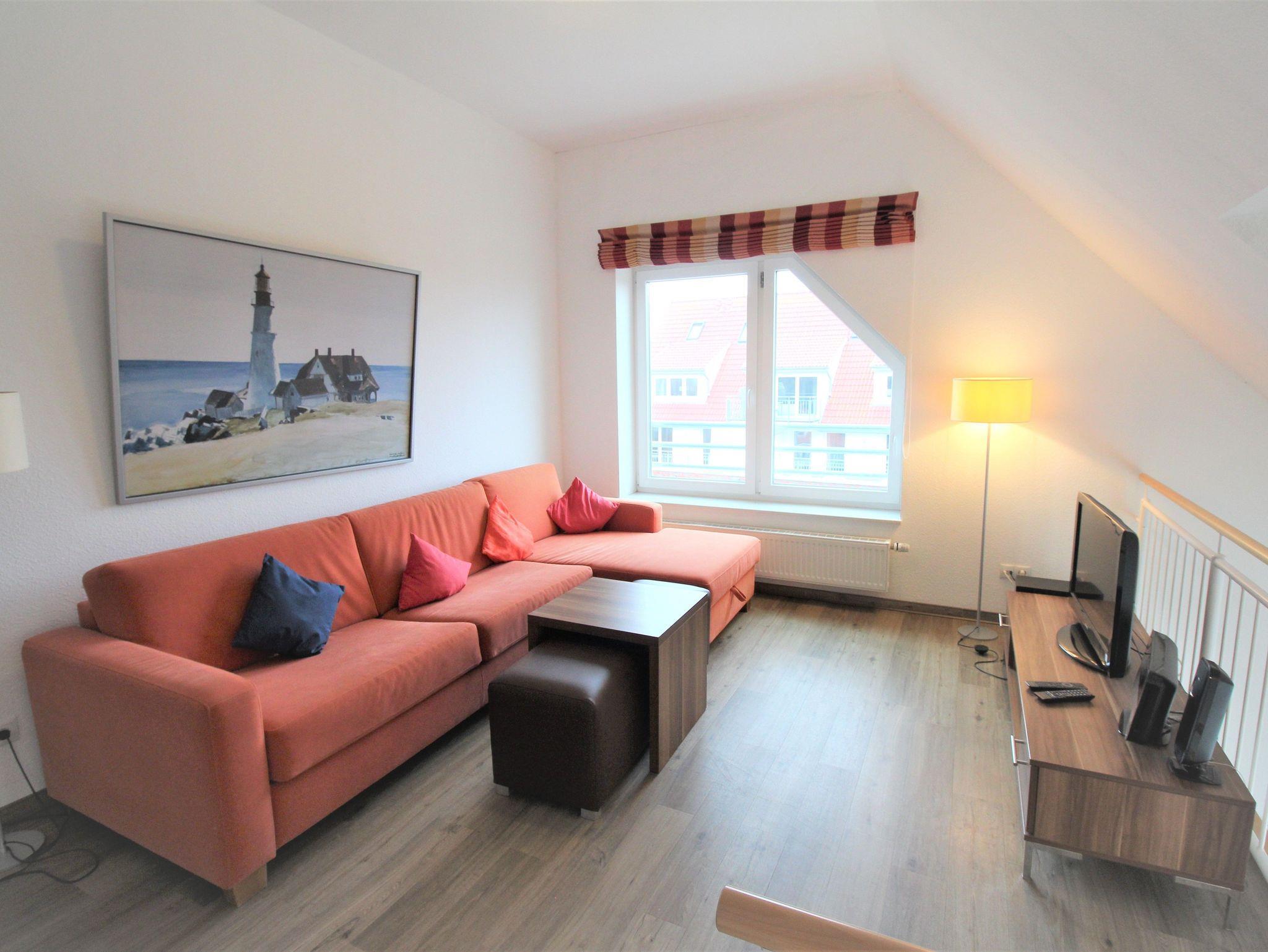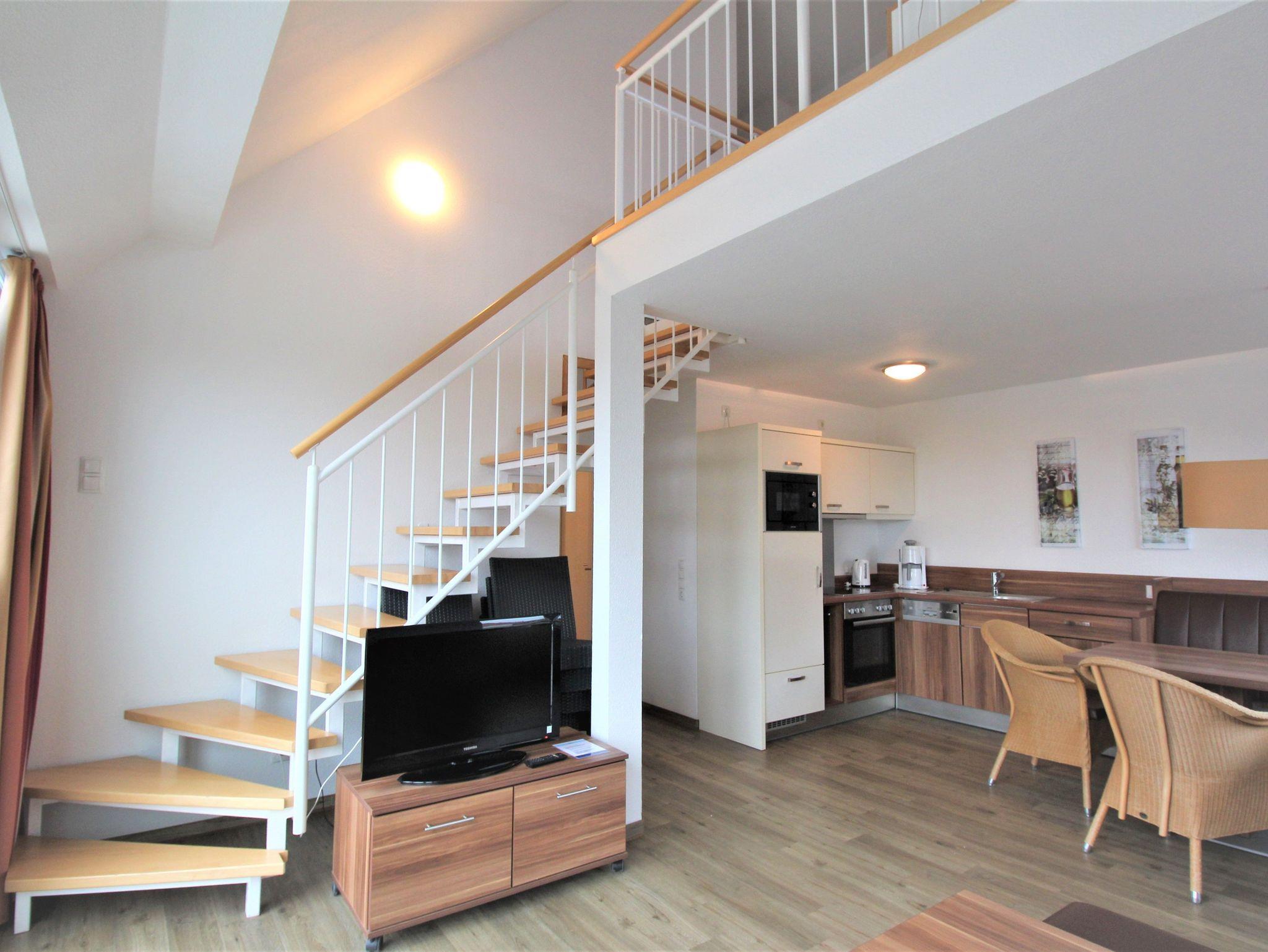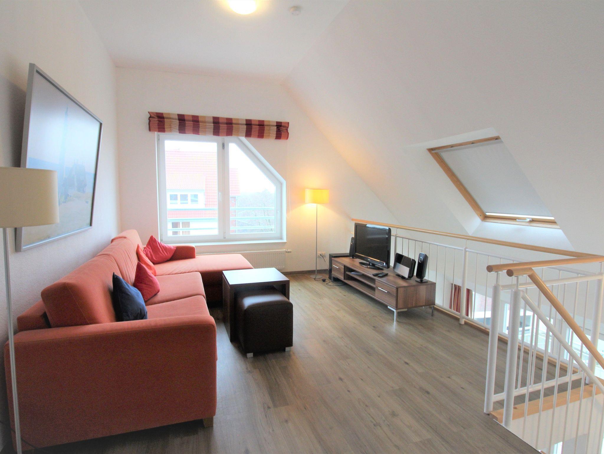 Im Galeriegeschoss befindet sich der gemütliche Wohnbereich auf der Empore, SAT-TV mit Flachbildschirm,