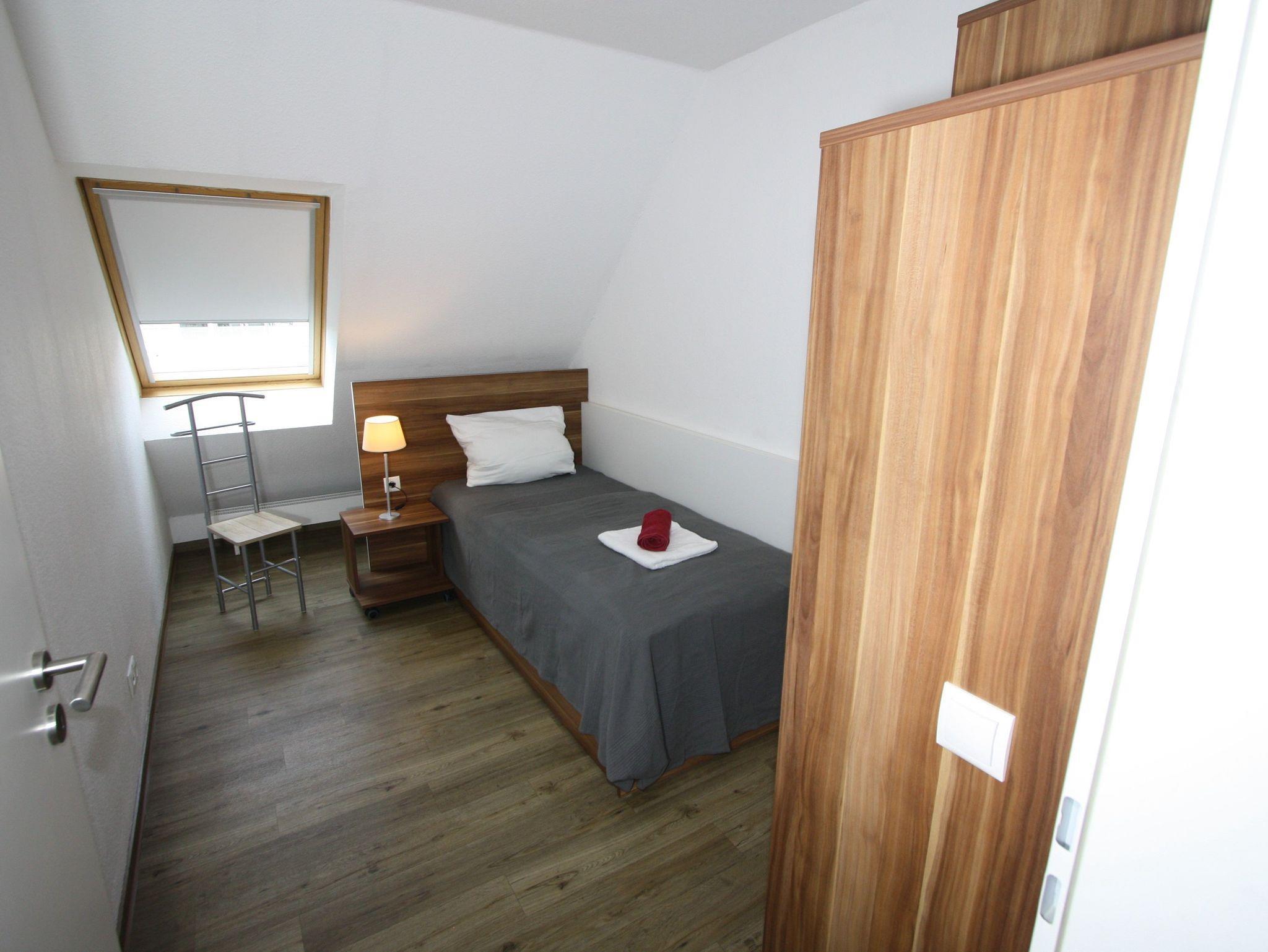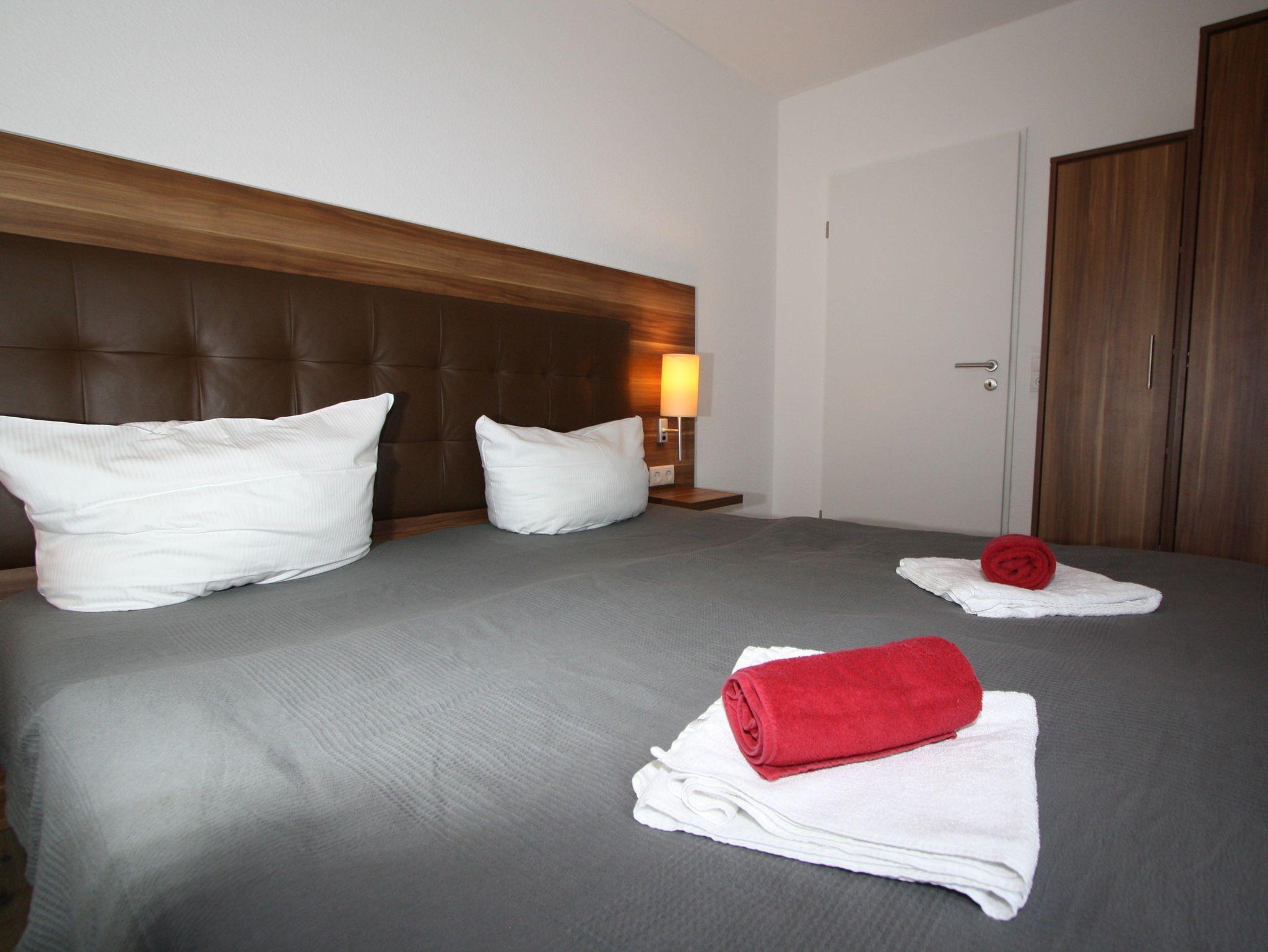 Schlafzimmer mit Doppelbett und 2. Schlafzimmer mit Einzelbett und Unterschubbett. Duschbad und große