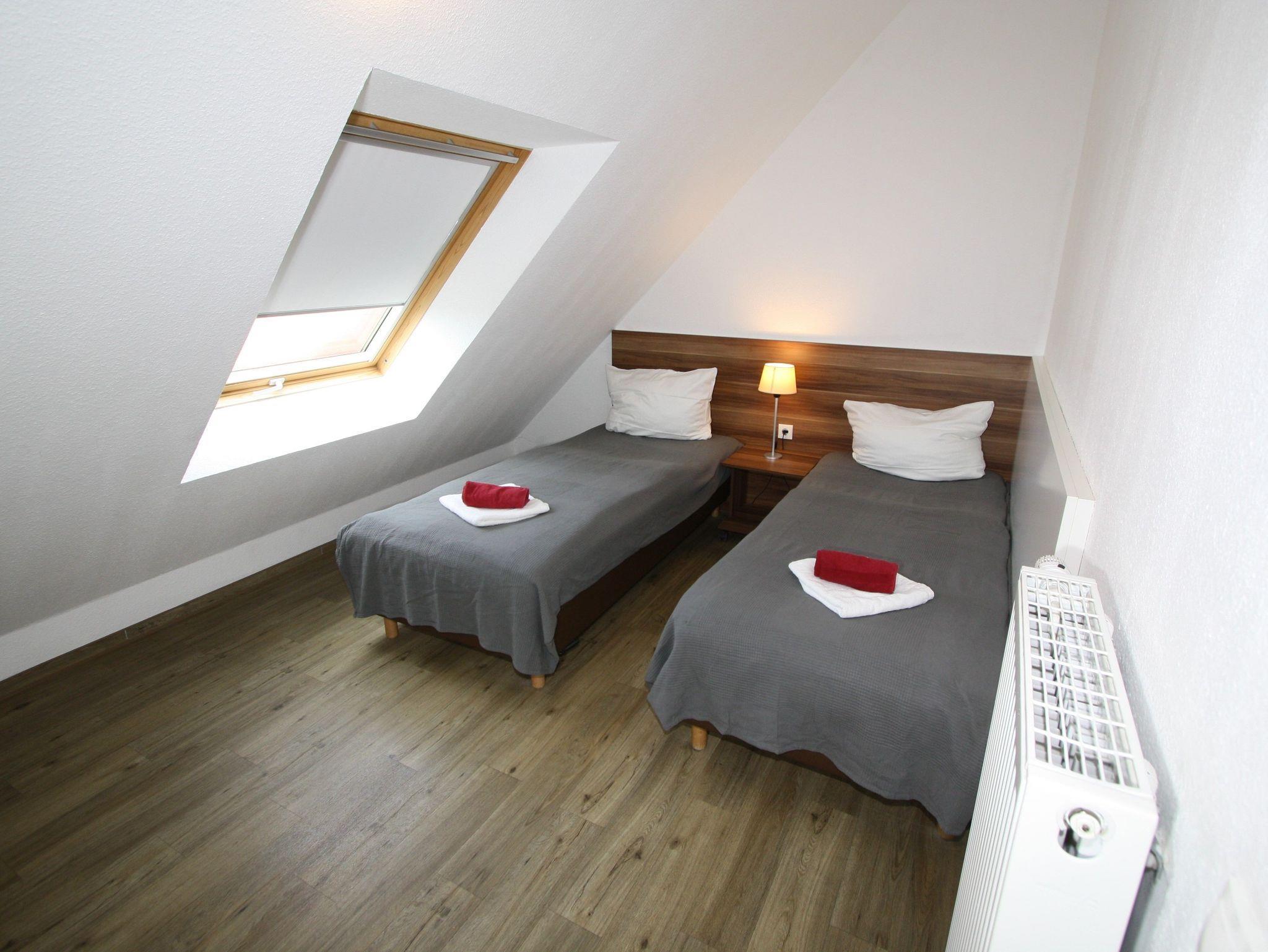 ein Wannenbad, ein Schlafzimmer mit getrennten Betten.