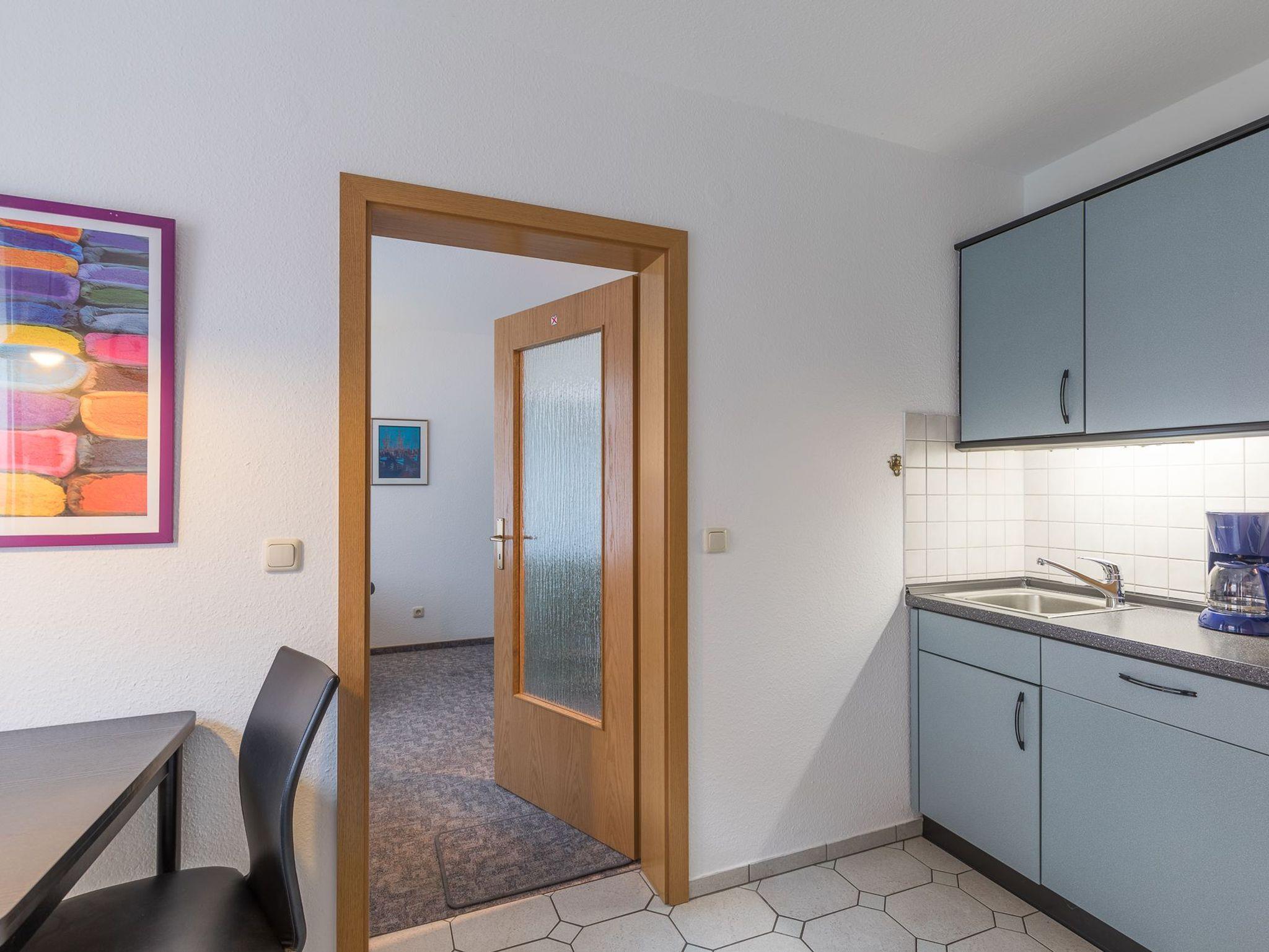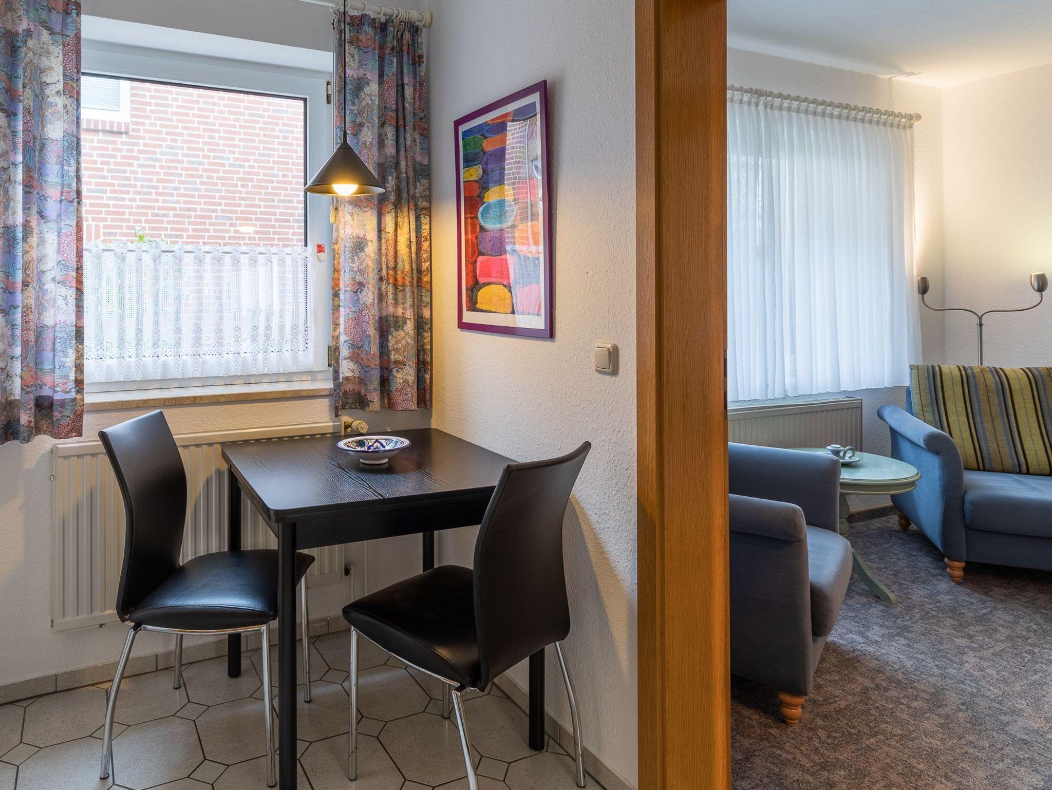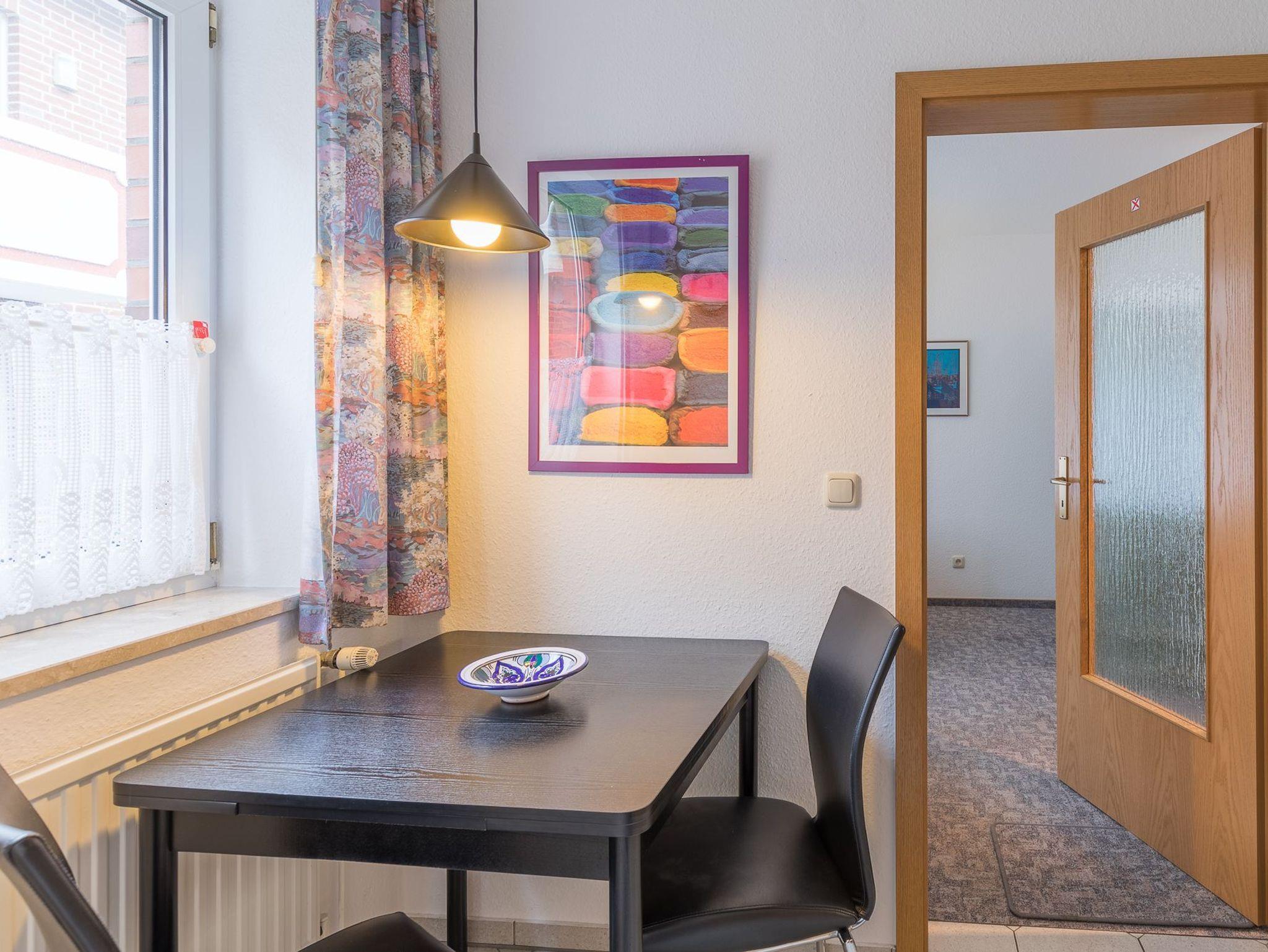 Die Ferienwohnung 1, mit einer Größe von ca. 30 m² Wohnfläche ist komplett bis zu 2 Personen ausgestattet. Wohnzimmer mit Sitzmöglichkeiten, TV und abgetrennten Betten (Doppelbett), Eingangsbereich mit Einbauküche (Cerankochfeld, Kaffeemaschine, Toaster, Wasserkocher), Essplatz, Sofa-Ecke, Bad mit Dusche und WC, Nichtraucherwohnung, keine Haustiere, PKW Stellplatz direkt am Haus.