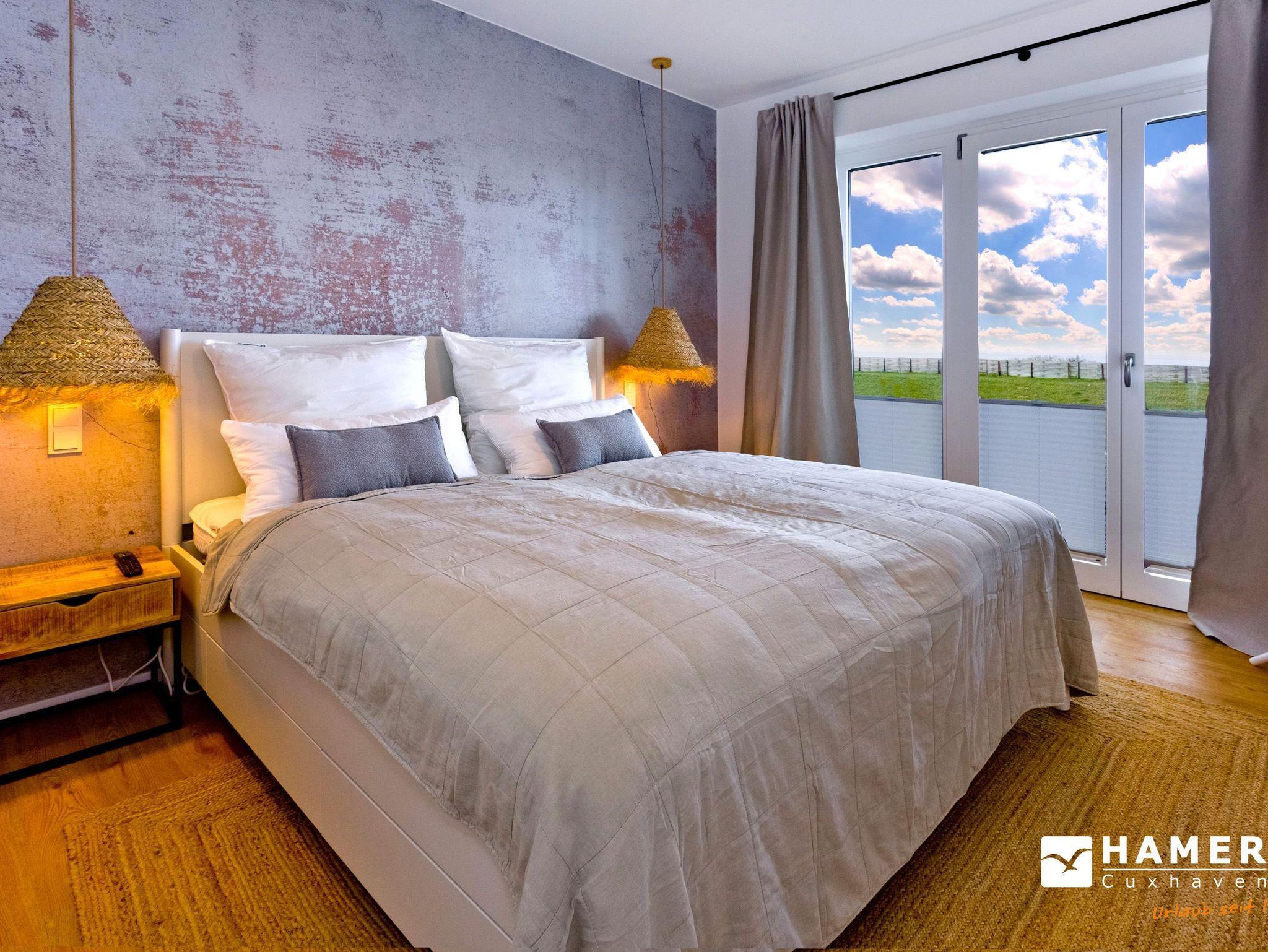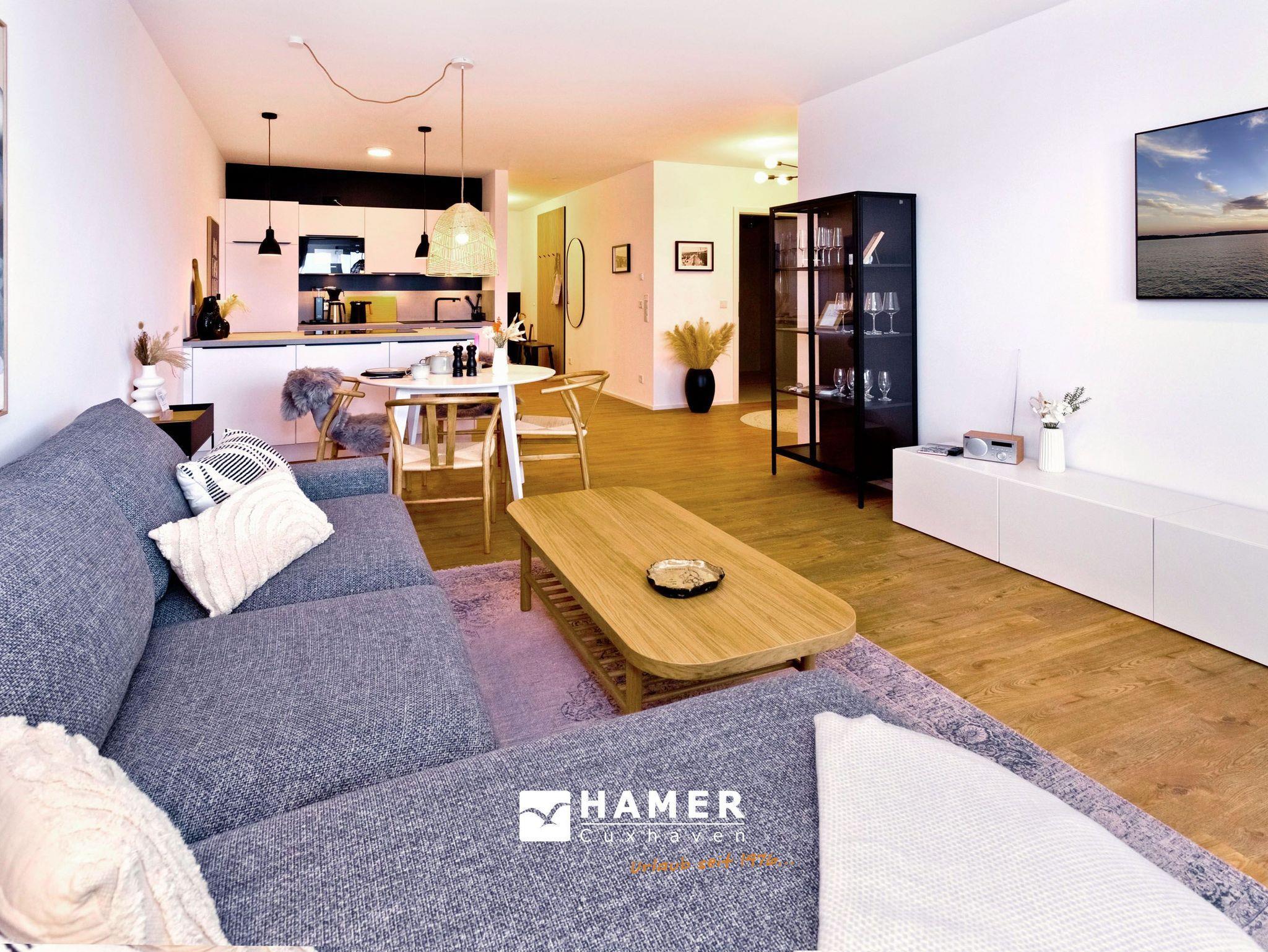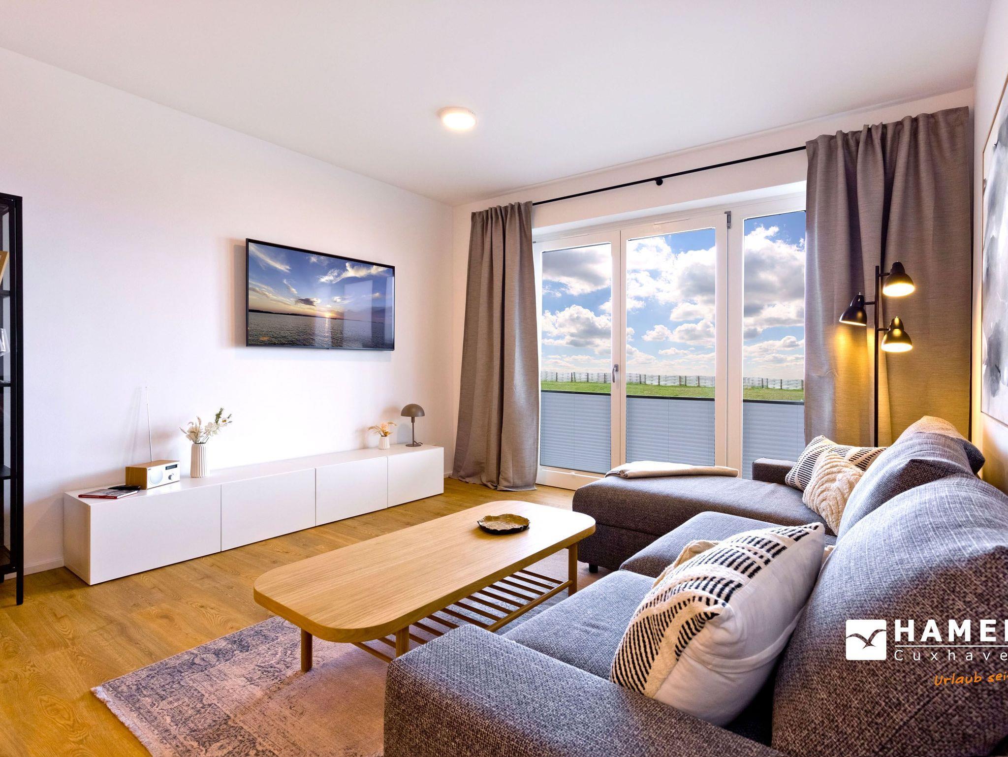 Sehr schöne, großzügige 2-Raum-Ferienwohnung auf ca. 73m² für bis zu 4 Personen (max. 2 Erw. 2 Kinder bis 16J.) geeignet. Großzügiges Wohn- / Schlafzimmer mit hochwertiger Schlafcouch, TV, Radio, kostenloses W-LAN-Internet, Essplatz an Küchenblock angrenzend, Außenjalousien u. Plissees, Zugang zur Terrasse mit Seeblick auf Neuwerk, eigener Strandkorb auf der Terrasse.