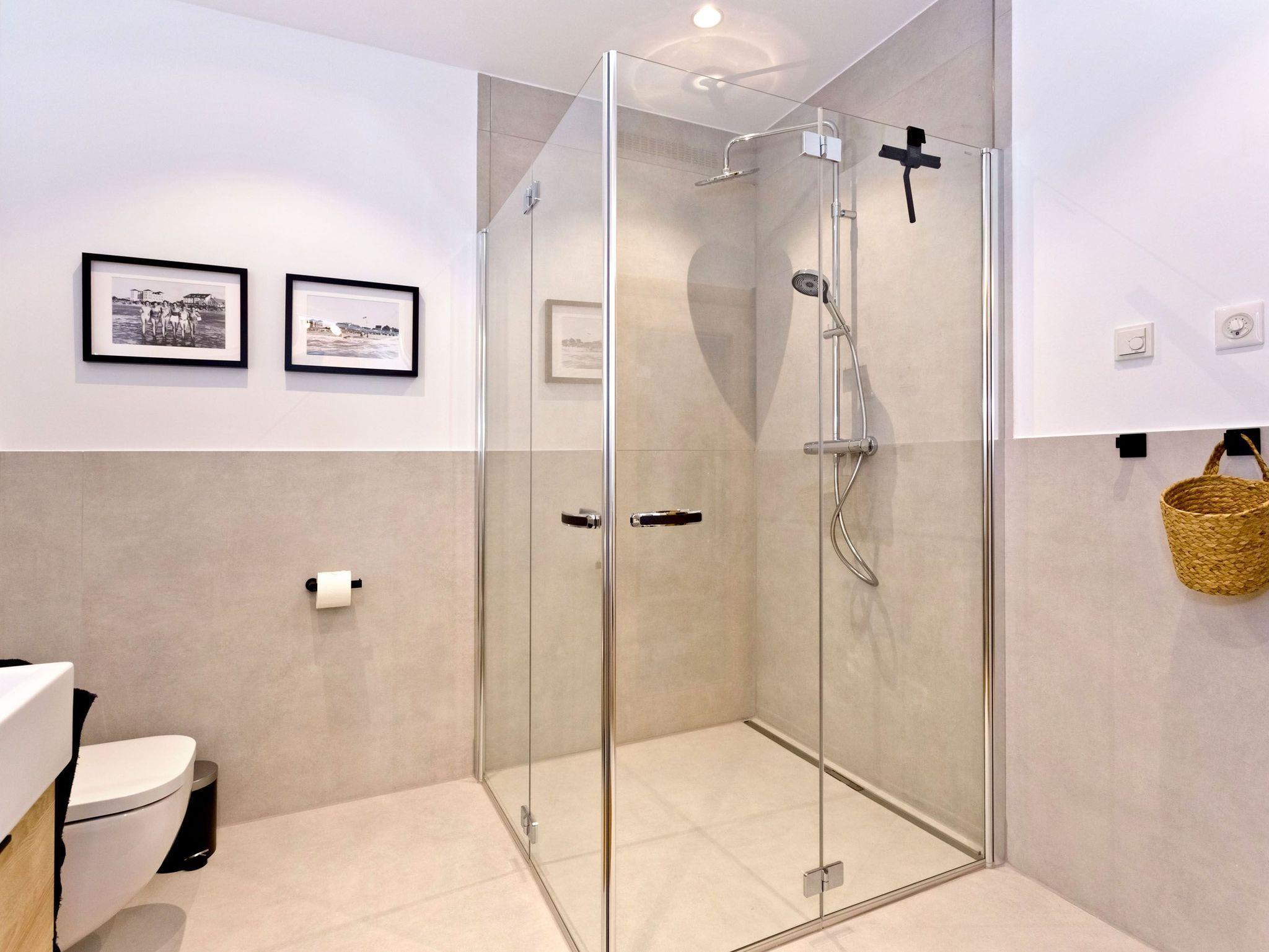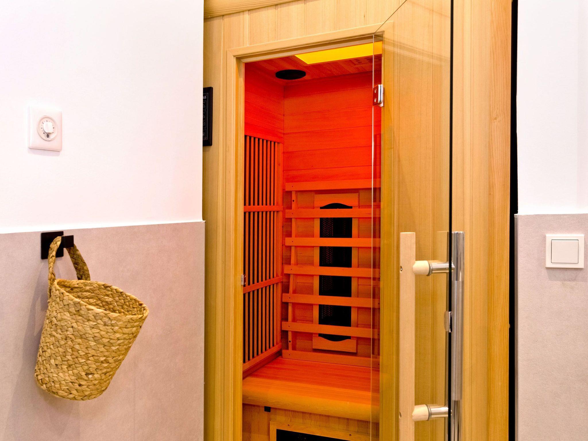 Großzügige, barrierefreie Dusche, WC und Infrarot-Sauna