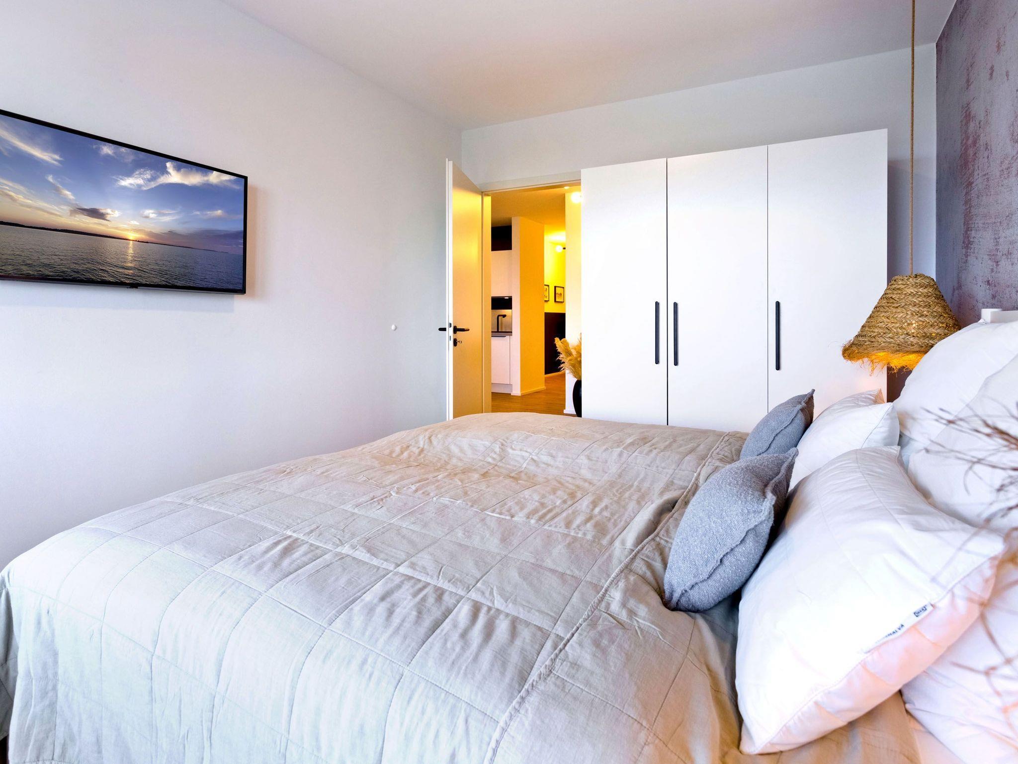 Schlafzimmer mit Doppelbett (2 x 0,90m), TV, Außenjalousien u. Plissees