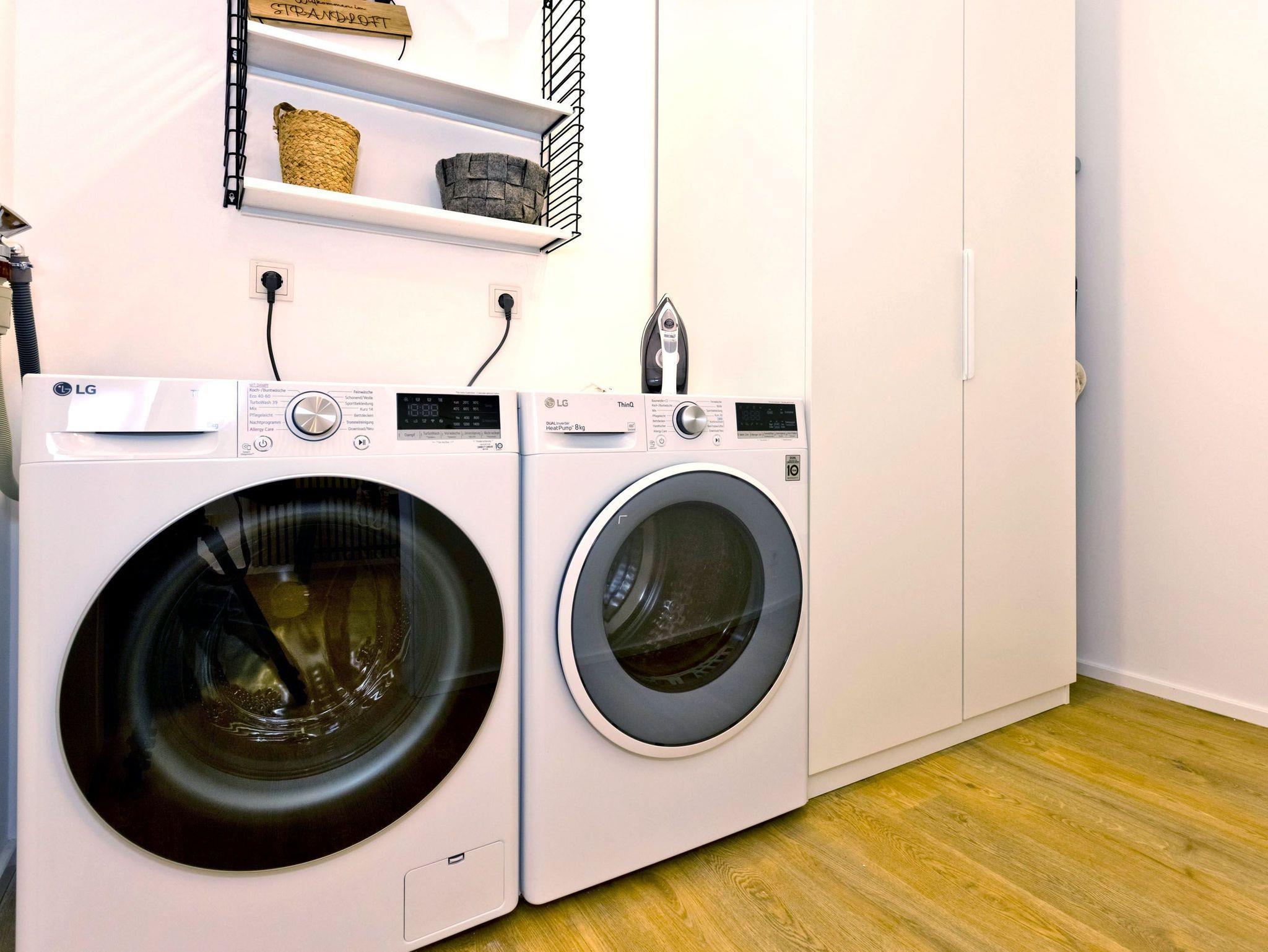 Hauswirtschaftsraum in der Wohnung mit eigener Waschmaschine und Trockner, Bügeleisen/Bügelbrett.