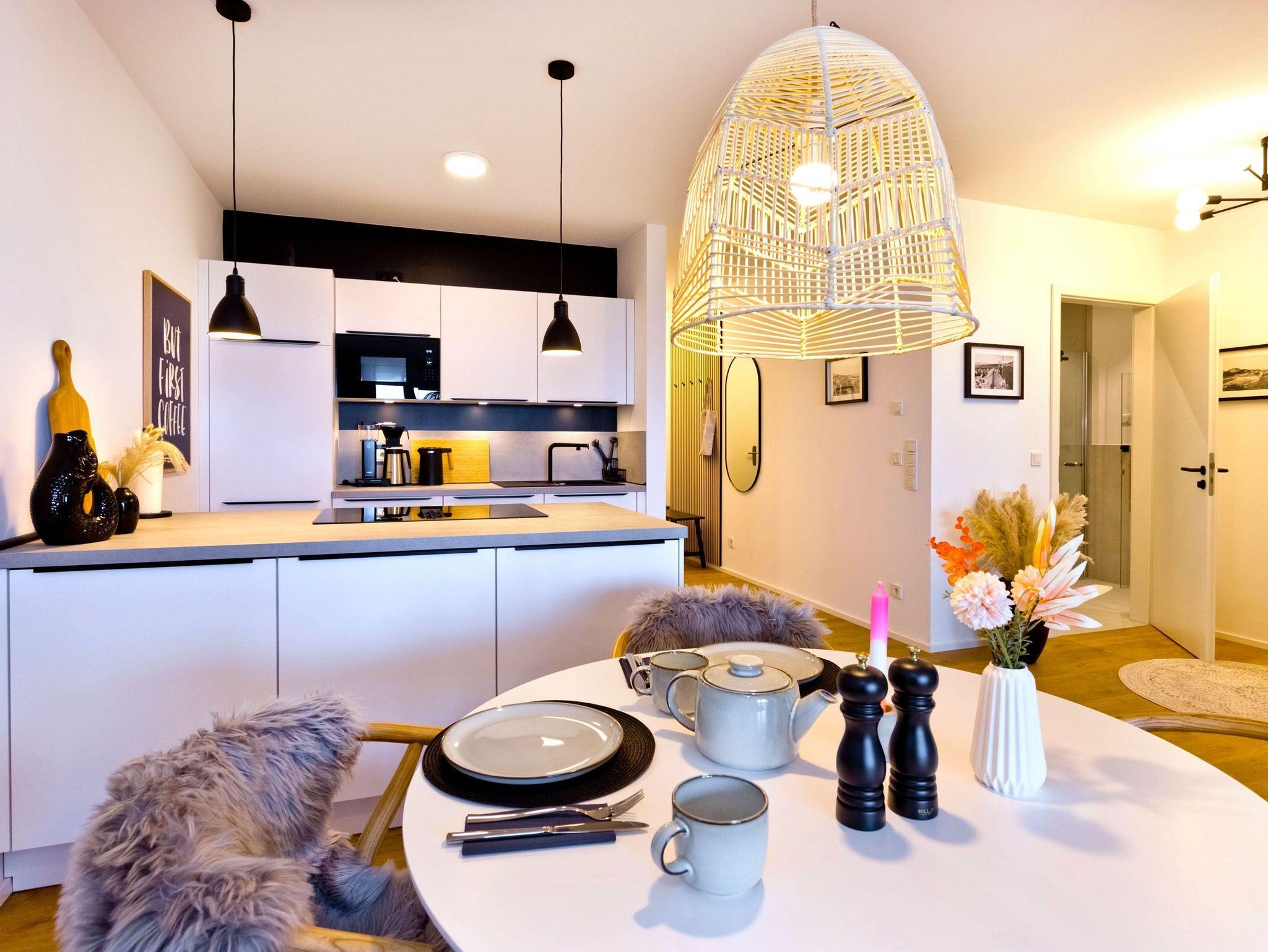 Vollausgestattete Küche (Geschirrspüler, Mikrowelle, Backofen, Induktionsherd, Dunstabzug) Kühlschrank mit Gefrierfach.