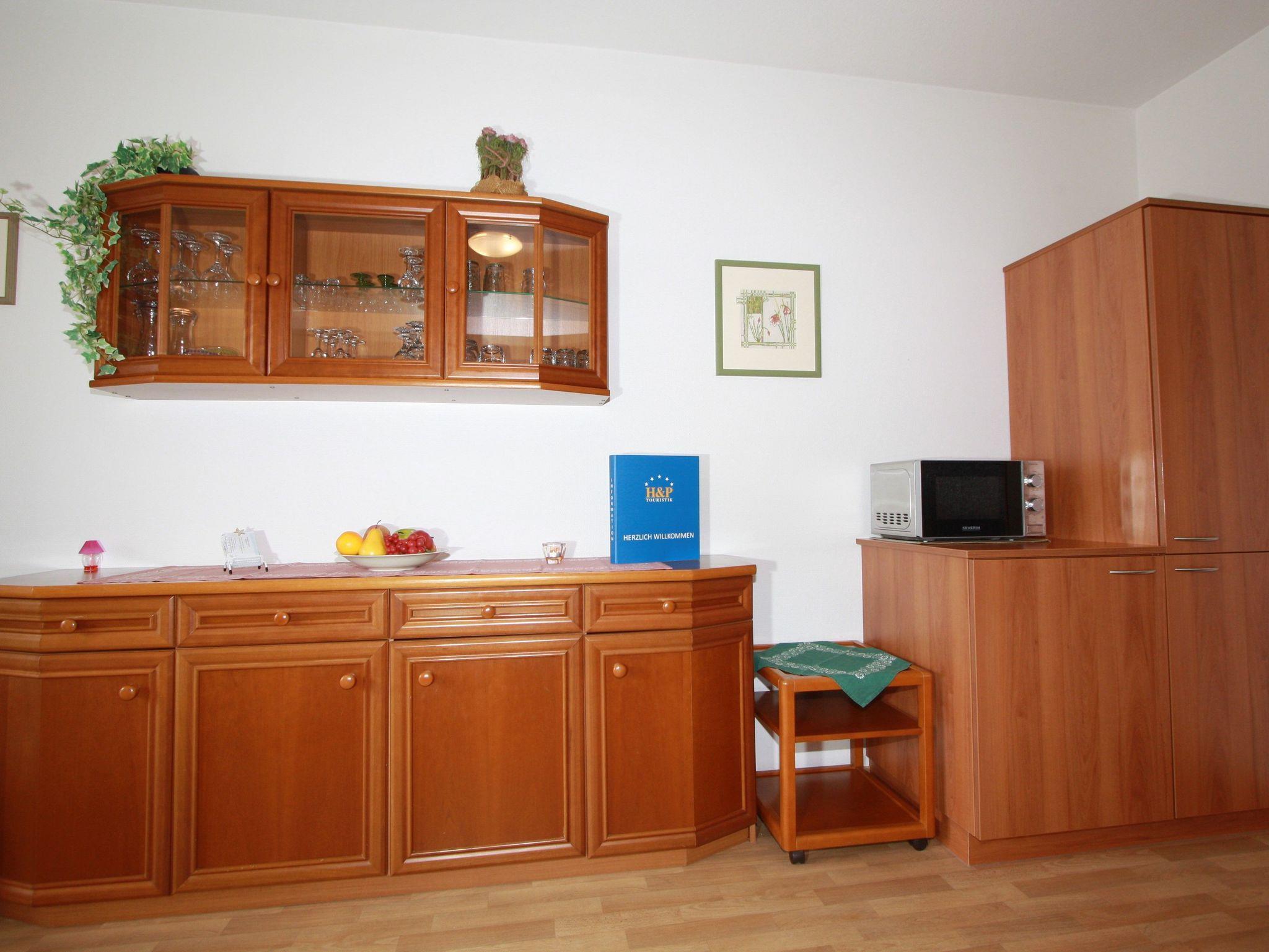 ausgestatteter Küchenbereich mit geräuscharmen Geschirrspüler, Herd mit Backofen, Mikrowelle,