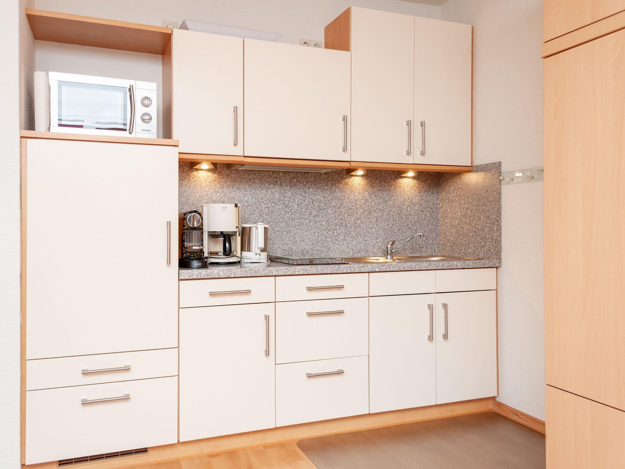 Das Apartment besteht aus einem Schlafzimmer mit 2 Einzelbetten, einem Wohnbereich mit zusätzlichem Schrankbett für 2 Personen und einem Badezimmer mit Dusche sowie WC. Die Ferienwohnung beinhaltet eine voll ausgestattete offene Küche.