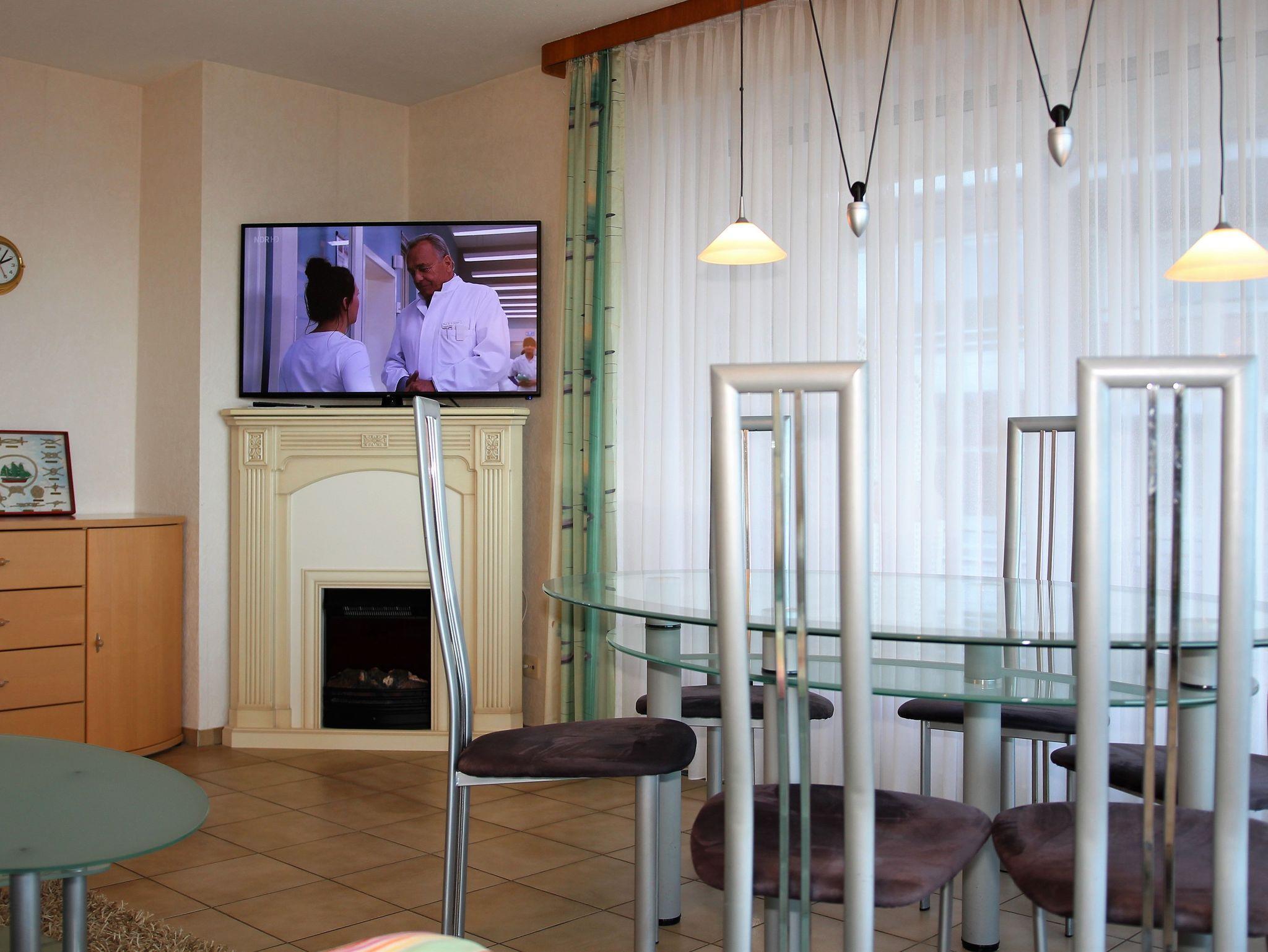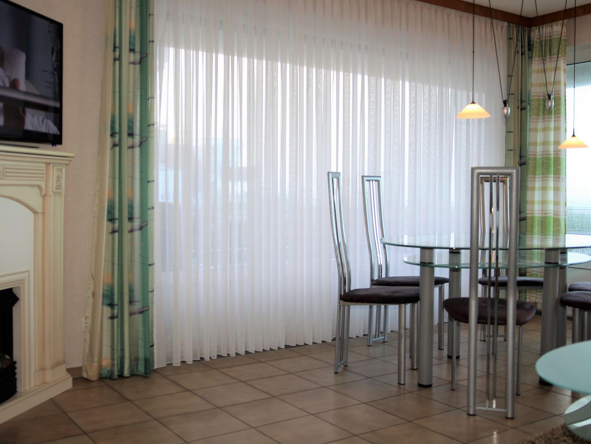 Die 3 Raum Ferienwohnung mit einer Größe von ca. 75 m² Wohnfläche ist komplett bis zu 4 Personen ausgestattet. 1 Schlafzimmer mit einem Doppelbett, Wohnzimmer mit Zugang zum Balkon (vom Wohnzimmer und Balkon aus können Sie teilweise/eingeschränkt auf die Nordsee blicken), Sofa (das auch als Schlafsofa genutzt werden kann), Esstisch, 1 Flatscreen TV, Einbauküche (Backofen, 4 Plattenherd, Wasserkocher, Toaster, Kaffeemaschine), 1xDusche mit WC, Waschmaschine und Trockner (jeweils kostenpflichtig mit Münzautomat), Nichtraucherwohnung, keine Haustiere, PKW Stellplatz direkt am Haus.