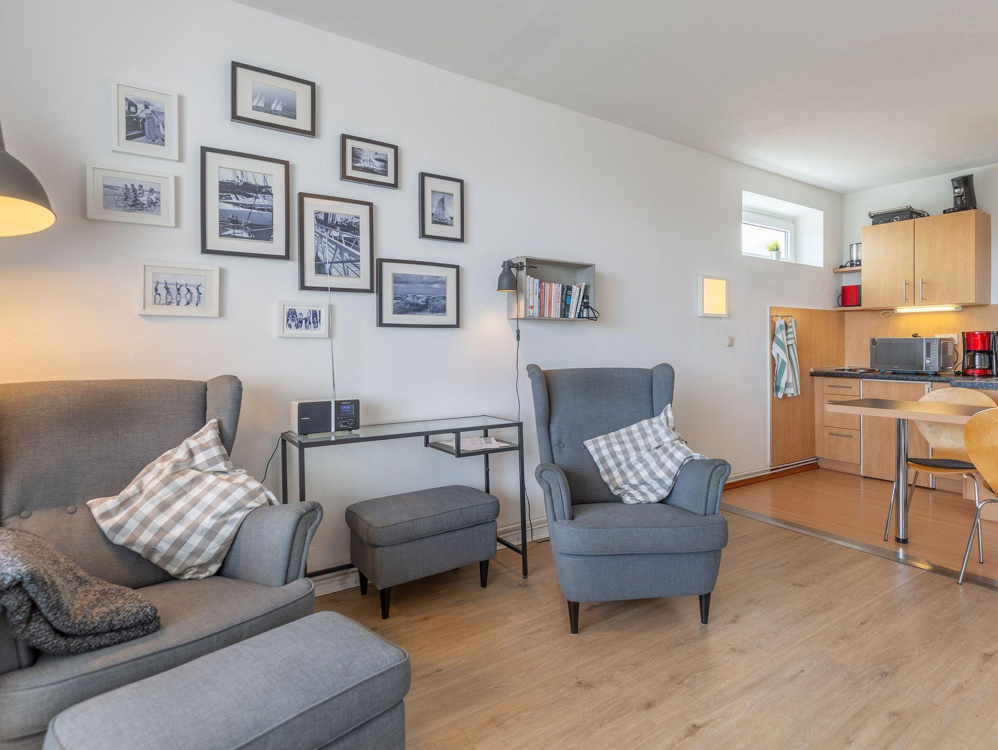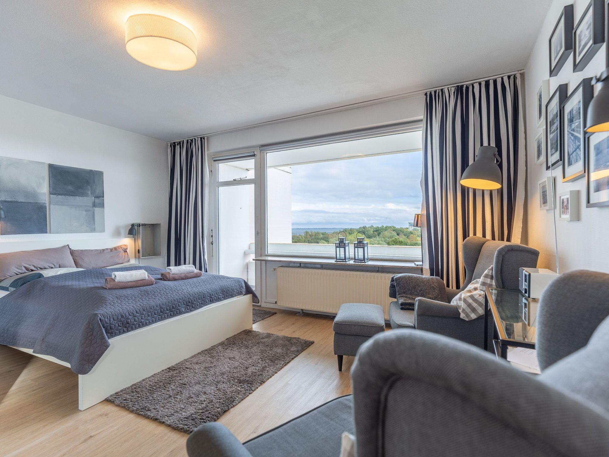 Die 32 m² Ferienwohnung bietet ausreichend Platz für 2 Personen. Der kombinierte Wohn- und Schlafbereich ist mit einem Doppelbett ausgestattet. Die beiden Relaxsessel gewährleisten, dass Sie sich entspannt zurücklehnen können, während Sie den faszinierenden Meerblick oder das Abendprogramm auf dem Flachbildfernseher genießen. Die integrierte Küche ist mit einem 2-Plattenkochfeld, einem Sandwich Toaster sowie einem Kühlschrank mit Gefrierfach ausgestattet. Ferienwohnung 612 verfügt über ein modernes Bad mit Dusche und WC. Während Ihres Urlaubs steht Ihr Auto sicher in der zugehörigen Garage.