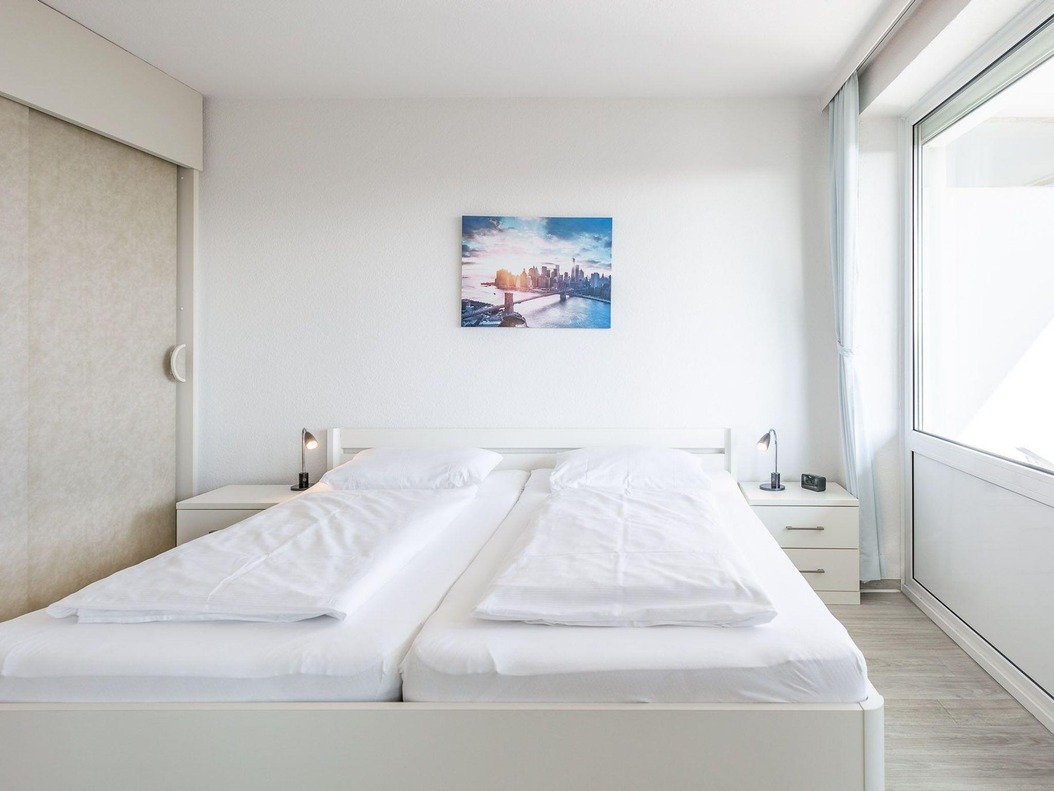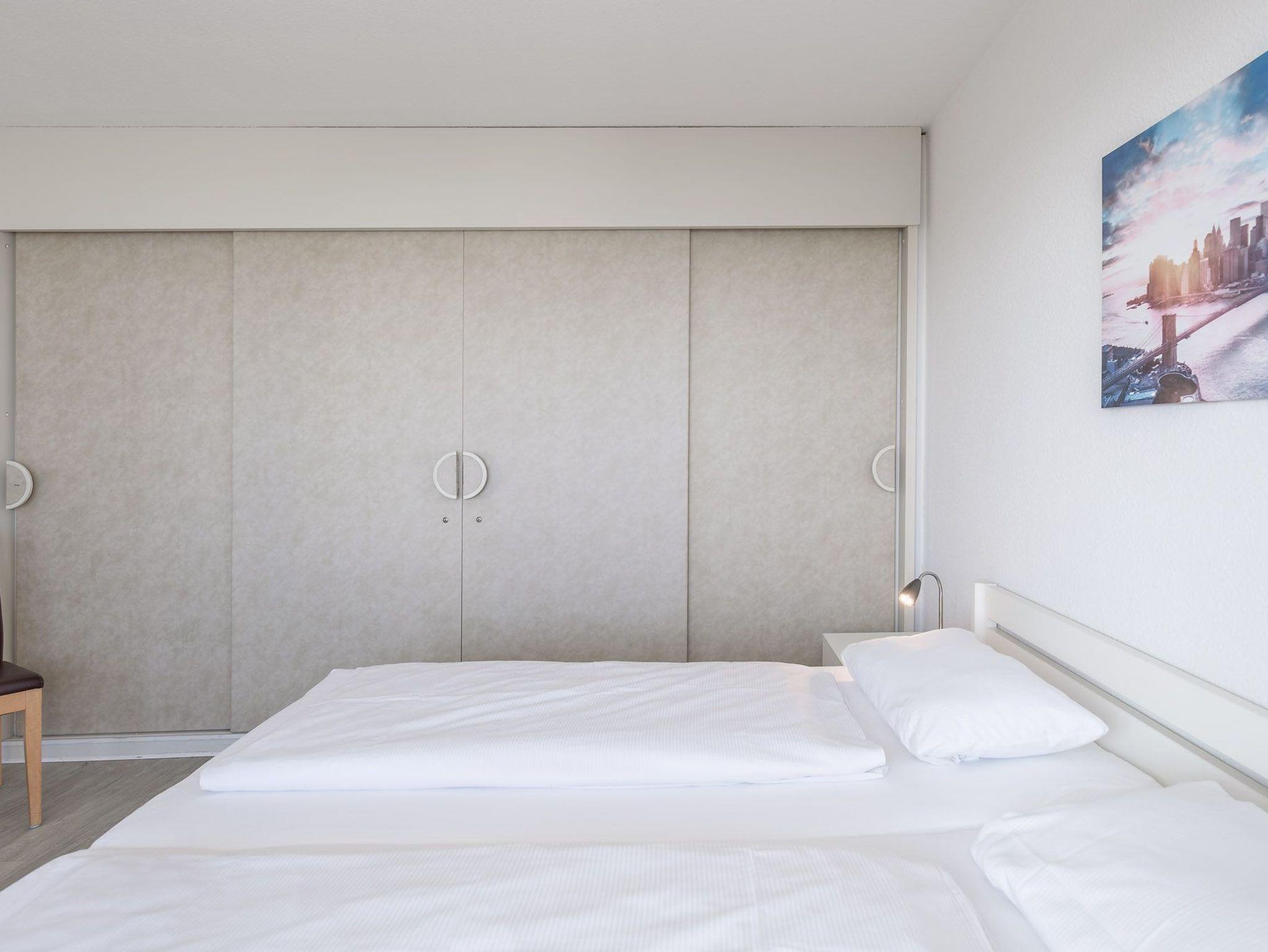 Die 2-Zimmer Ferienwohnung bietet 2 Personen auf 55 m² genügend Raum für behagliches und erholsames Wohnen. Ferienwohnung 509 bietet den Komfort eines separaten Schlafzimmers. Das große Doppelbett (2x100x200) in rückenschonender Komfortliegehöhe gewährleistet einen erholsamen Schlaf. Dank elektrischer Außenjalousien werden Sie nicht von der Morgensonne geweckt.