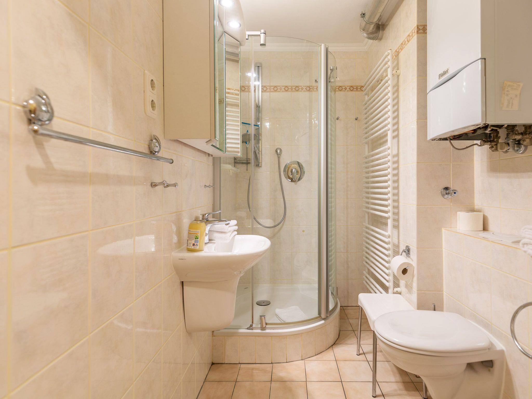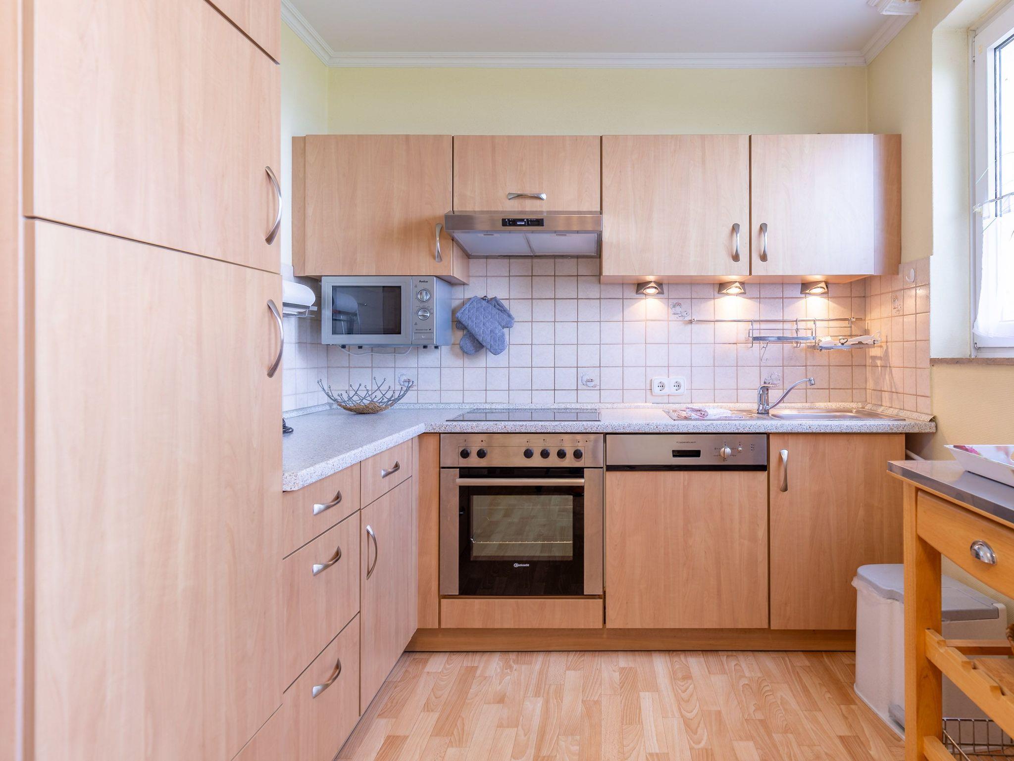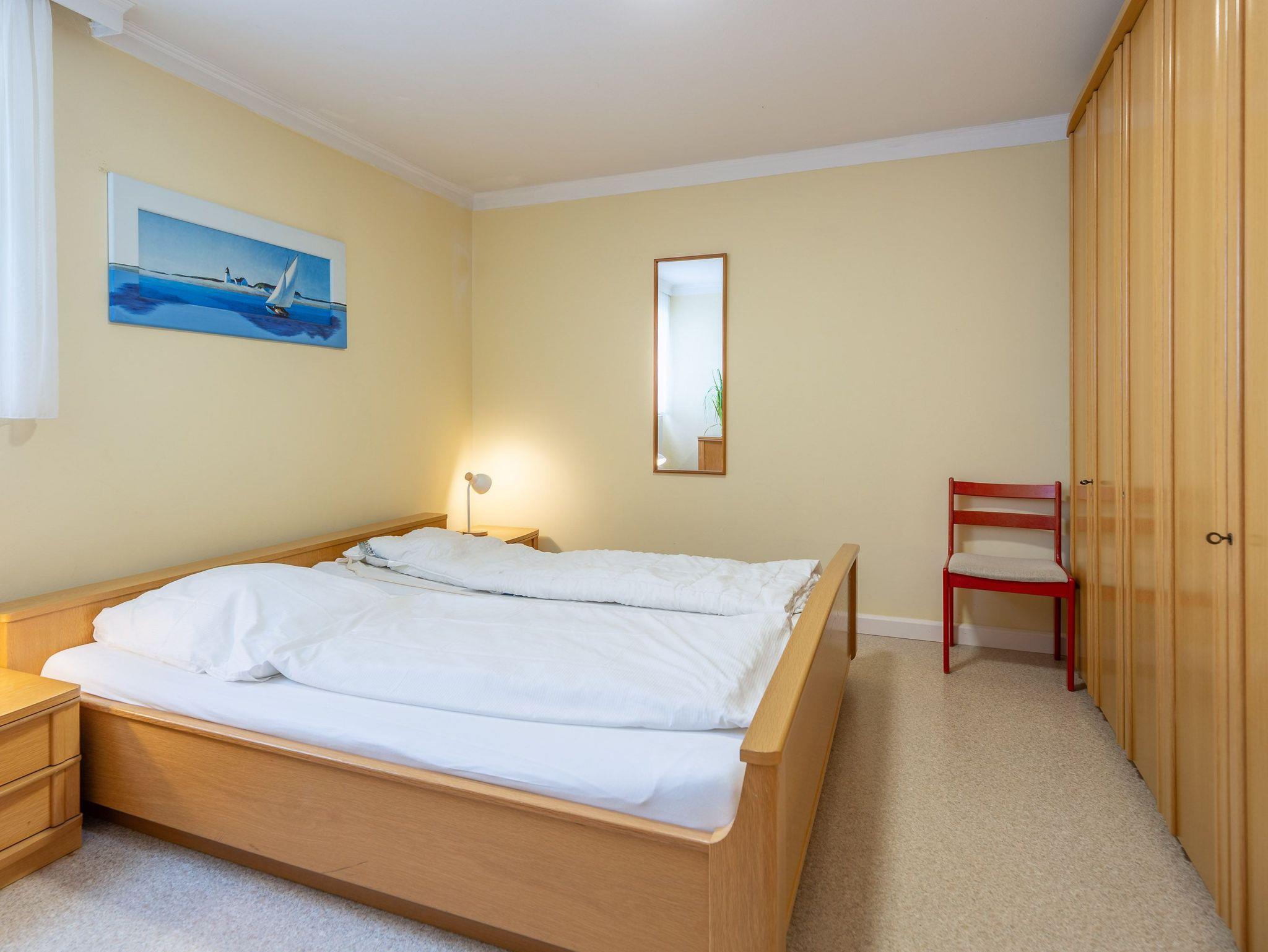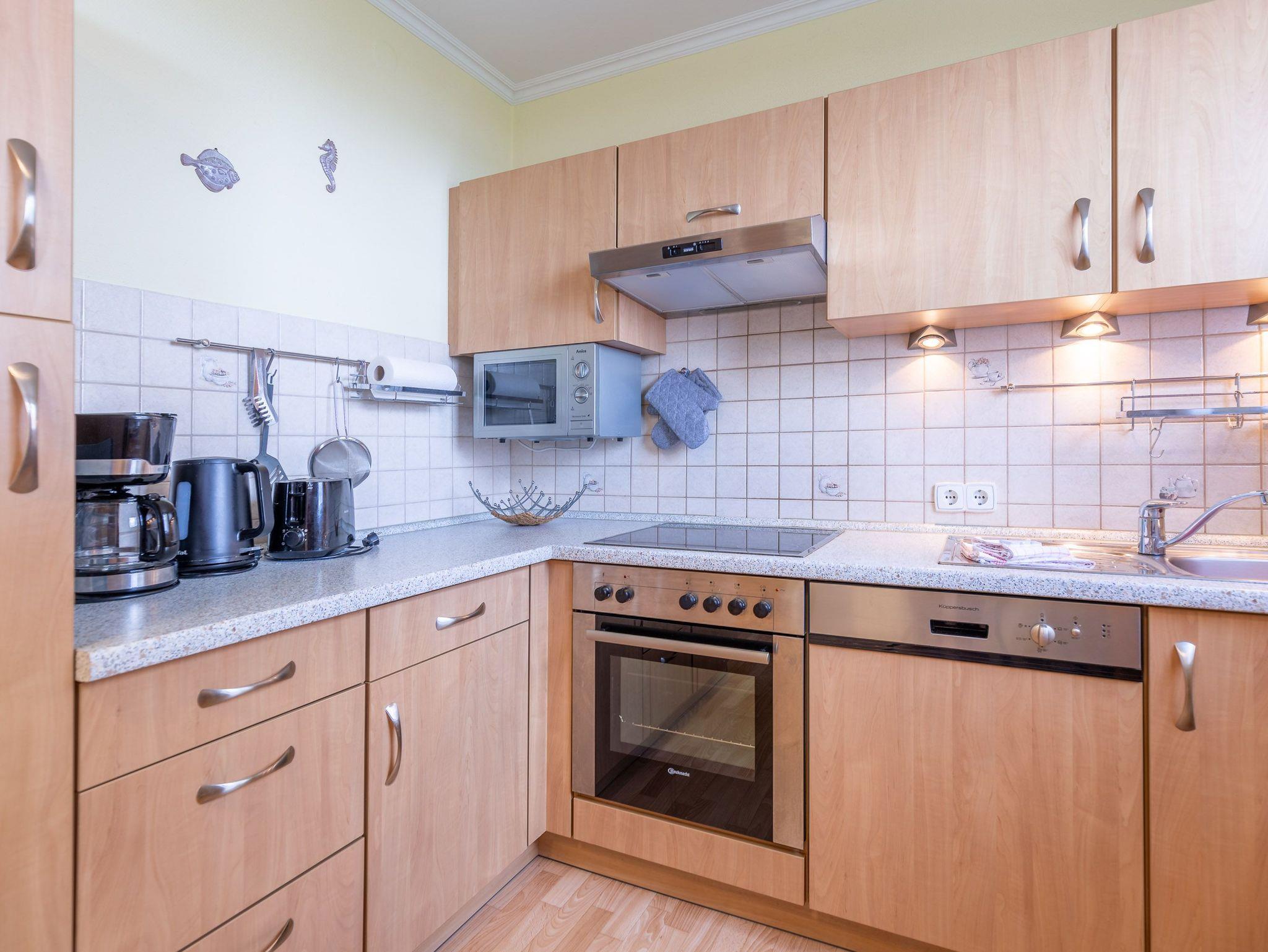 In den beiden Schlafzimmern garantieren ein Doppelbett (2x90x200) sowie zwei Einzelbetten (90x200) erholsame Nächte. Besonders angenehm für Familien mit Kindern oder auch befreundete Paare. Vorhänge sorgen für einen ungestörten Schlaf. Ein gemütliches Ecksofa sowie ein Relaxsessel mit elektrisch verstellbarer Rückenlehne und Fußablage laden zum entspannten Verweilen ein. Die separate Küche mit Fenster bietet alles, was Selbstversorger benötigen: Backofen, 4-Platten-Herd, Geschirrspüler, Kühlschrank mit Gefriermöglichkeit, Kaffeemaschine, Wasserkocher, Toaster und vieles mehr. Das Badezimmer ist mit Dusche und WC ausgestattet. Der Wohnung ist ein eigener KFZ-Stellplatz zugeordnet.