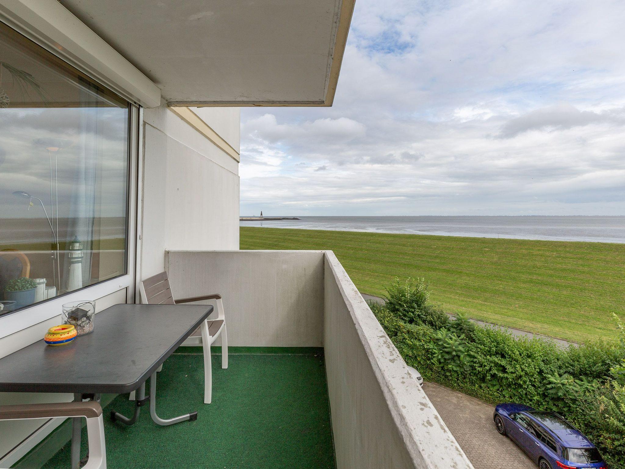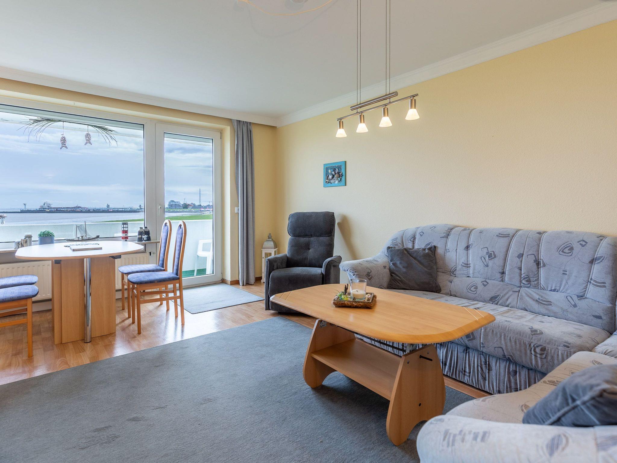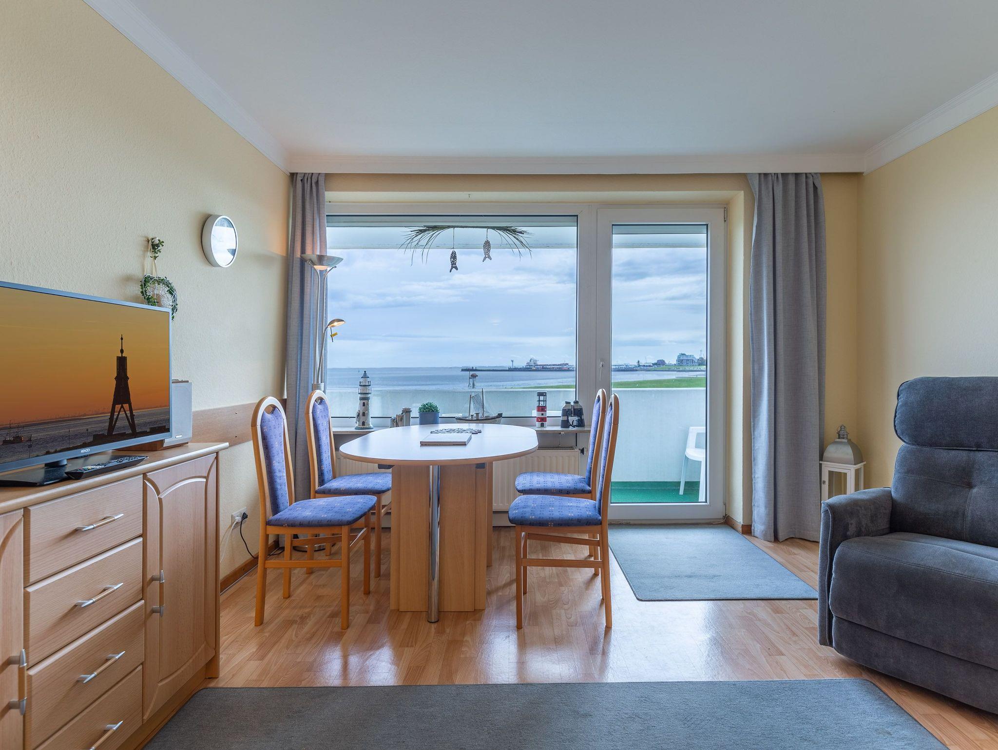 Genießen Sie entspannte Urlaubstage in unserer hellen 3-Zimmer-Ferienwohnung mit traumhaftem Meerblick. Sie ist ideal für Familien oder Großeltern mit Enkelkind. Dank der großzügigen Aufteilung mit zwei separaten Schlafzimmern findet hier jeder seinen persönlichen Rückzugsort. Die Eckwohnung ist eine echte Rarität. Aus dem 3. Obergeschoss genießt man neben dem Blick auf den Schifffahrtsweg auch den Blick auf die Kugelbake. Schon beim allmorgendlichen Frühstück können Sie den regen Schiffsverkehr beobachten. Für Unterhaltung sorgen ein Flachbild-TV sowie kostenfreies WLAN.