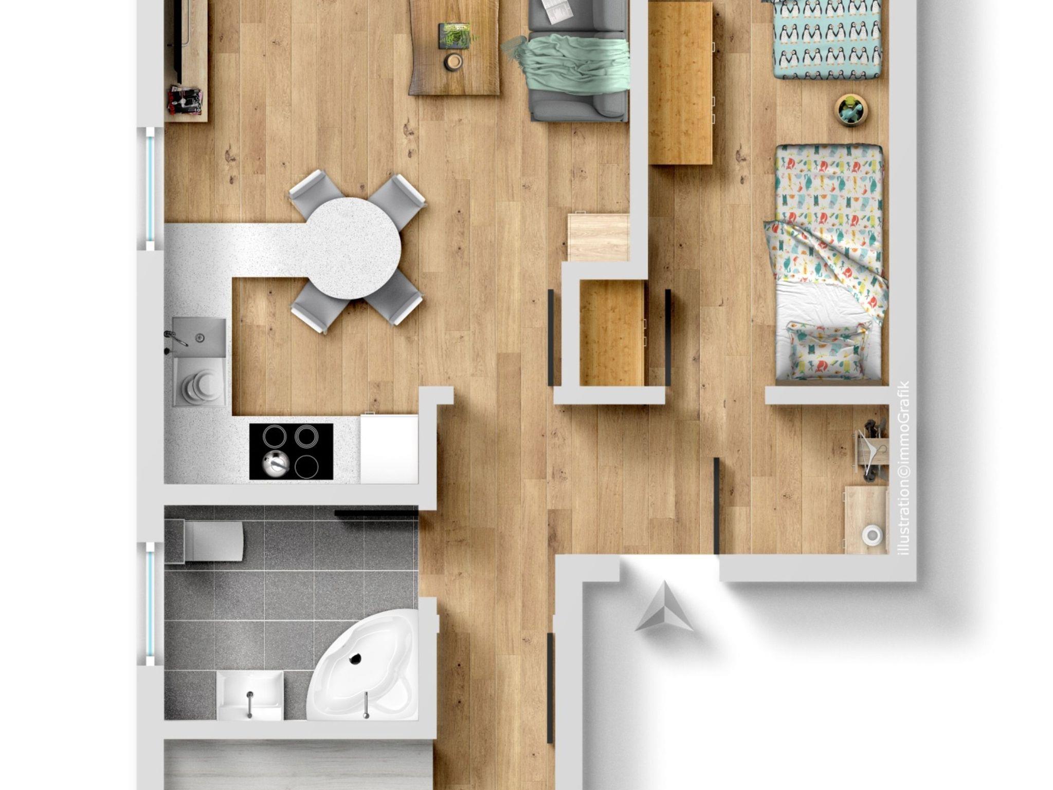 Der Wohn-, Ess- und Küchenbereich bildet das Herzstück der Wohnung ein heller, einladender Raum, der genügend Platz für gemeinsame Stunden bietet. Durch die Fensterfront und den Zugang zum Westbalkon entsteht ein wohnliches Ambiente, das sich sowohl für entspannte Abende als auch für gemütliche Mahlzeiten eignet.