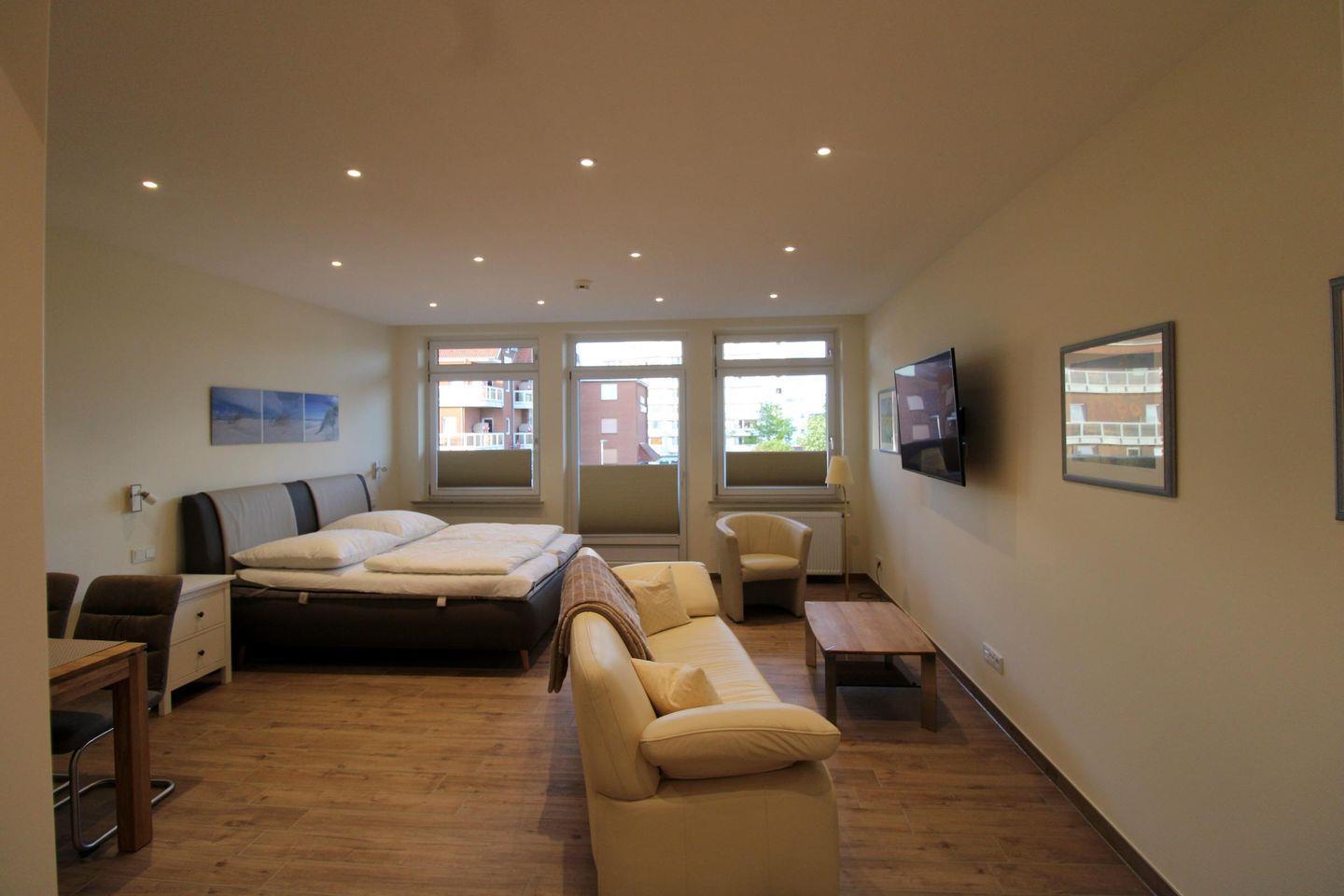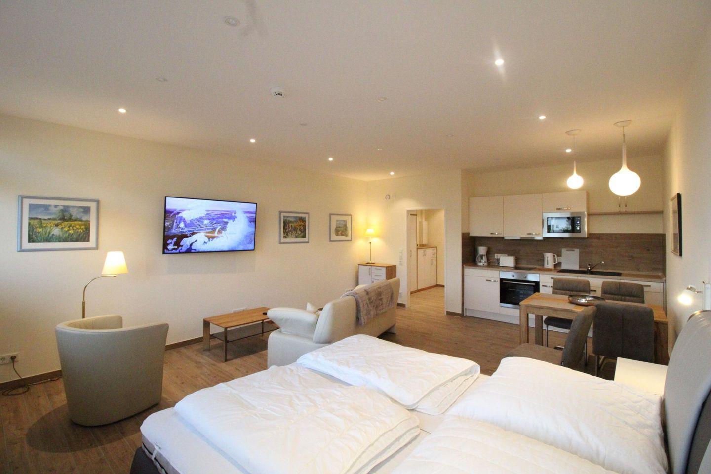(ca. 49 qm) mit kombinierten Wohn-Schlafraum für max. 2 Personen. Sie verfügt über eine komplett ausgestattete Küchenzeile, eine Essecke, eine Fernsehecke mit Polstermöbel, einen