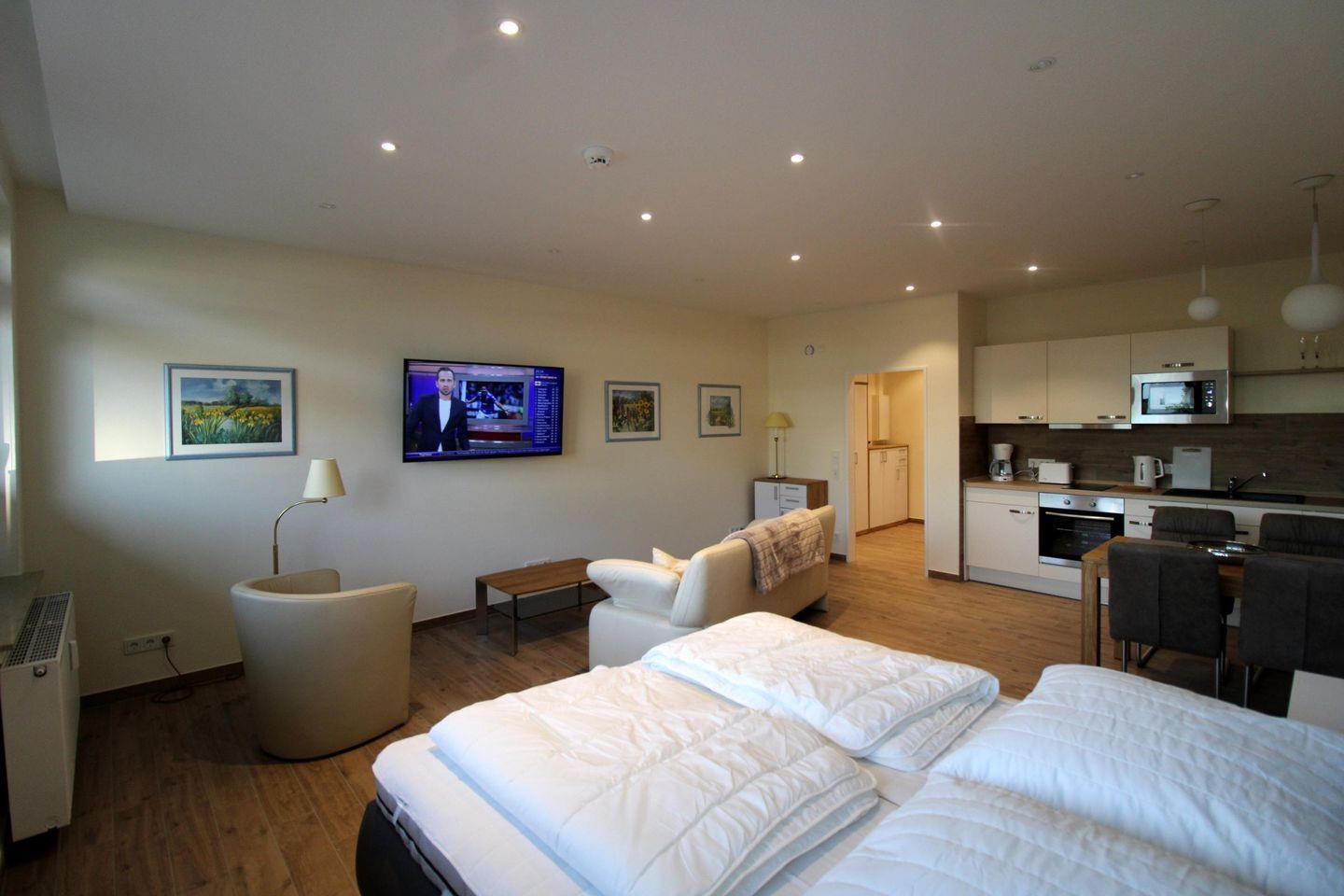 LCD-Fernseher sowie ein Qualitätsbett mit hochwertigen Matratzen.