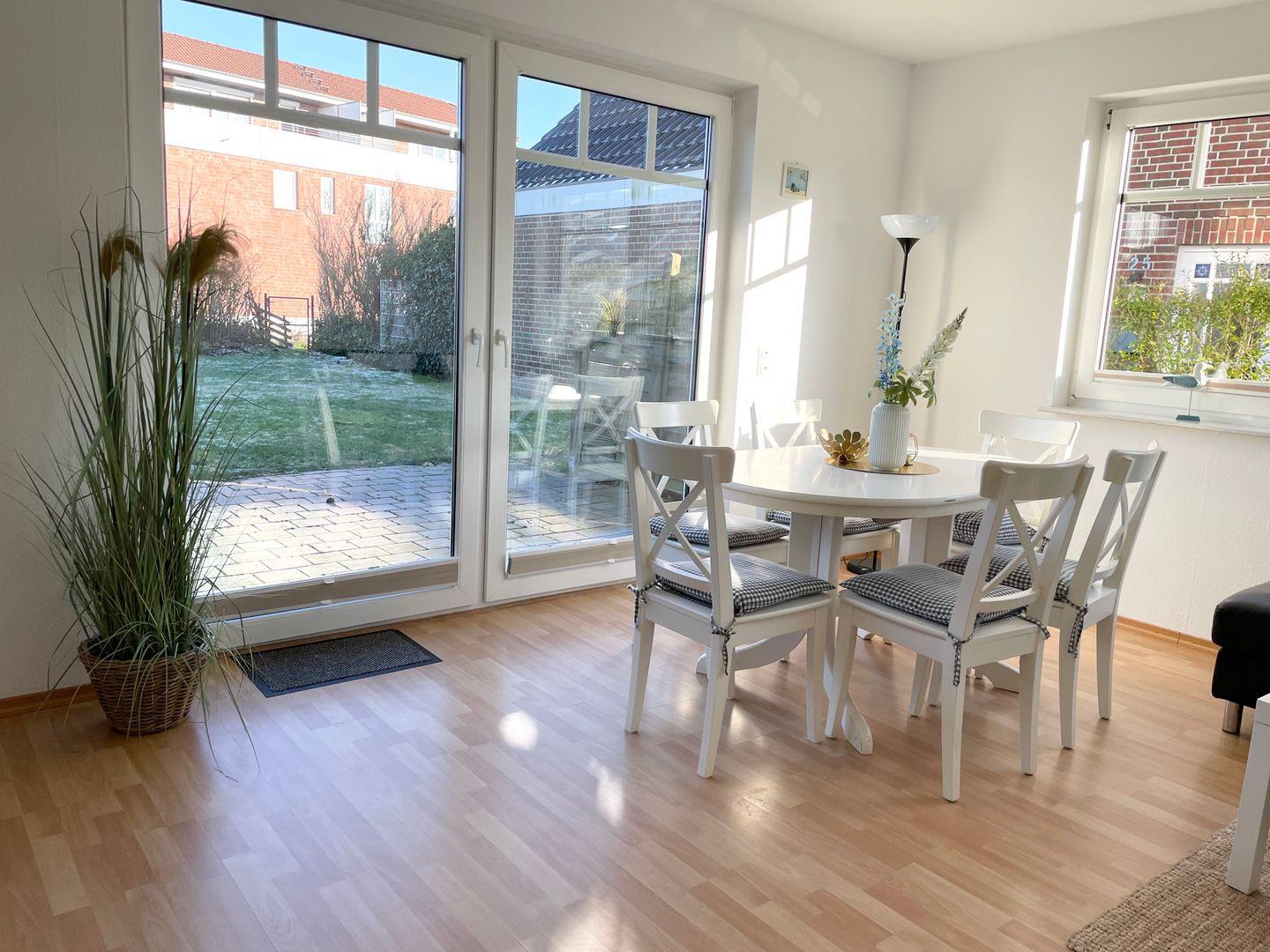 Die möblierte Terrasse mit großzügigem, eingezäunten Garten erreichen Sie vom Wohnzimmer aus.
