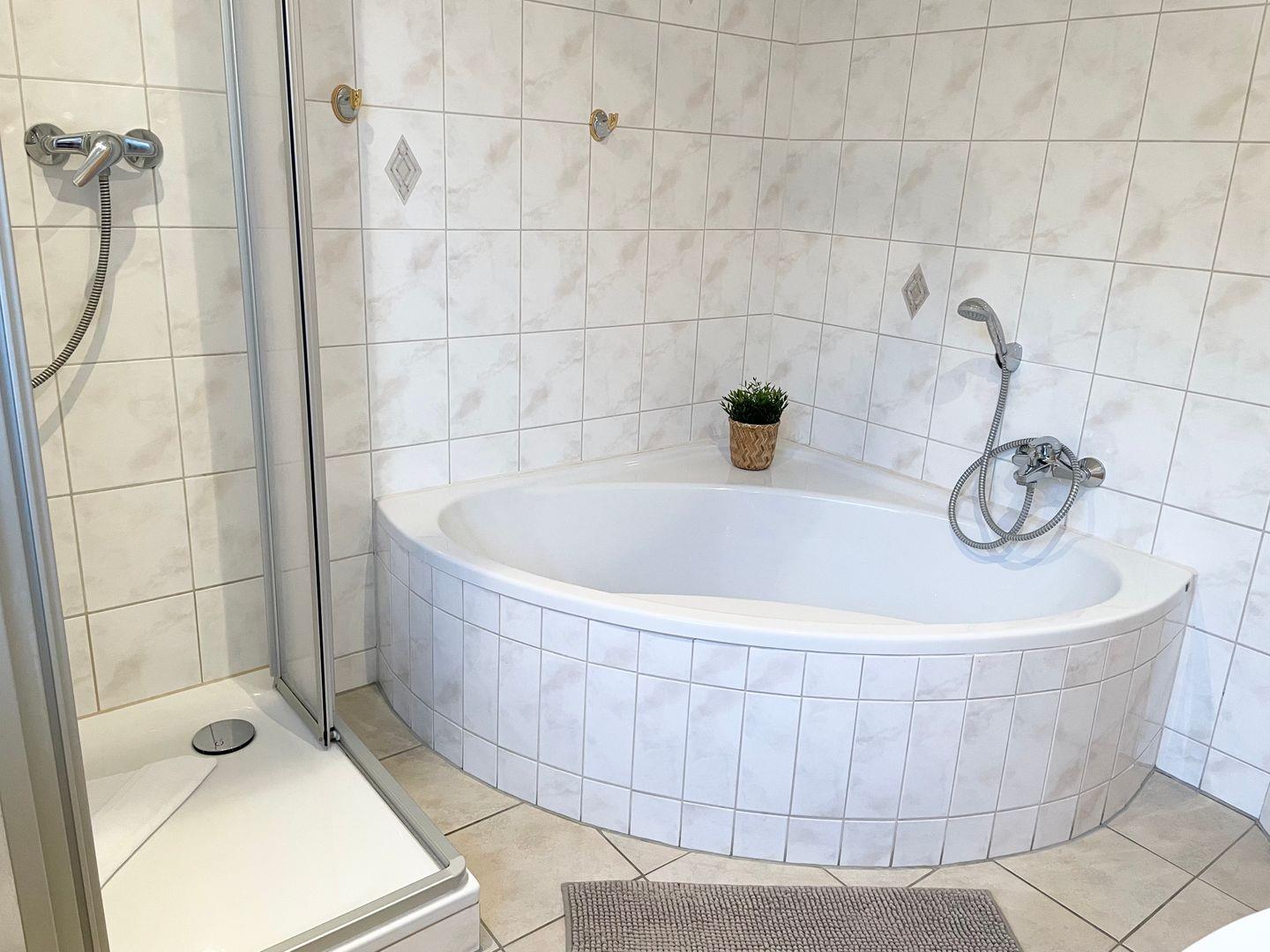 Das Badezimmer besticht mit einer schönen Eckbadewanne und einer Duschkabine.