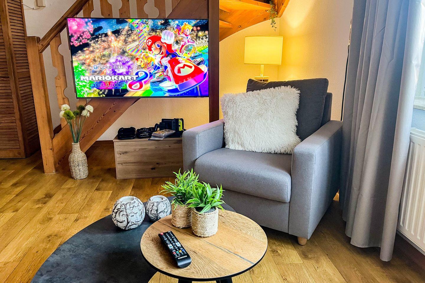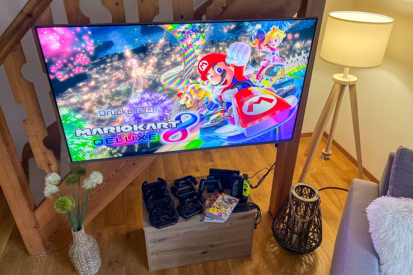 Das Fernsehprogramm wird über Internet via MagentaTV empfangen. Nach dem Einschalten der TV-Geräts einfach die MagentaTV-App aufrufen – schon stehen Ihnen alle gängigen Kanäle zur Verfügung. Die Spielekonsole Nintendo Switch ist besonders bei Schietwetter bei Groß und Klein sehr beliebt.