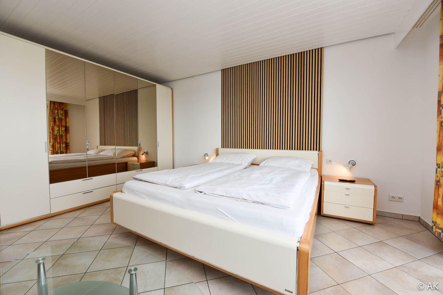 Die Wohnung ist aufgeteilt in einen offenen Wohn-, Ess- und Küchenbereich sowie zwei Schlafbereiche mit je einem Doppelbett. Der vordere Schlafbereich bietet besonders viel Platz und ist zusätzlich mit einer Couch und einem zweiten Fernseher ausgestattet – ideal für Paare oder Familien, die Wert auf Komfort und Rückzugsmöglichkeiten legen. Die moderne Einbauküche mit Geschirrspüler bietet viel Raum für gemeinsame Mahlzeiten. Das Bad ist mit Dusche und WC ausgestattet.
