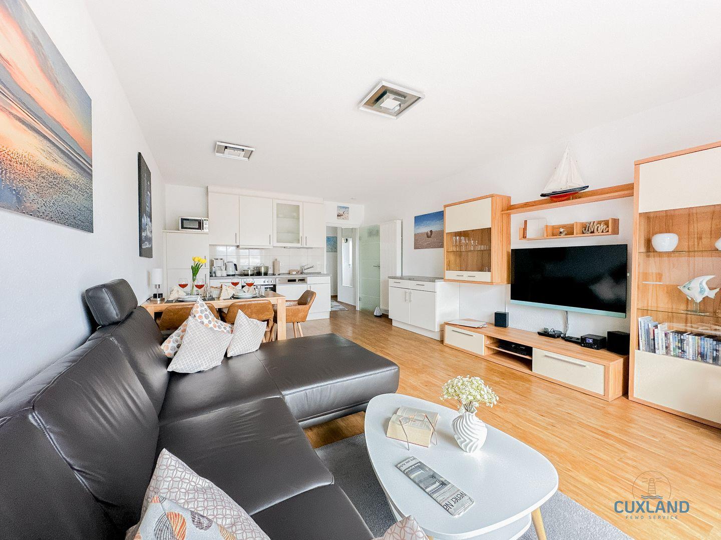 - Der helle Wohnbereich lädt mit Sofaecke und Sessel zum entspannen ein. Ein TV-Gerät sowie ein Radio sorgen für Unterhaltung. Die offene Gestaltung verleiht dem Raum eine angenehme Wohnatmosphäre.