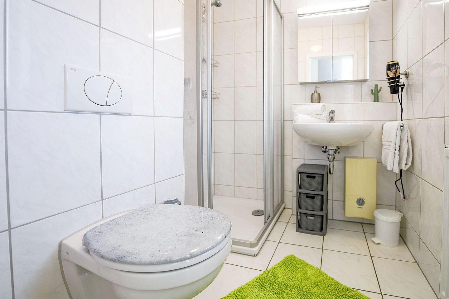 Zur Ausstattung gehören zwei Fernseher, kostenfreies WLAN sowie ein eigener PKW-Stellplatz direkt am Haus. Ein besonderes Highlight ist der Balkon im 2. Obergeschoss mit Blick ins Grüne und Richtung Meer – ideal zum Entspannen nach einem Strandtag.