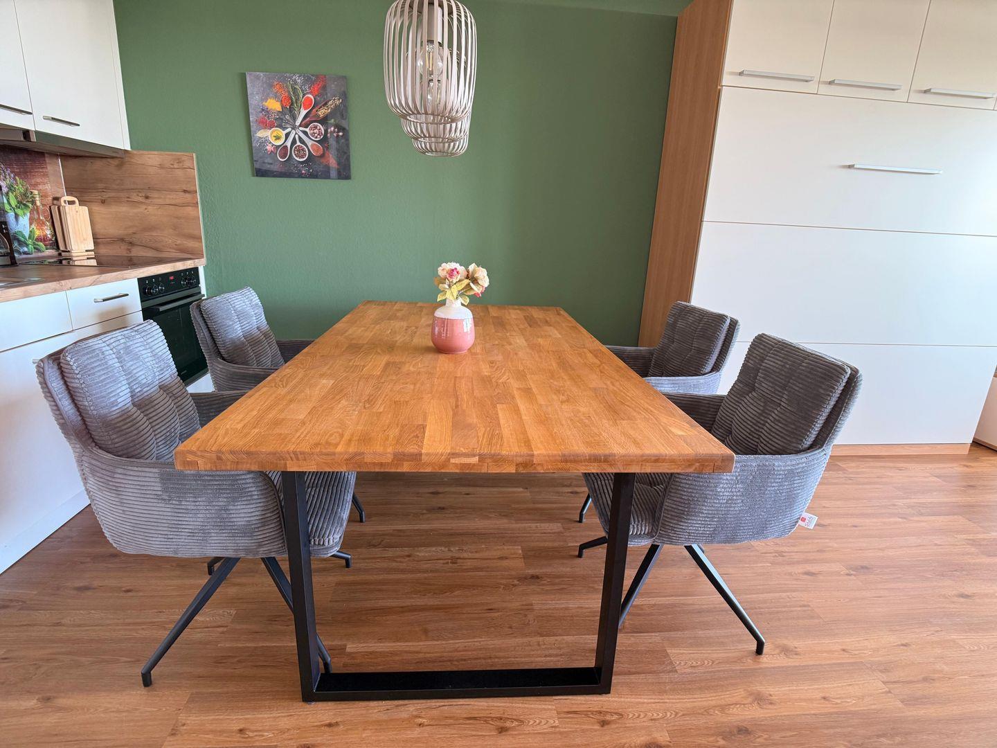 Die Wohnung hat ein schickes Duschbad, eine schöne Küchenzeile mit großen Esstisch, ein gemütliches Sofa
