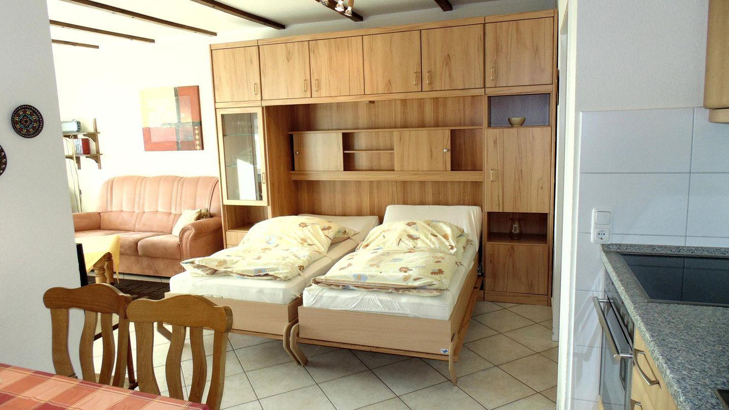 Die Ferienwohnung Nr.80 im 5.OG.48qm mit Blick zur Elbeinfahrt hat einen Schlafraum mit 2 Einzelbetten und ein Schrank-Doppelbett mit Federkernmatratzen.