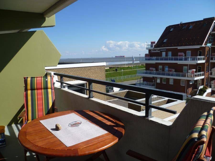 Vom gut möblierten Balkon hat man eine seitliche Seesicht über den Deich zur See. Die Küche ist mit allem notwendigen ausgestattet, auch Geschirrspülmaschine,