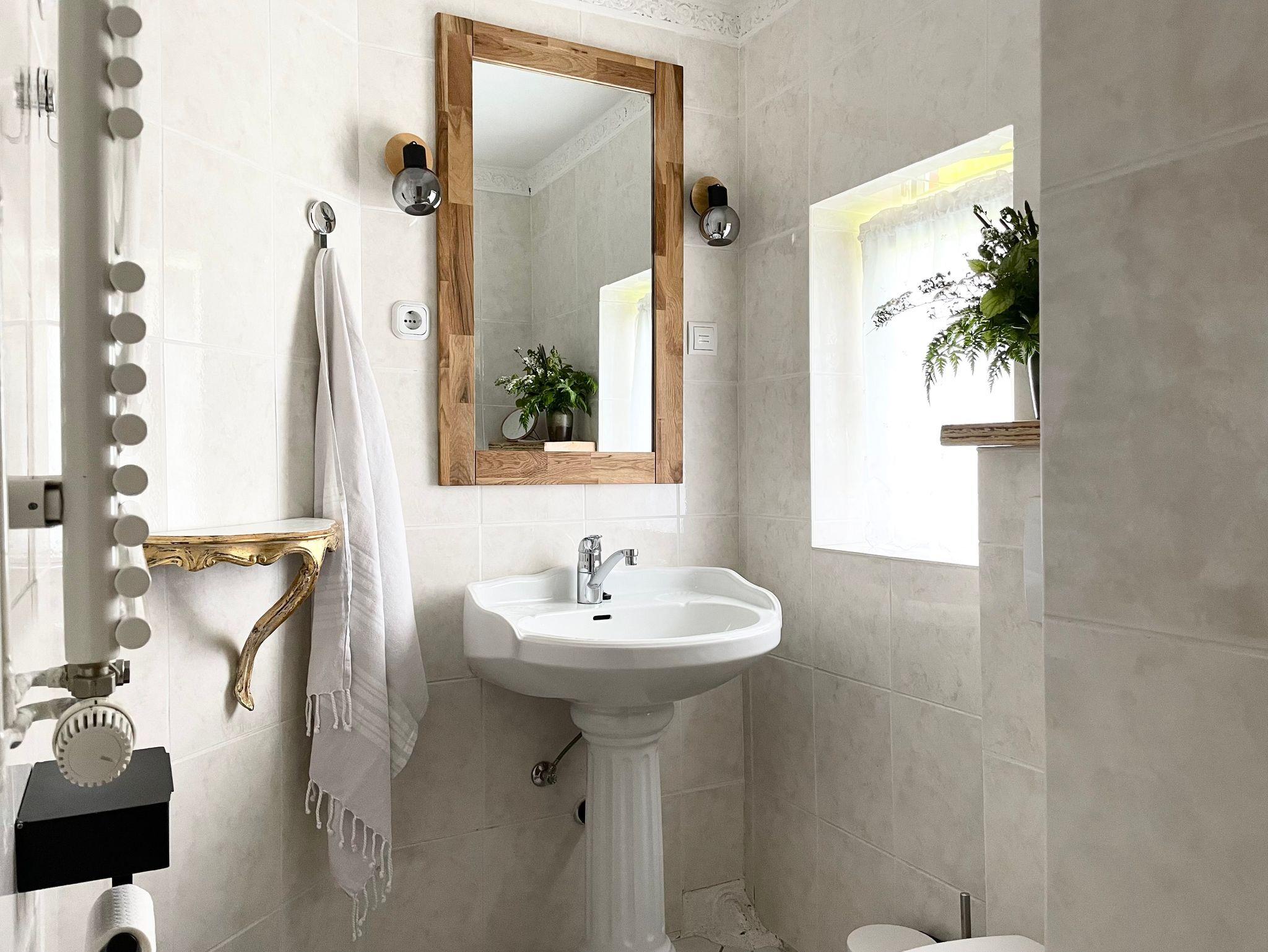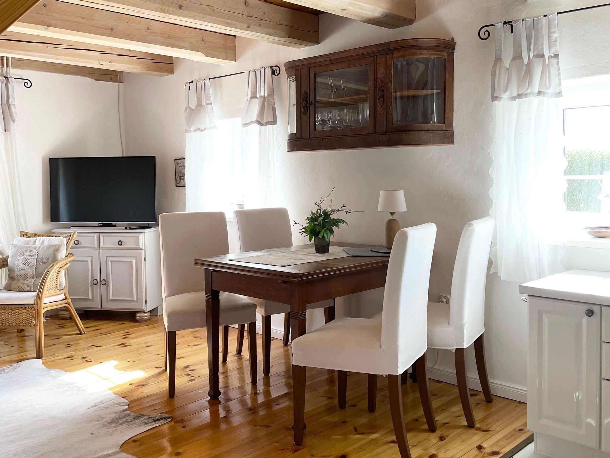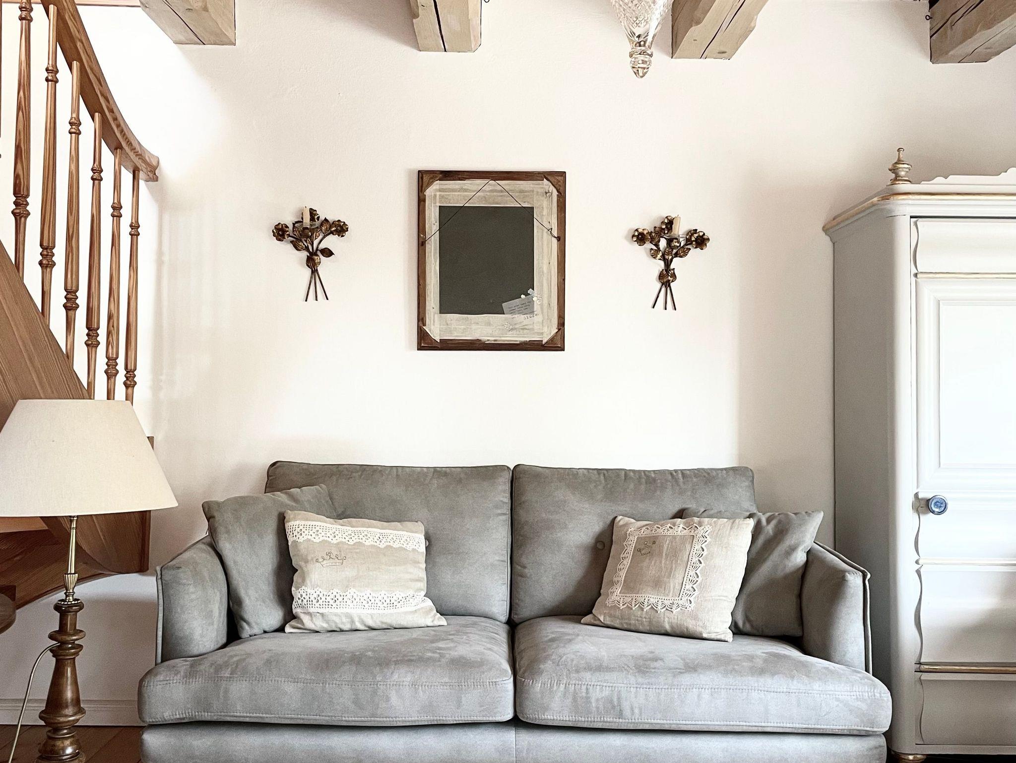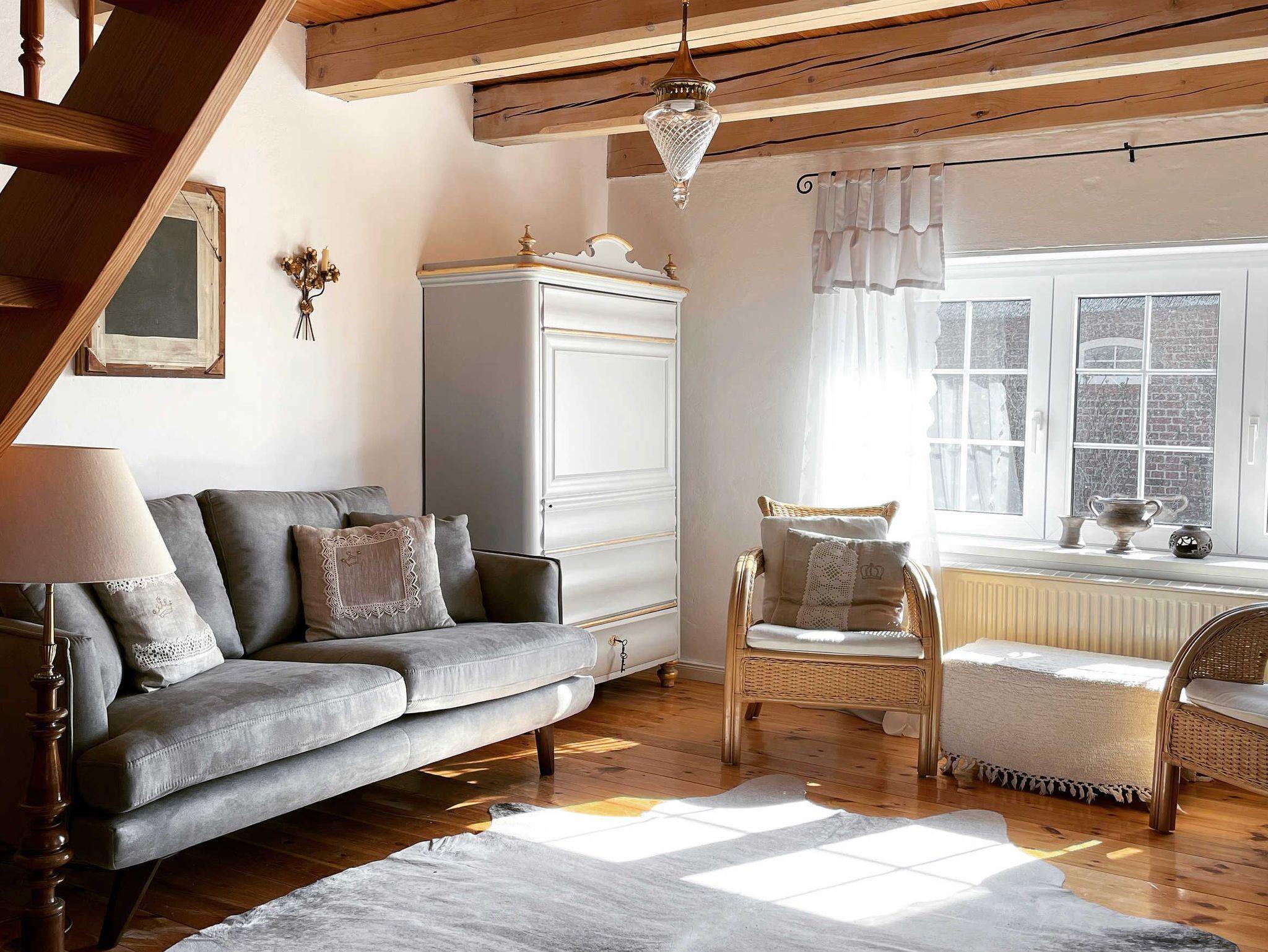 Die ersten Versicherungsunterlagen stammen aus dem Jahr 1820, das größere Haus ist also mindestens 200 Jahre alt. Immer wieder umgebaut und angebaut, blieben unverändert niedrige Deckenhöhe, schiefe Türzargen und lehmverputzte Wände in der 70 m2 Wohnung als stille Zeitzeugen…