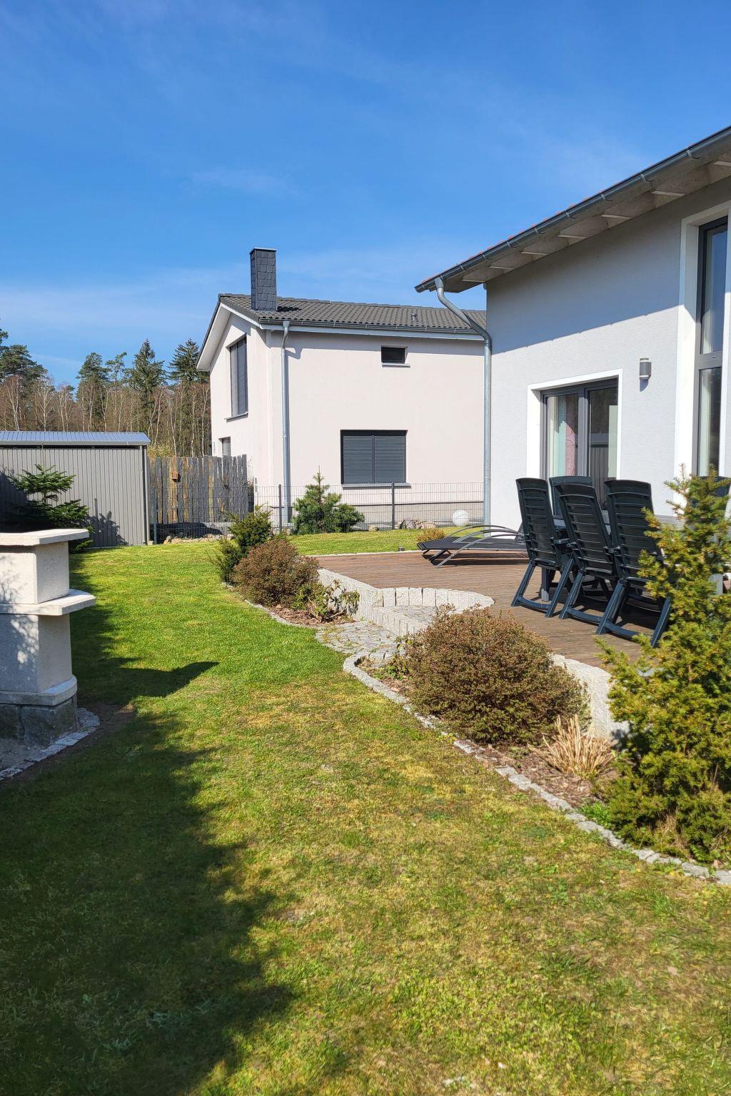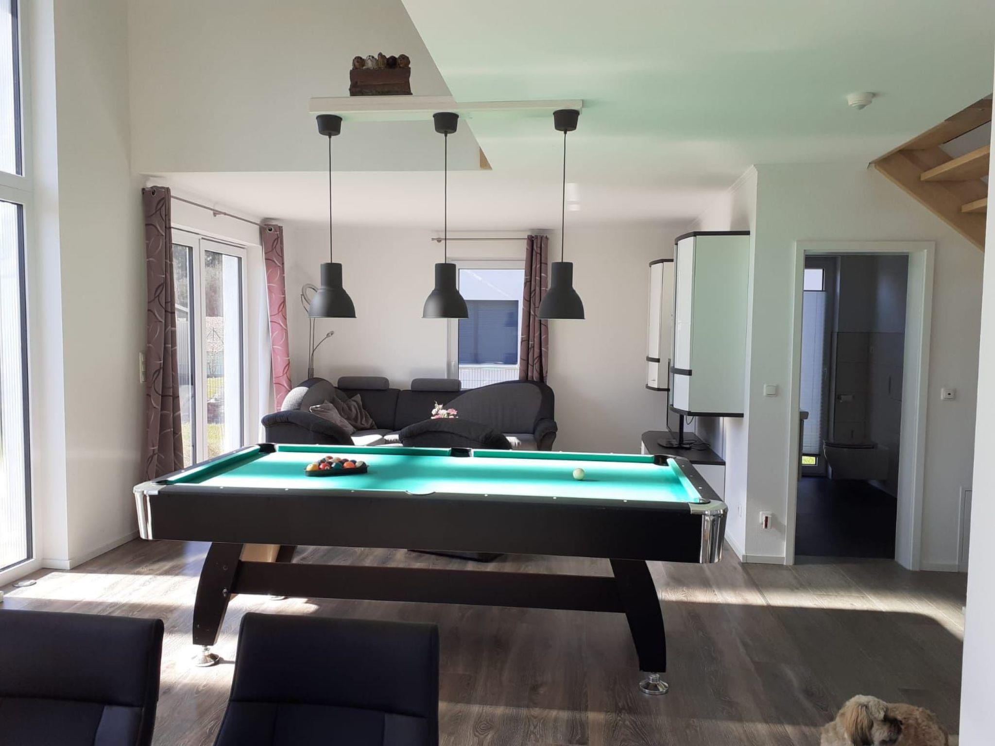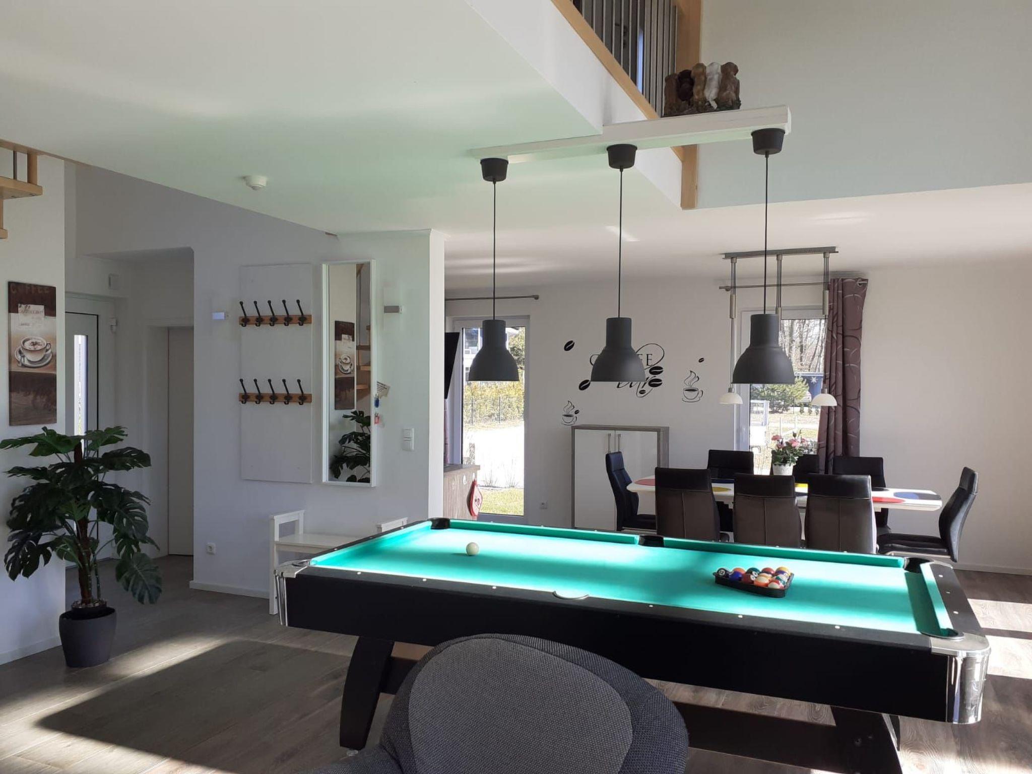 The holiday home Vanessa is located in Mecklenburg, in the holiday village Dümmer See with approx. 80 houses. The holiday village is fenced in and secured by an electrically operated gate. The path from the house to the lake (bathing area with a small sandy beach) is approx. 100 metres. The boat and fishing jetties are also located there. The holiday home is newly built (2017) and with its 120 square metres of living space offers plenty of room for 2 guests (with a small surcharge up to max. 8 people). The underfloor heating makes the stay pleasant even in winter and after a sauna session you can relax wonderfully on the large terrace. The equipment of the house leaves nothing to be desired, whether dishwasher, washing machine, tumble dryer, toaster, coffee machine, microwave or electrical appliances, everything is available. A spacious living room with flat screen TV invites you to linger, and the pool table and foosball table make many hearts beat faster. Upstairs there are four bedrooms with double bed, wardrobe, bedside table and chest of drawers. Two bathrooms with WC, one with shower, the other with shower and bathtub ensure a stress-free start to the day. A travel cot and high chair (by arrangement and subject to availability) are available. The house naturally includes a rowing boat from 15.4 to 1.11, 2 bicycles and an outdoor barbecue. The holiday home Vanessa is a non-smoking house. Towels and bed linen are available for a hire charge.