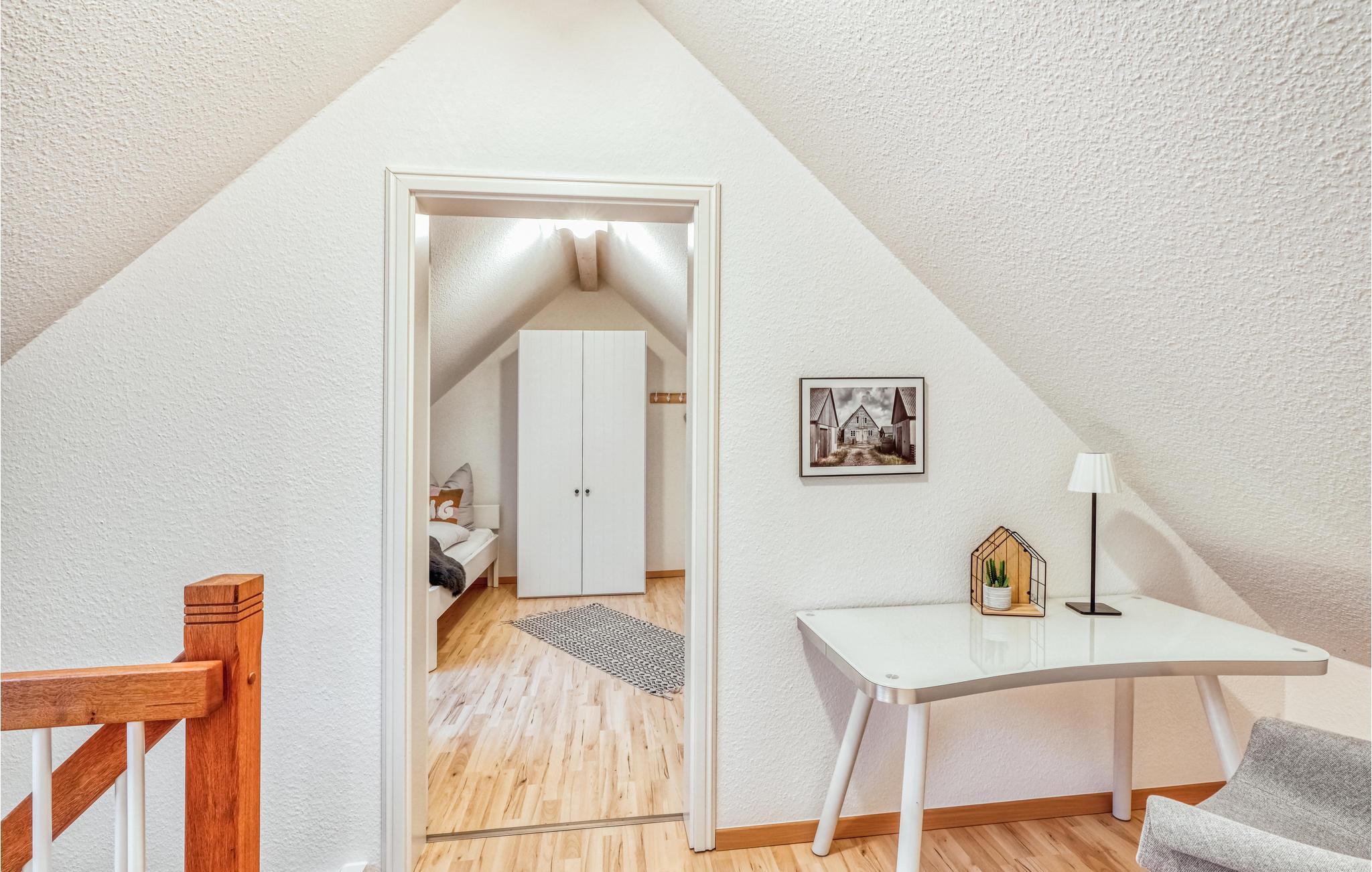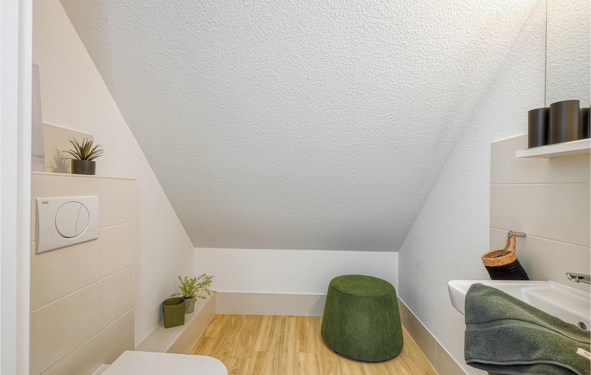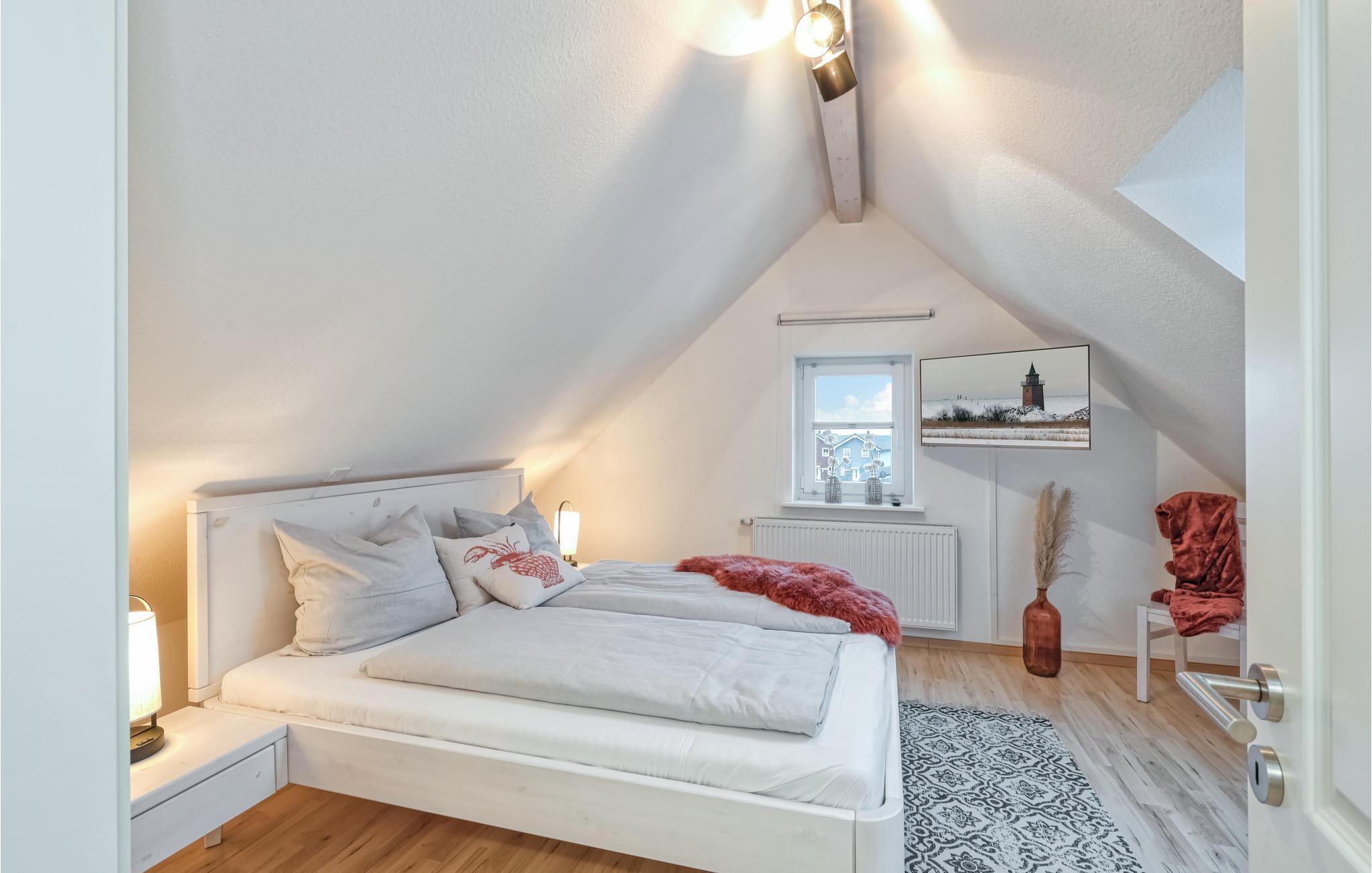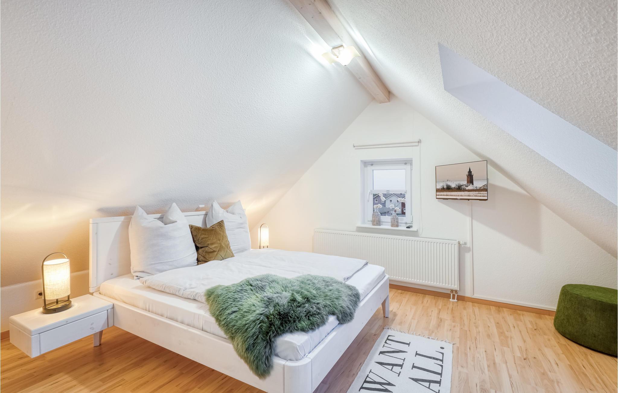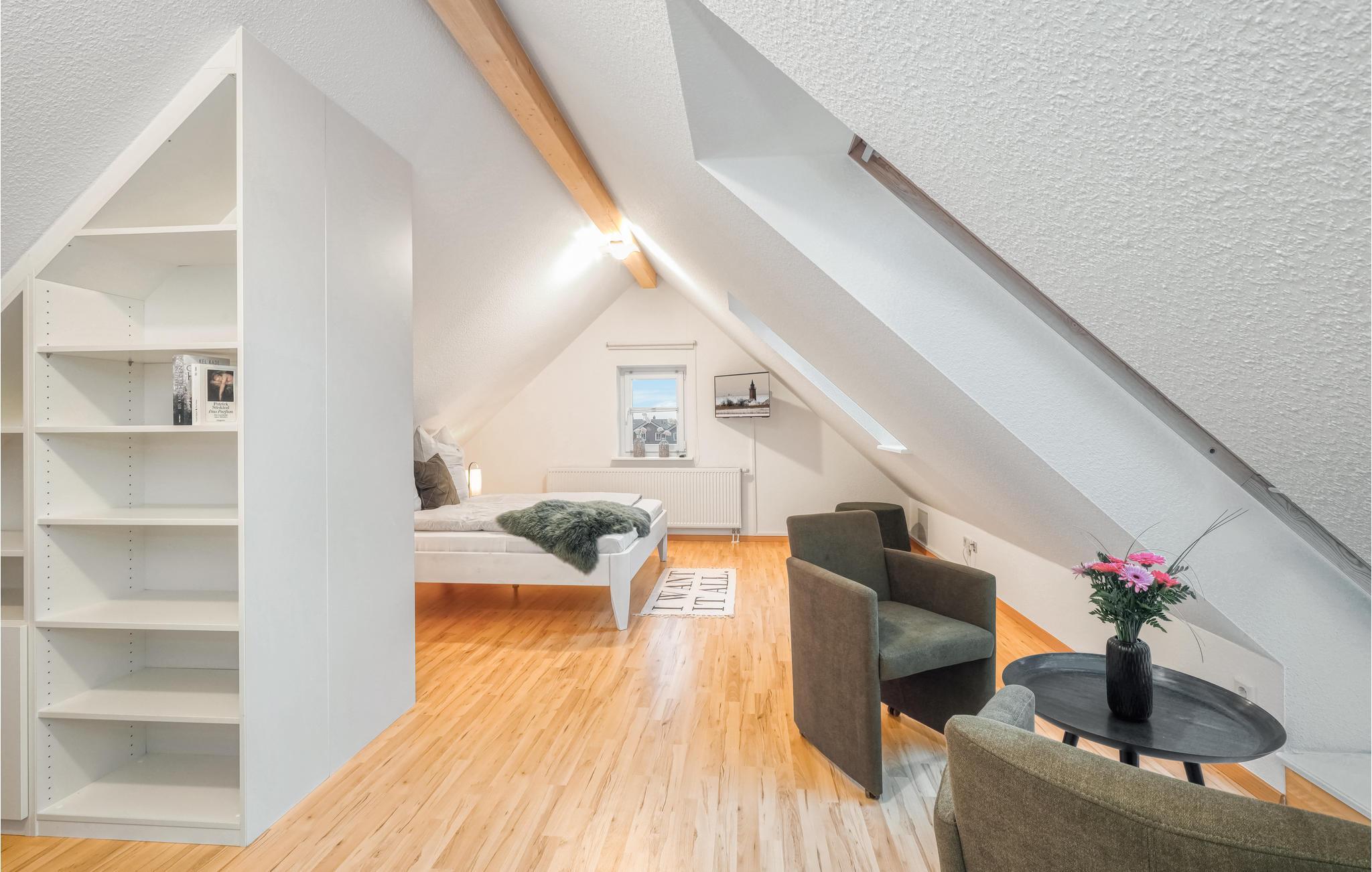 Denne komfortable og lyse ferieleiligheten ved Nordsjøkysten ønsker deg velkommen midt i sentrum av byen. Leiligheten er ideell for familier eller ferier med venner, og det er nok plass til alle. Den vakre leiligheten over to etasjer ligger rett i den lille butikkrekken i Dagebüll. Det er en kafé i første etasje, så det er bare trappene i huset som skiller deg fra en deilig frokost eller kaffe og kake. Du kan selvfølgelig også lage mat selv på det moderne kjøkkenet i ferieleiligheten. I stuen kan alle sette seg godt til rette i det høykvalitets sofaområdet, og et stort spisebord er selvfølgelig også tilgjengelig. Soverommene ligger rett under taket i 2. etasje. Vær oppmerksom på at sengene står på skråtaket, og at sittehøyden ved hodegjerdet er ganske lav. Spesielt i den kalde årstiden vil du ha glede av den infrarøde badstuen og det ekstra store badekaret, der du kan varme deg opp etter en lang tur langs diget.