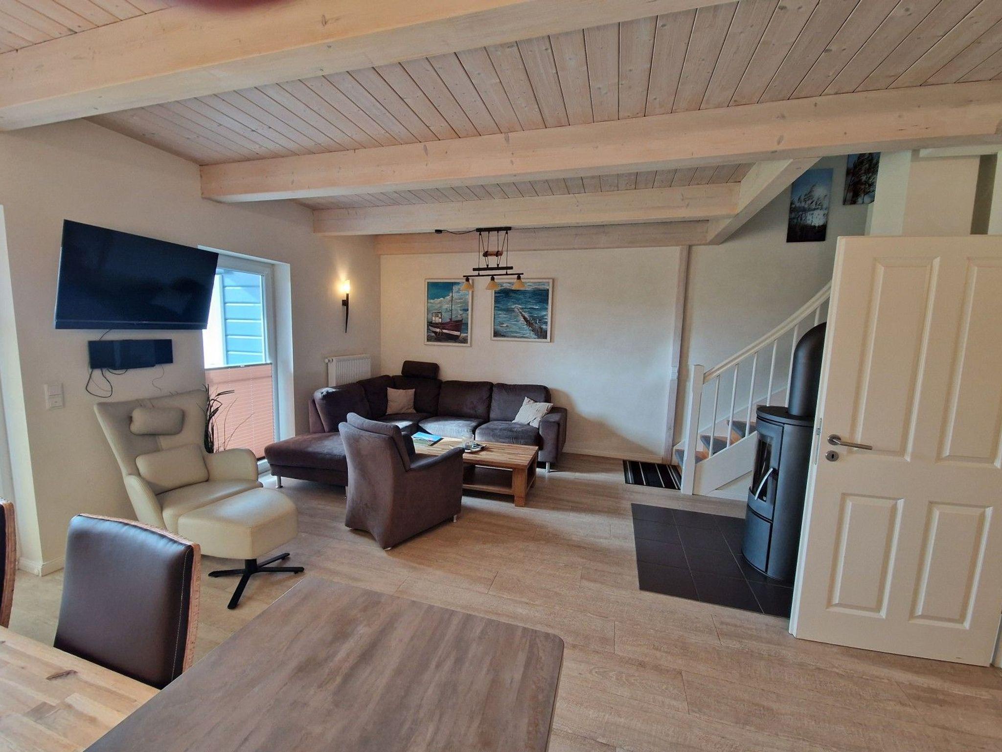 Der lichtdurchflutete Wohn- und Essbereich verfügt über eine moderne, komplett ausgestattete Küche und einen gemütlichen Kaminofen. Im Obergeschoss befindet sich das Wellness-Highlight des Hauses: eine großzügige Sauna und eine XXL-Badewanne für zwei Personen. Zwei weitere Schlafzimmer sorgen für viel Platz und Komfort.