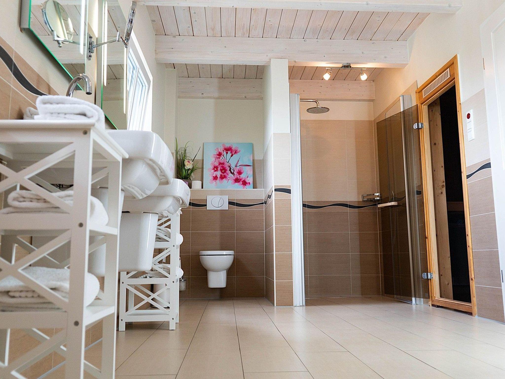 Im Obergeschoss lädt ein großzügiges Wellnessbad mit Sauna und Badewanne zum Entspannen ein. Ein Balkon bietet zusätzlichen Raum, um die frische Nordseeluft zu genießen. Insgesamt stehen vier Schlafzimmer zur Verfügung, die auf beide Etagen verteilt sind und ausreichend Platz für gemeinsame oder ruhige Stunden bieten.