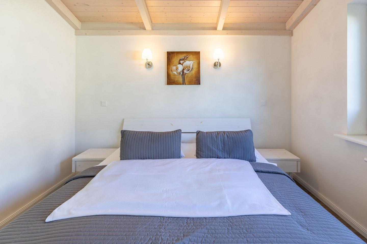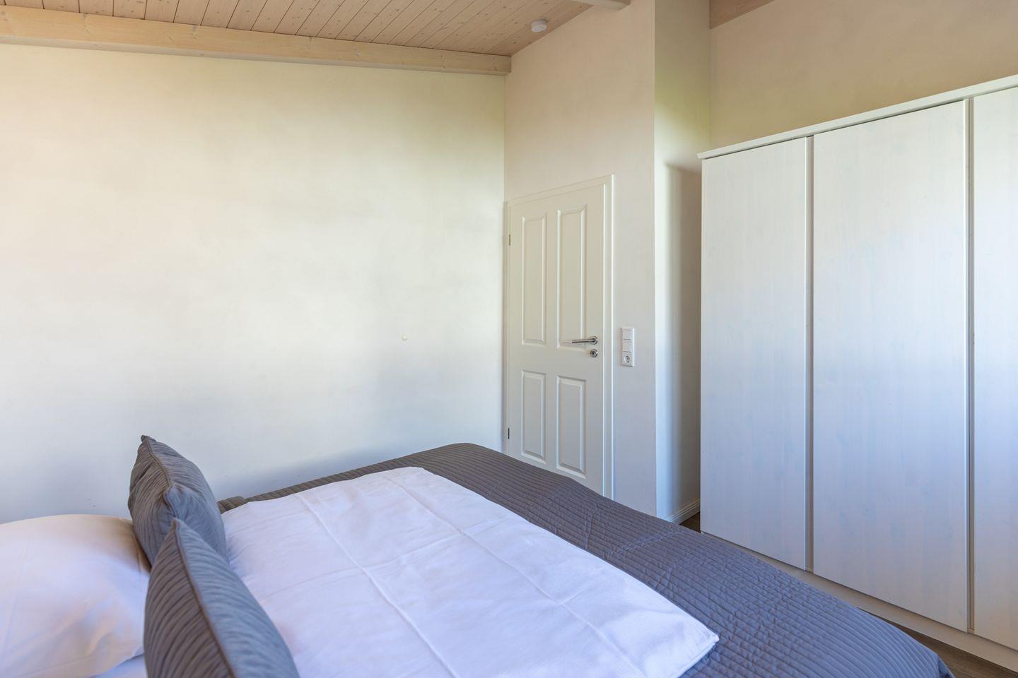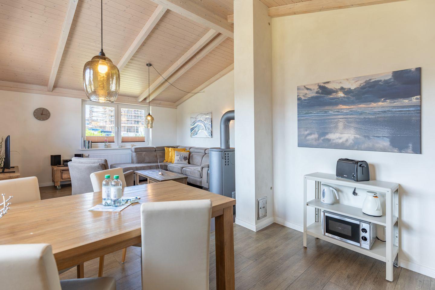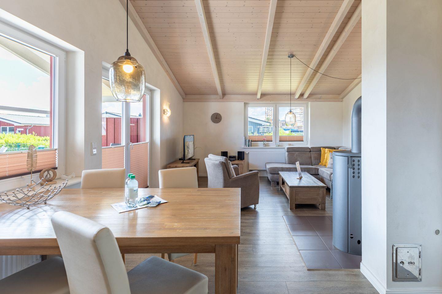 Das 85 qm große Ferienhaus ist modern und exklusiv im skandinavischen Charme eingerichtet. Die zwei Schlafzimmer mit jeweils einen Komfort-Doppelbett (180 x 200 cm) bieten Platz für bis zu vier Personen. Das gemütliche Wohnzimmer ist mit einem Smart-TV ausgestattet. Der Kaminofen sorgt auch in der kälteren Jahreszeit für behagliche Stunden. Die offene Küche bietet Ihnen eine exklusive und umfangreiche Ausstattung, die das Herz eines jeden Hobbykochs höher schlagen lässt: Ceranfeld mit 4 Kochplatten, Backofen, Kühlschrank mit ***Gefrierfach, Mikrowelle, Geschirrspüler, Filterkaffeemaschine uvm. Das Badezimmer lässt keine Wünsche offen: zwei Waschbecken, eine große Badewanne, eine ebenerdige Dusche und eine schöne Sauna geben Ihrem Urlaub den richtigen Rahmen. Das Ferienhaus verfügt über ein zusätzliches WC. Auf der überdachten, windgeschützten Terrasse können Sie auf bequemen Gartenstühlen, den Sonnenliegen oder im Strandkorb die Sonne genießen.