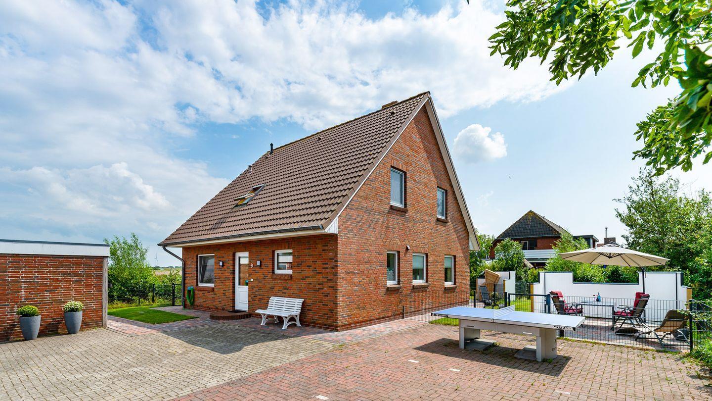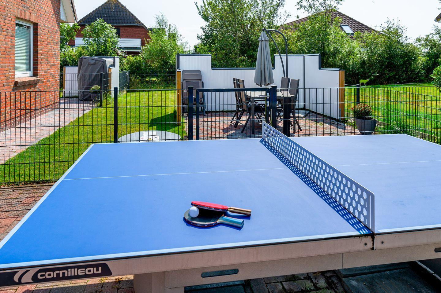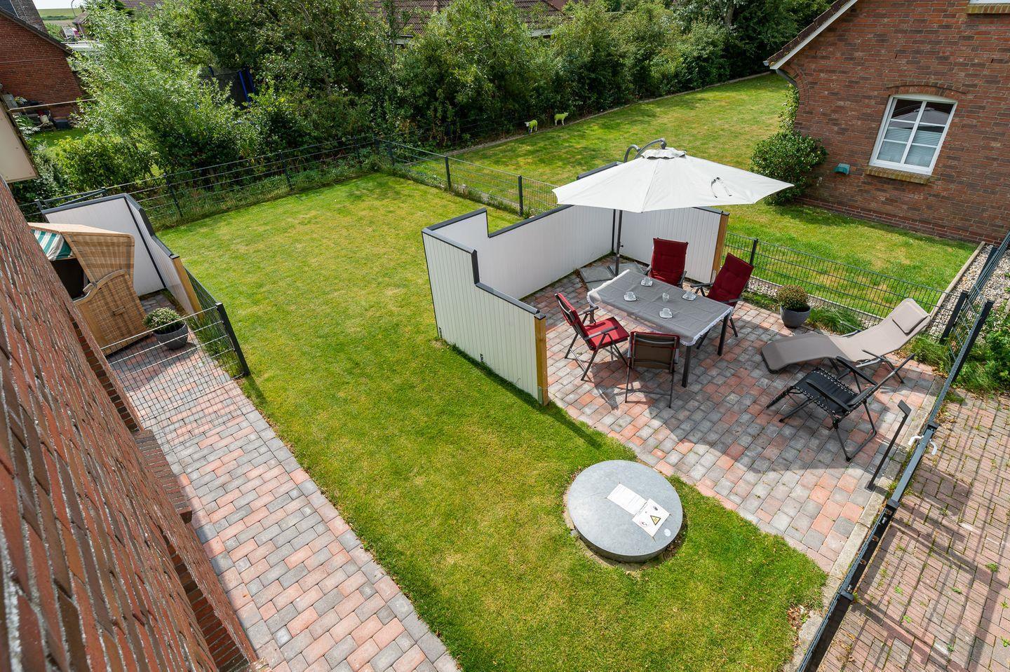 An warmen Tagen lädt die Terrasse oder Sonnenterrasse mit Gartenmöbeln zum Entspannen ein. Genießen Sie die frische Nordseeluft und lassen Sie den Blick über die grüne Liegewiese schweifen. Für Sonnenanbeter stehen Liegen bereit, um sich im Freien zu entspannen.