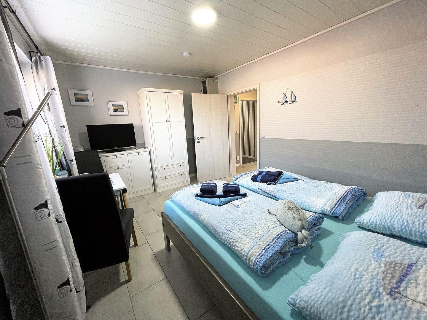 Die Ferienwohnung ist modern und komfortabel ausgestattet. Der geräumige Wohnbereich verfügt über eine Sofaecke, einen Fernseher sowie ein gemütliches Esszimmer, das perfekt für gemeinsame Mahlzeiten geeignet ist. Die gut ausgestattete Küche lässt keine Wünsche offen: Neben einem Herd, Backofen und Kühlschrank finden Sie hier auch eine Spülmaschine und alle notwendigen Küchenutensilien. Die beiden Badezimmer sind mit bodengleichen Duschen ausgestattet und bieten Ihnen ein großzügiges Maß an Komfort. Die gemeinsam genutzte Waschmaschine und Trockner ist über Ihre Terrasse direkt erreichbar.