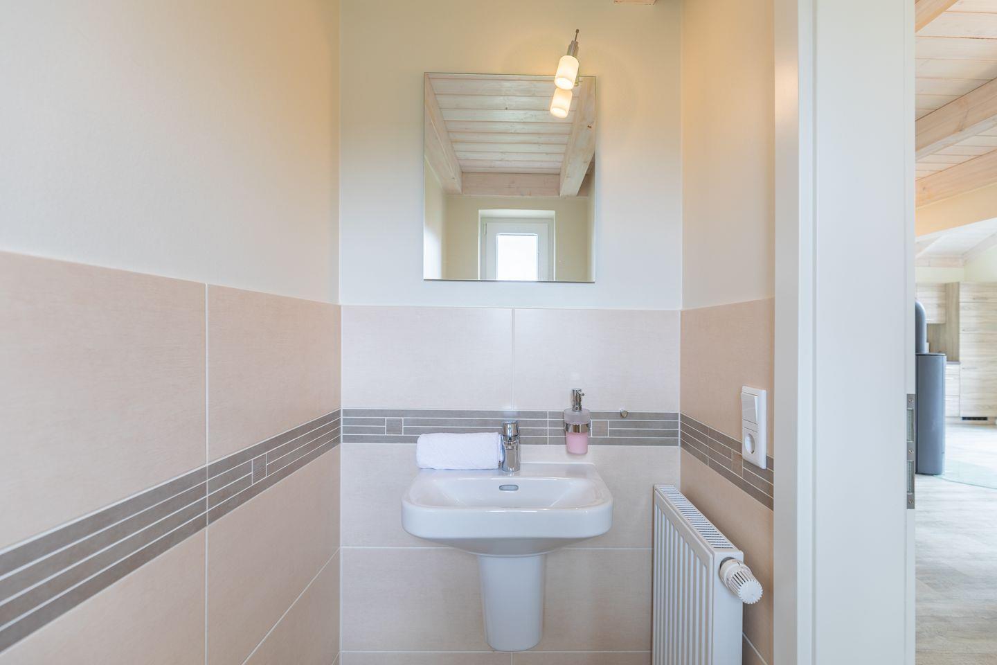 Das gemütliche Wohnzimmer ist mit SAT-TV ausgestattet. Der Kaminofen sorgt auch in der kälteren Jahreszeit für behagliche Stunden. Die offene Küche bietet Ihnen eine exklusive und umfangreiche Ausstattung, die das Herz eines jeden Hobbykochs höher schlagen lässt: Ceranfeld mit 4 Kochplatten, Backofen, Kühlschrank mit ***Gefrierfach, Mikrowelle, Geschirrspüler, Filterkaffeemaschine uvm. Das Badezimmer lässt keine Wünsche offen: zwei Waschbecken, eine große Badewanne, eine ebenerdige Dusche und eine schöne Sauna geben Ihrem Urlaub den richtigen Rahmen. Das Ferienhaus verfügt über ein zusätzliches WC. Auf der überdachten Terrasse können Sie auf bequemen Gartenstühlen und -liegen die Sonne genießen.