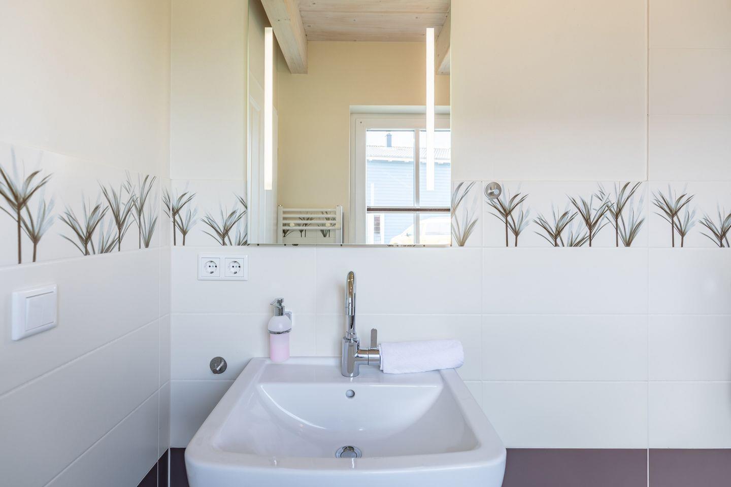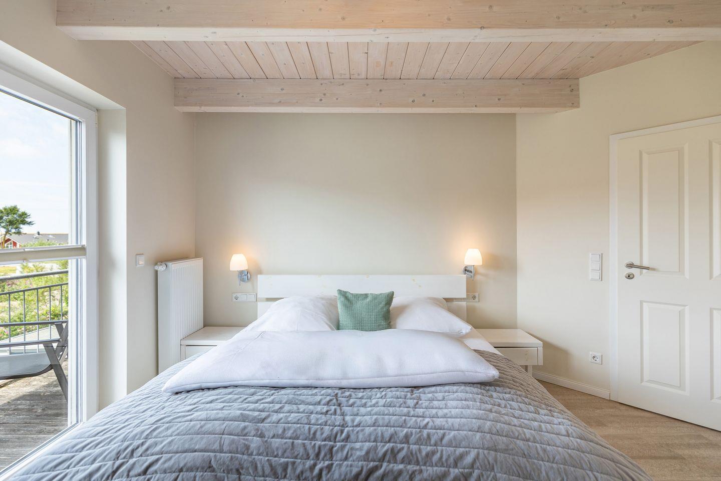 Das zweite Schlafzimmer liegt mit einem Doppelbett mit der Größe von 180x200cm im ersten Obergeschoss. Auf dieser Ebene finden Sie auch das große Badezimmer mit Dusche, Badewanne sowie zwei Waschbecken. Die Sauna rundet das Bild ab und lädt ein zum Verweilen für gemütliche Stunden. Das dritte und vierte Schlafzimmer befinden sich im zweiten Obergeschoss, eines mit jeweils zwei Einzelbetten (90x200cm) und ein weiteres Doppelbett mit der Größe von 180x200cm. Im zweiten Obergeschoss befindet sich noch ein Gäste-WC.