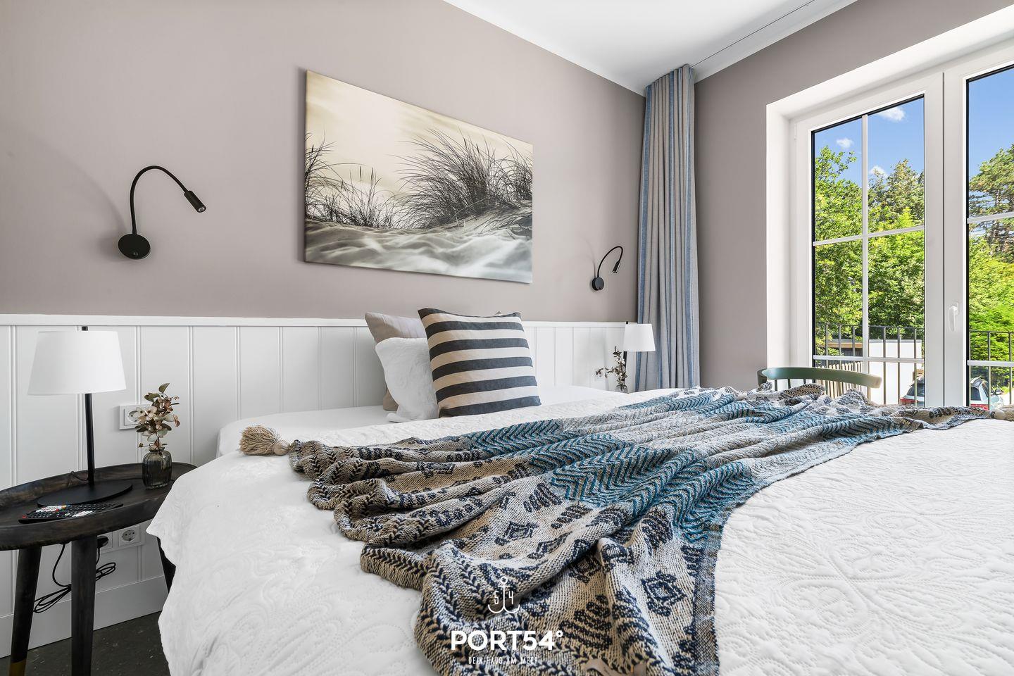 Das separate Schlafzimmer ist stilvoll eingerichtet und punktet mit hochwertigen Betten, Verdunkelungsmöglichkeiten sowie Sichtschutz an allen Fenstern. Fußbodenheizung in allen Bereichen, ein Ganzkörperspiegel und viele liebevolle Details unterstreichen das luxuriöse Flair. Im Badezimmer erwartet dich eine bodengleiche Regendusche, ein Waschtisch mit Spiegel und Kosmetikspiegel sowie ein Haartrockner. Die gemeinschaftlich nutzbaren Waschmaschinen und Trockner im Haus bieten dir weitere Annehmlichkeiten, ergänzt durch praktische Extras wie Wäscheständer, Bügeleisen, Bügelbrett und Staubsauger.