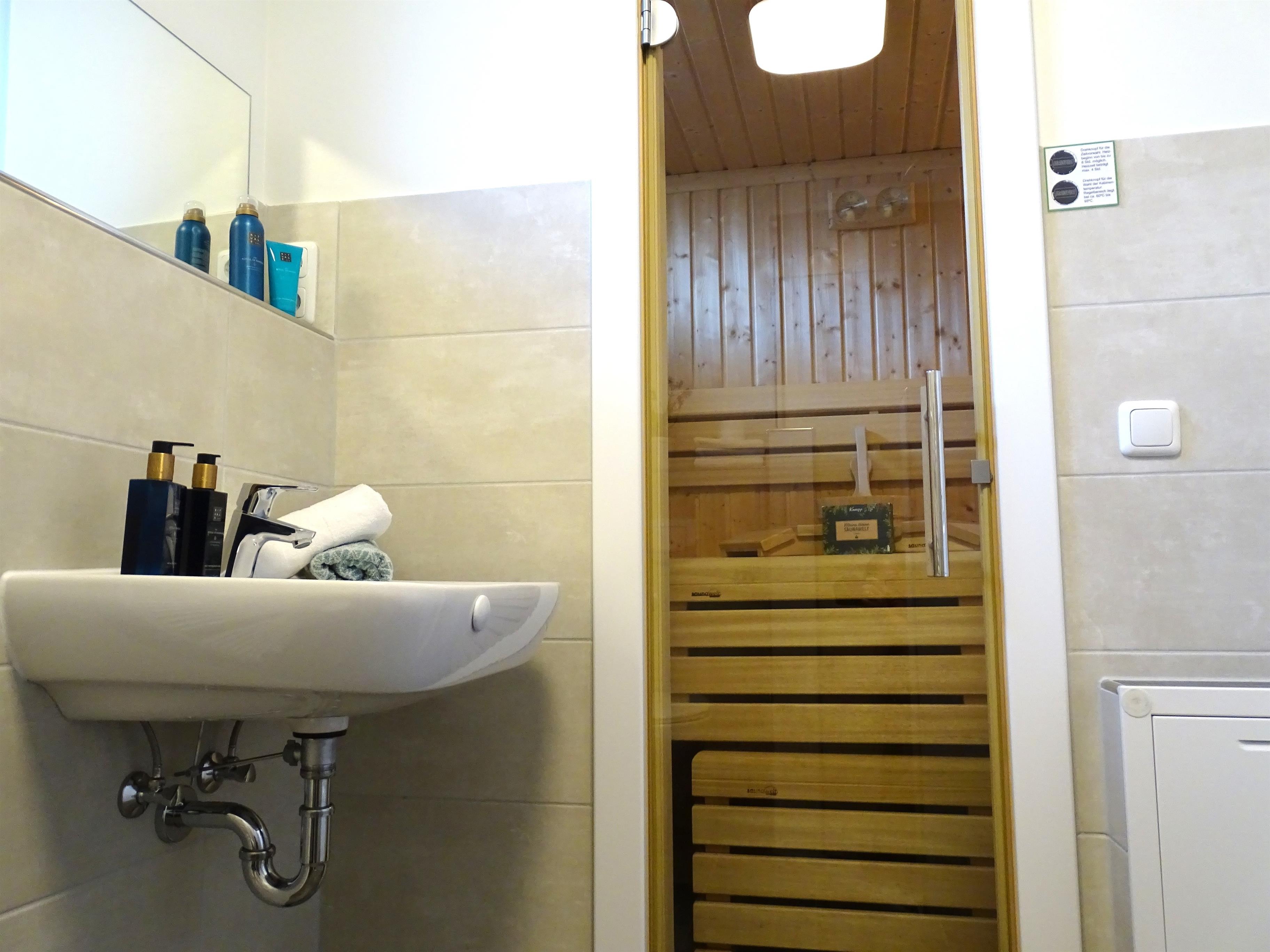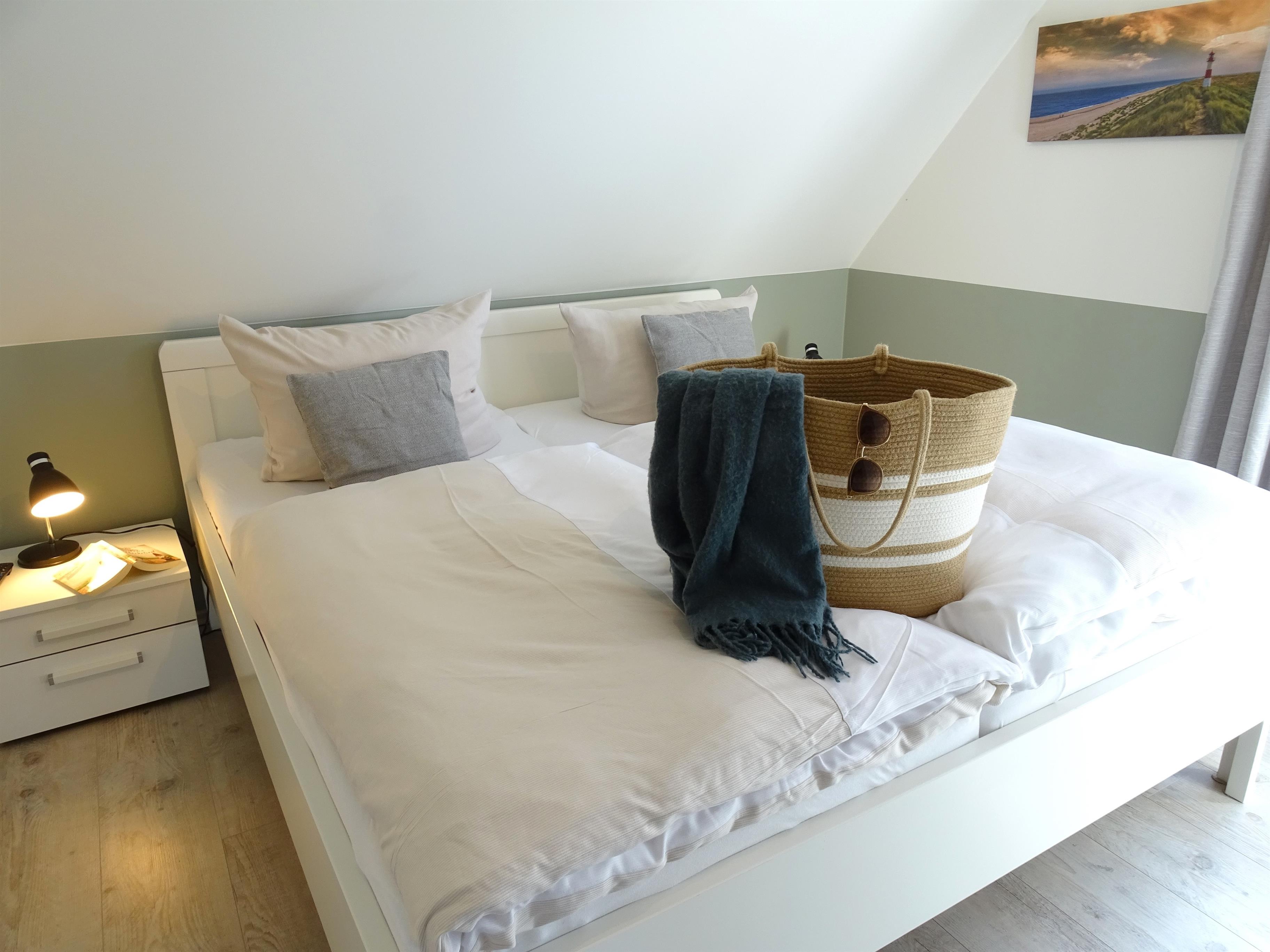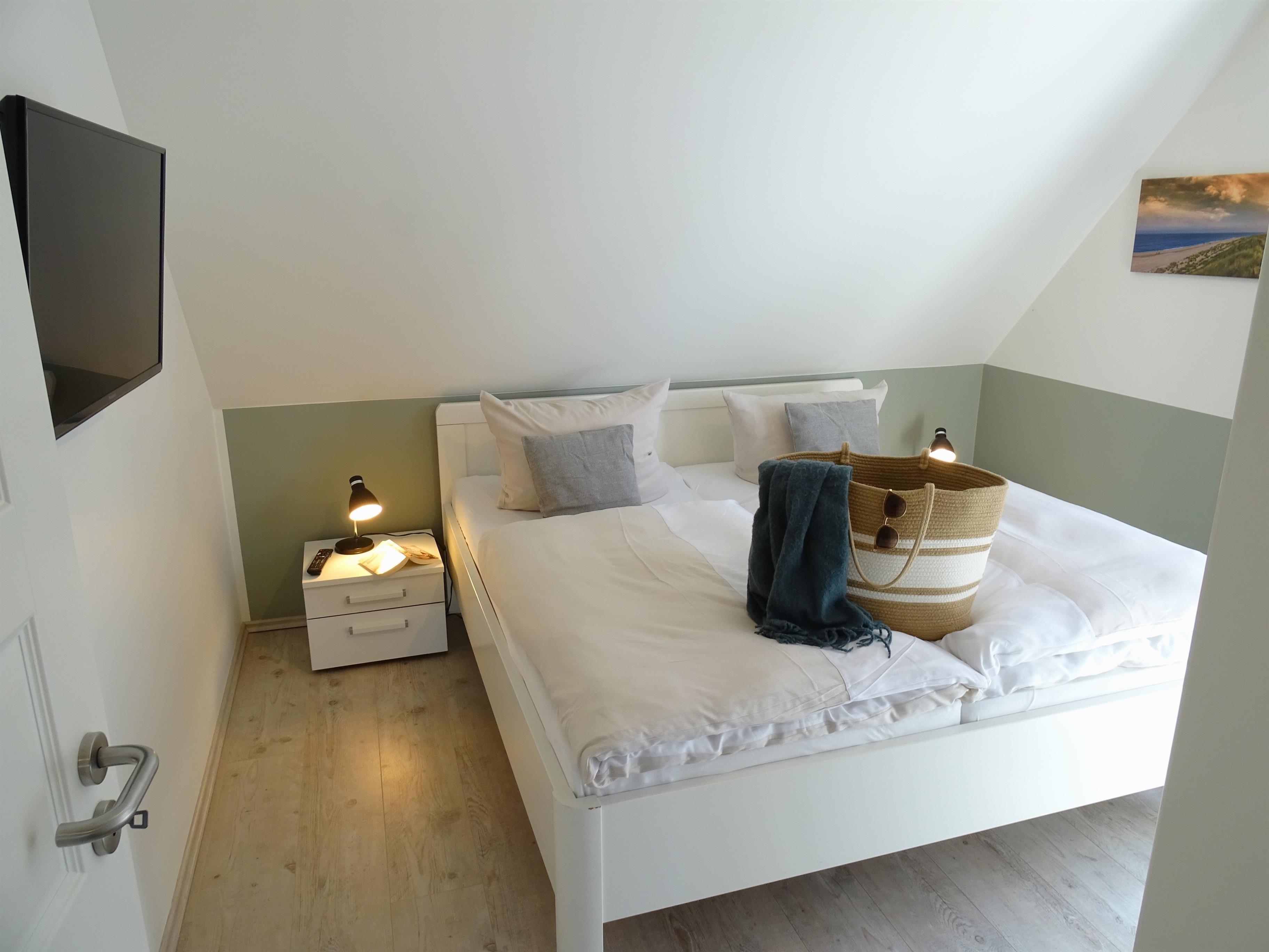 1 Schlafzimmer mit Doppelbett 180x200 und Fernseher sowie jeweils 1 Schlafzimmer mit einem Einzelbett 90x200. Ein Badezimmer mit Sauna und Dusche und ein Gäste- WC stehen in diesem Ferienobjekt zur Verfügung.