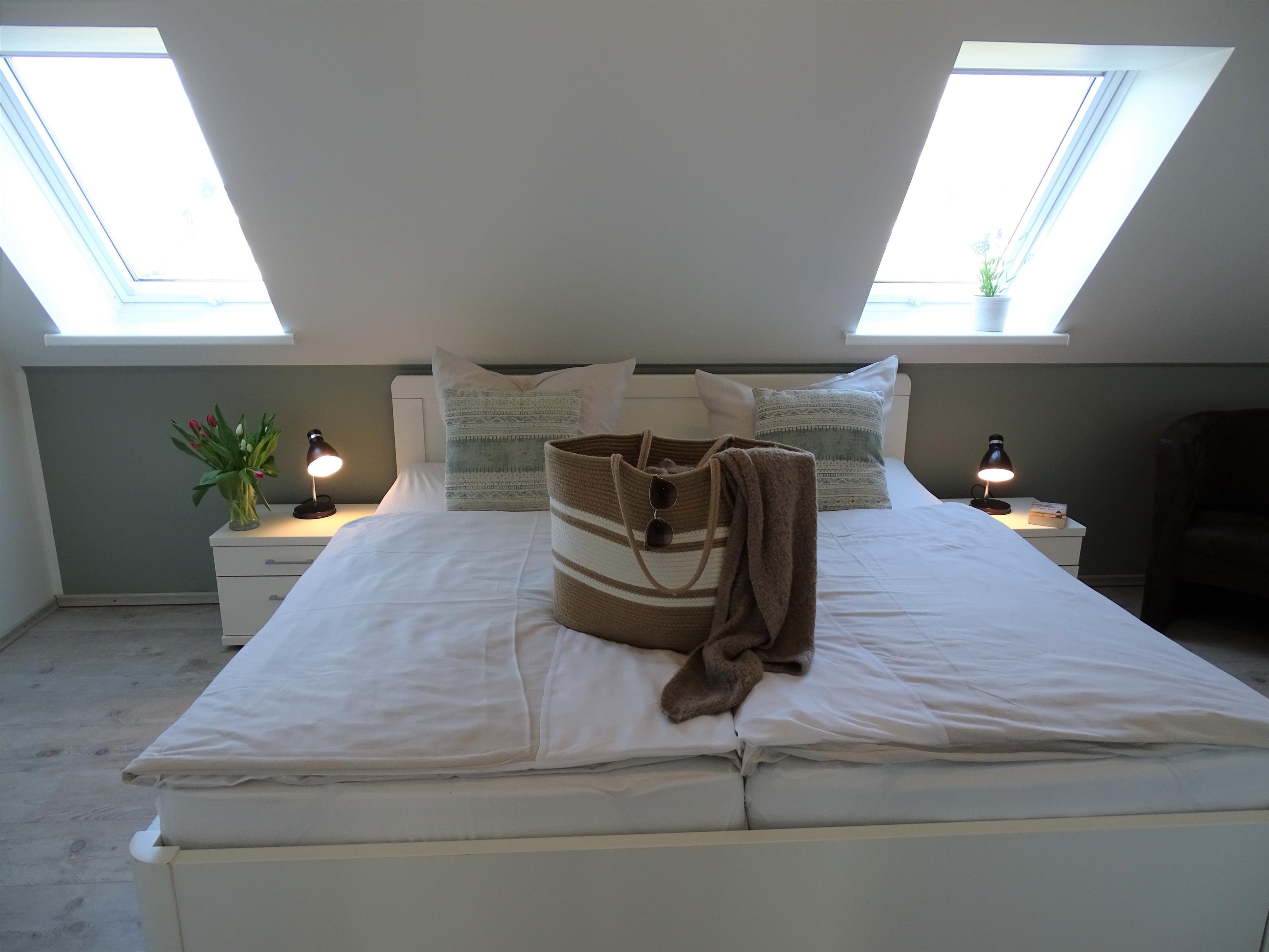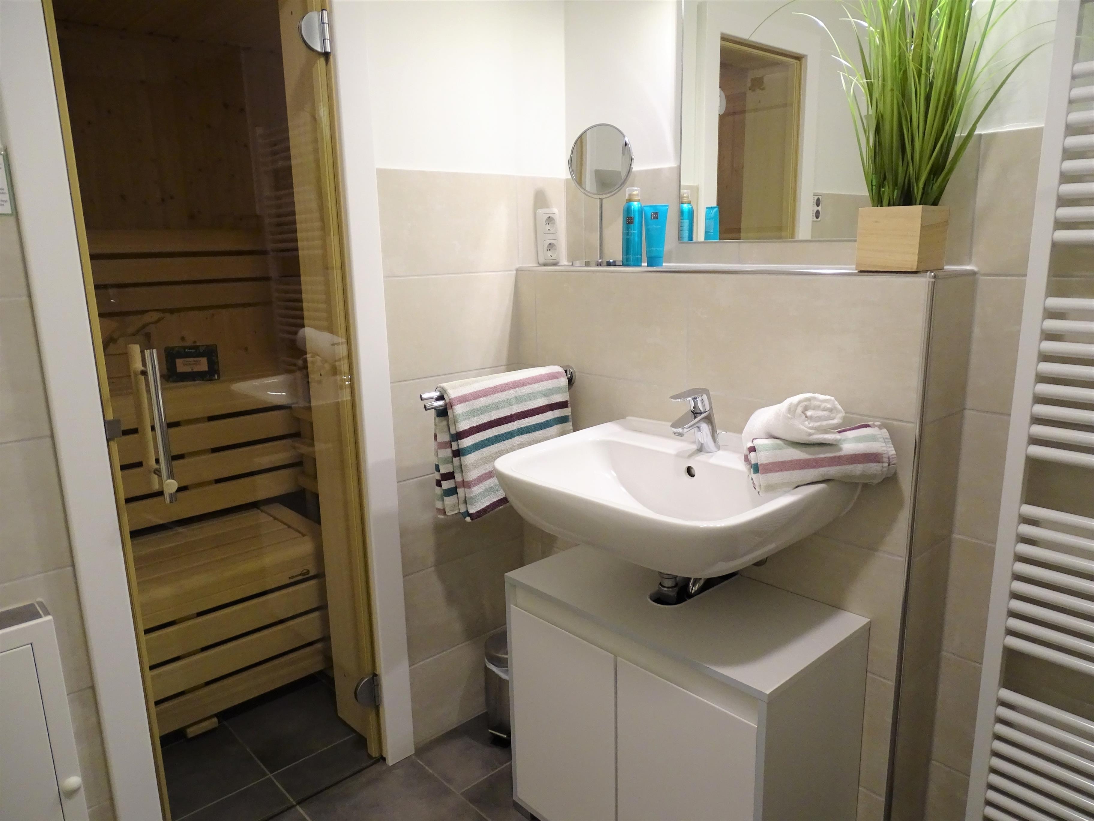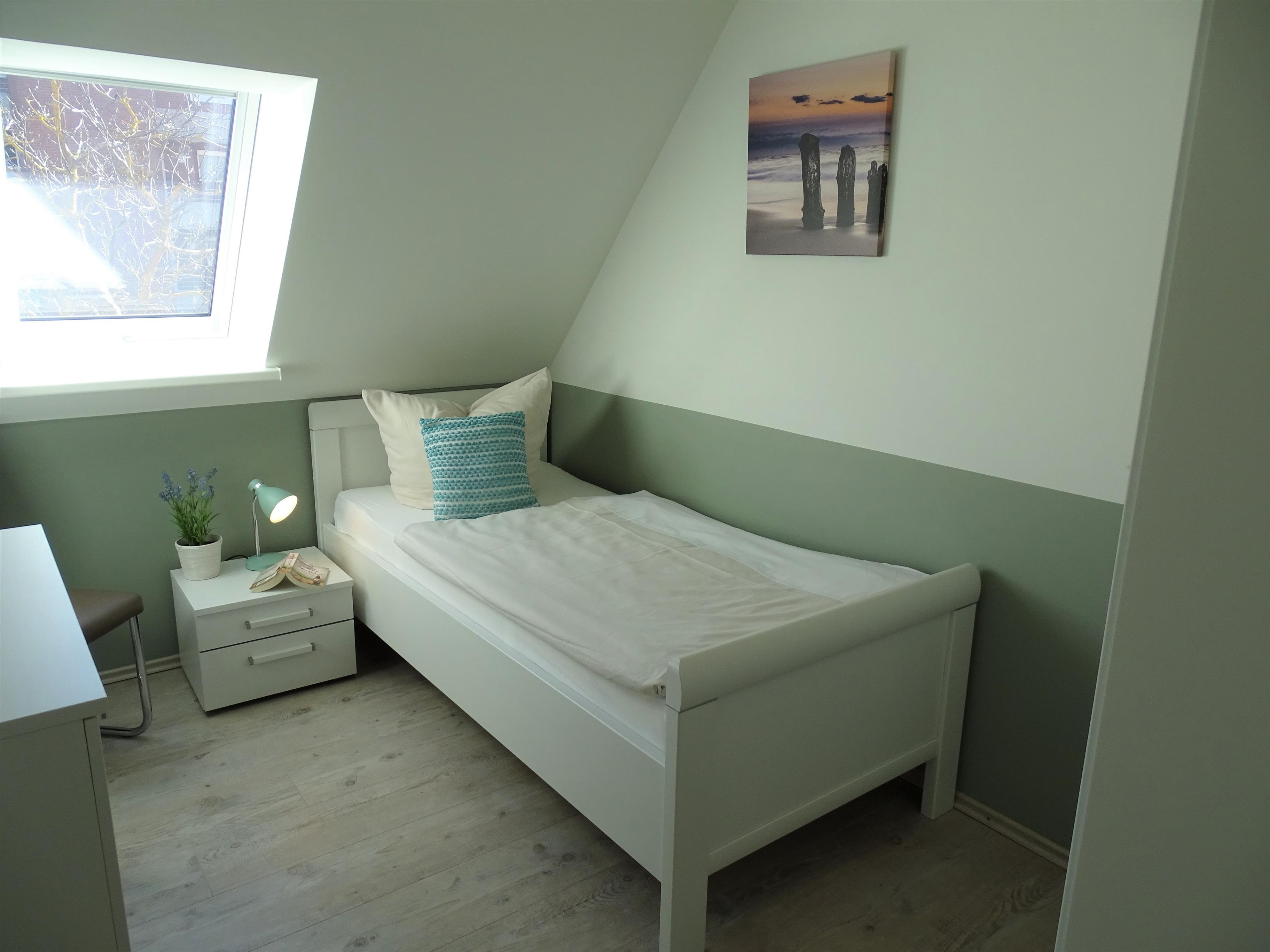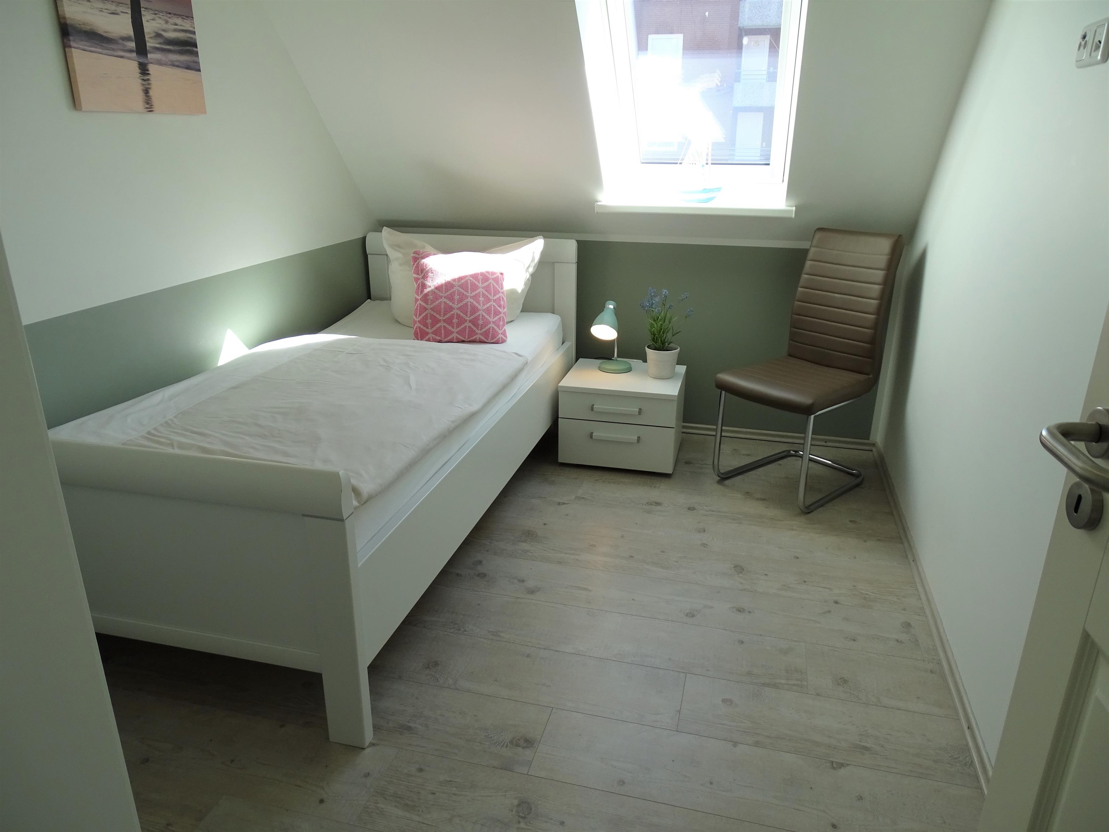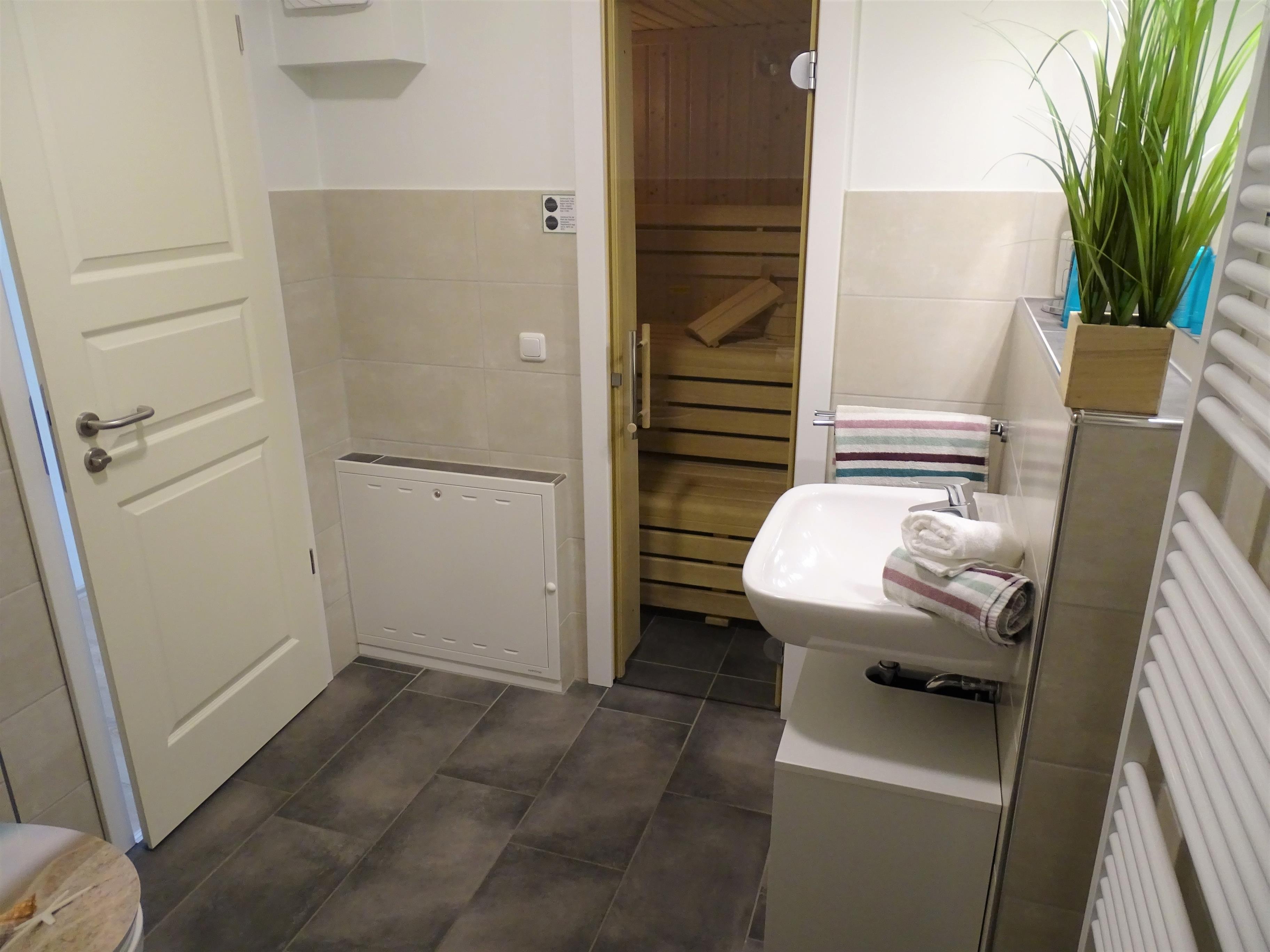 1 Schlafzimmer mit Doppelbett 180x200 und Fernseher sowie jeweils 1 Schlafzimmer mit einem Einzelbett 90x200. Ein Badezimmer mit Sauna und Dusche und ein Gäste- WC stehen in diesem Ferienobjekt zur Verfügung.