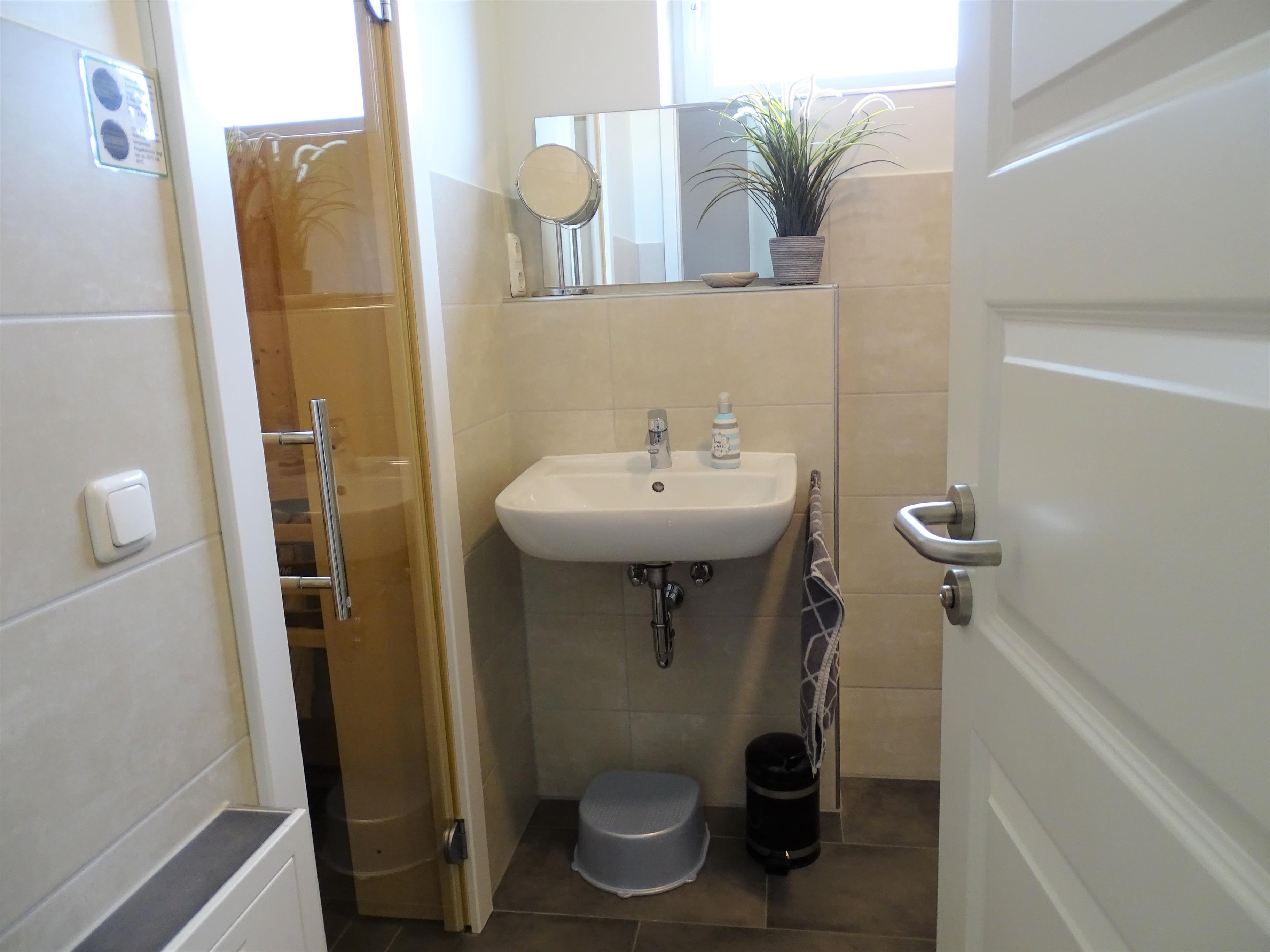 1 Schlafzimmer mit Doppelbett 180x200 und Fernseher sowie jeweils 1 Schlafzimmer mit einem Einzelbett 90x200. Ein Badezimmer mit Sauna und Dusche und ein Gäste- WC stehen in diesem Ferienobjekt zur Verfügung.