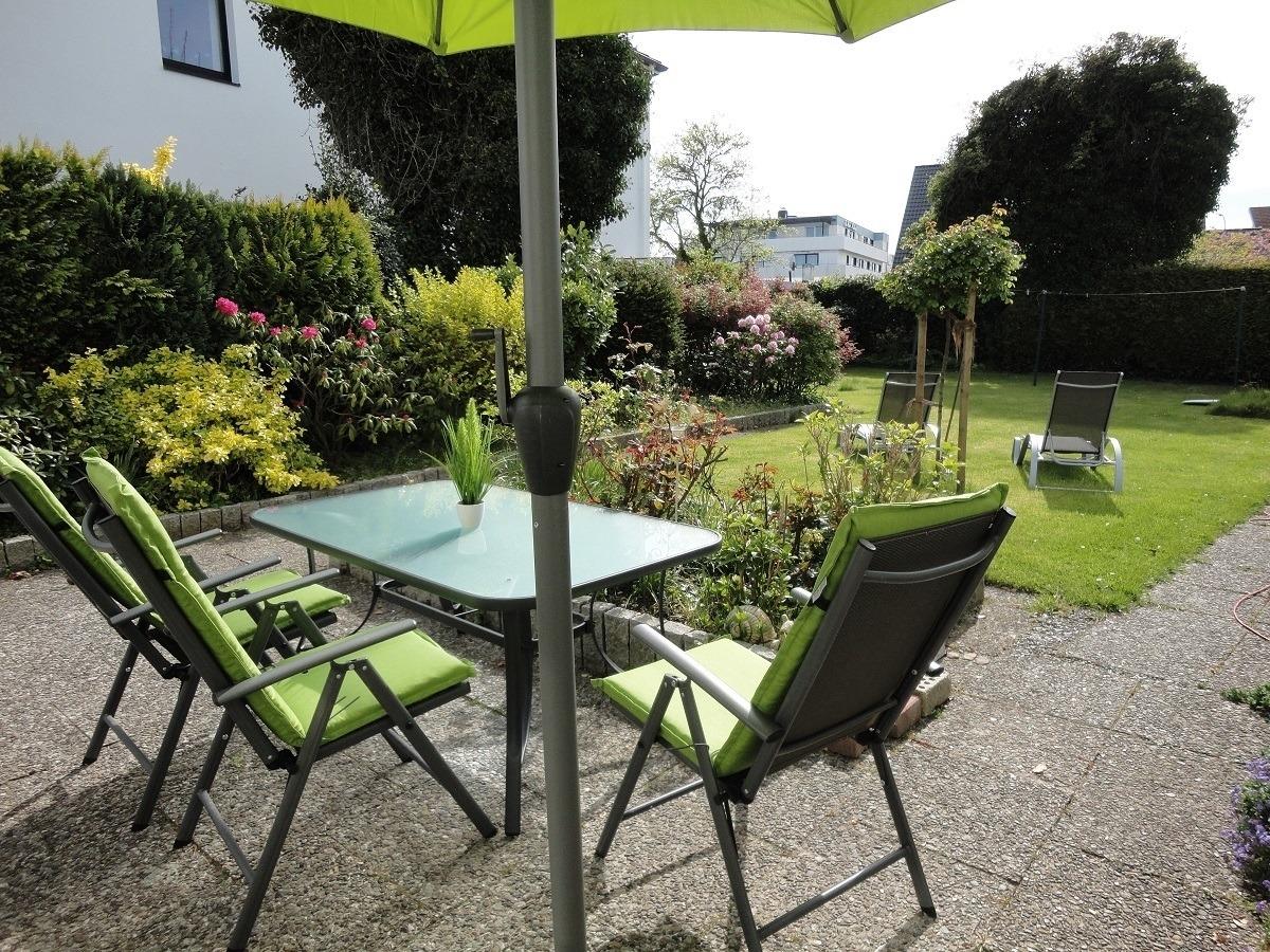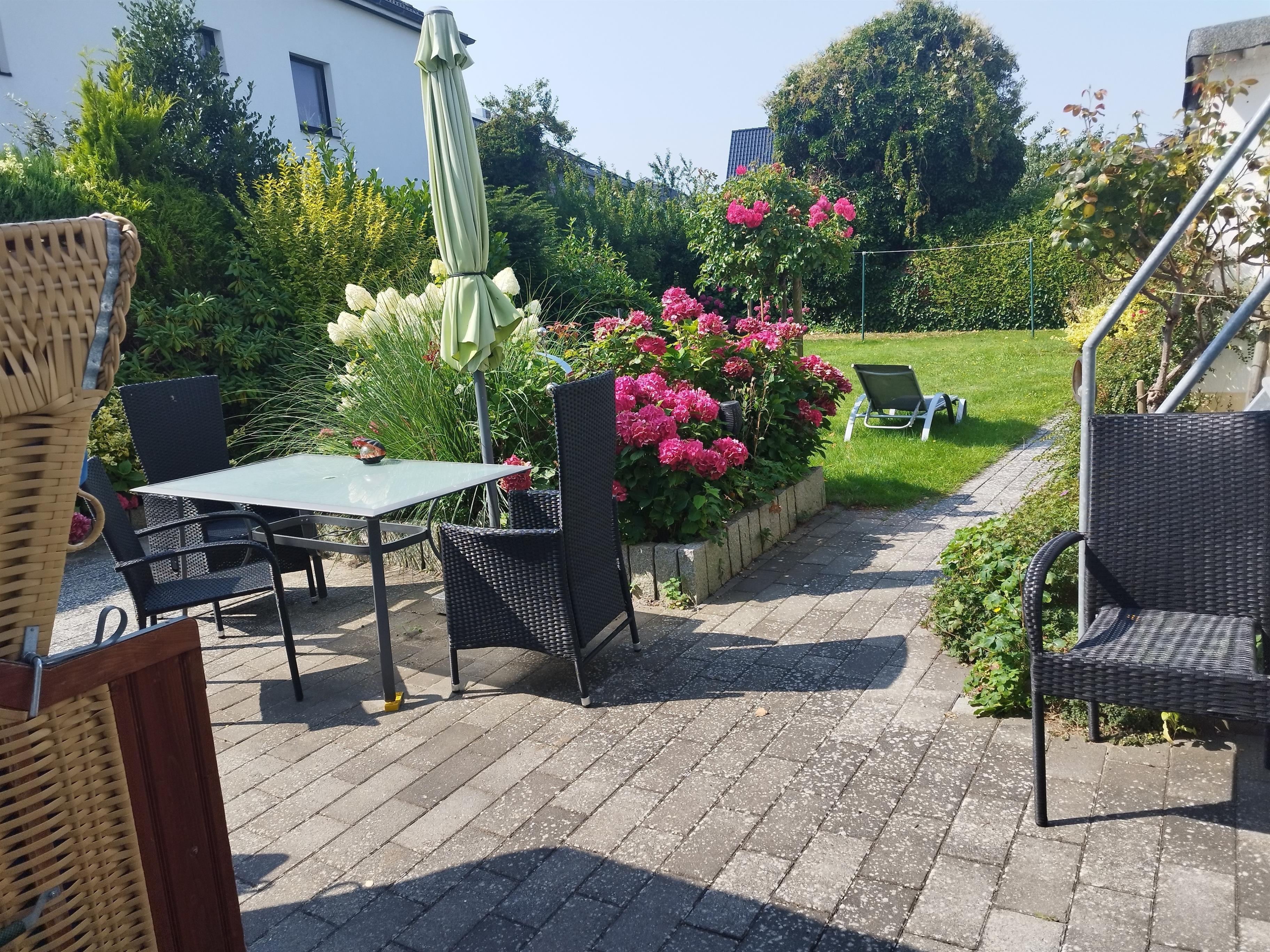 Möblierte Terrasse nach Südwest hier genießen Sie die Sonne von morgens bis zum Abend. Extras die nix kosten: Kinderbett, Chicco Kindersitz auf Stuhl anzubringen. Ki.- Tritt fürs Waschbecken, W-LAN, Sajfe, eigener Parkplatz u. Fahrradschuppen.