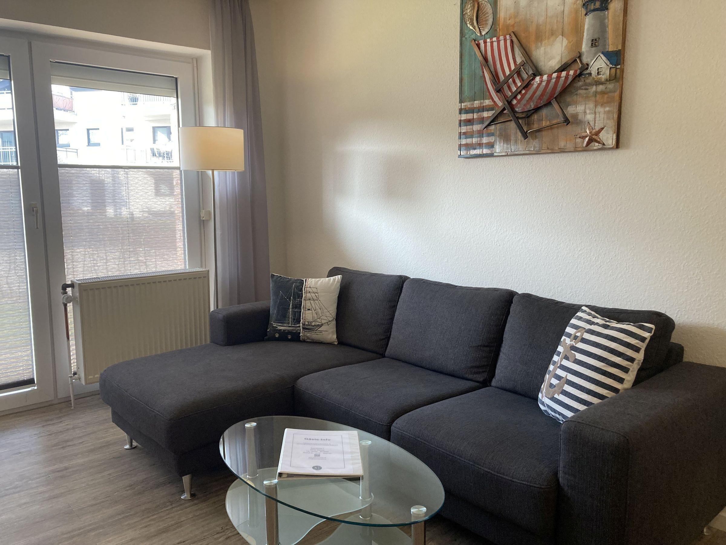 Schöne 3-Zimmer Ferienwohnung mit zwei Schlafzimmern im Erdgeschoss mit Terrasse. Das Wohnzimmer ist mit Essplatz und offener Küche ausgestattet. Zur Wohnung gehört ein Strandkorb am Hauptstrand.