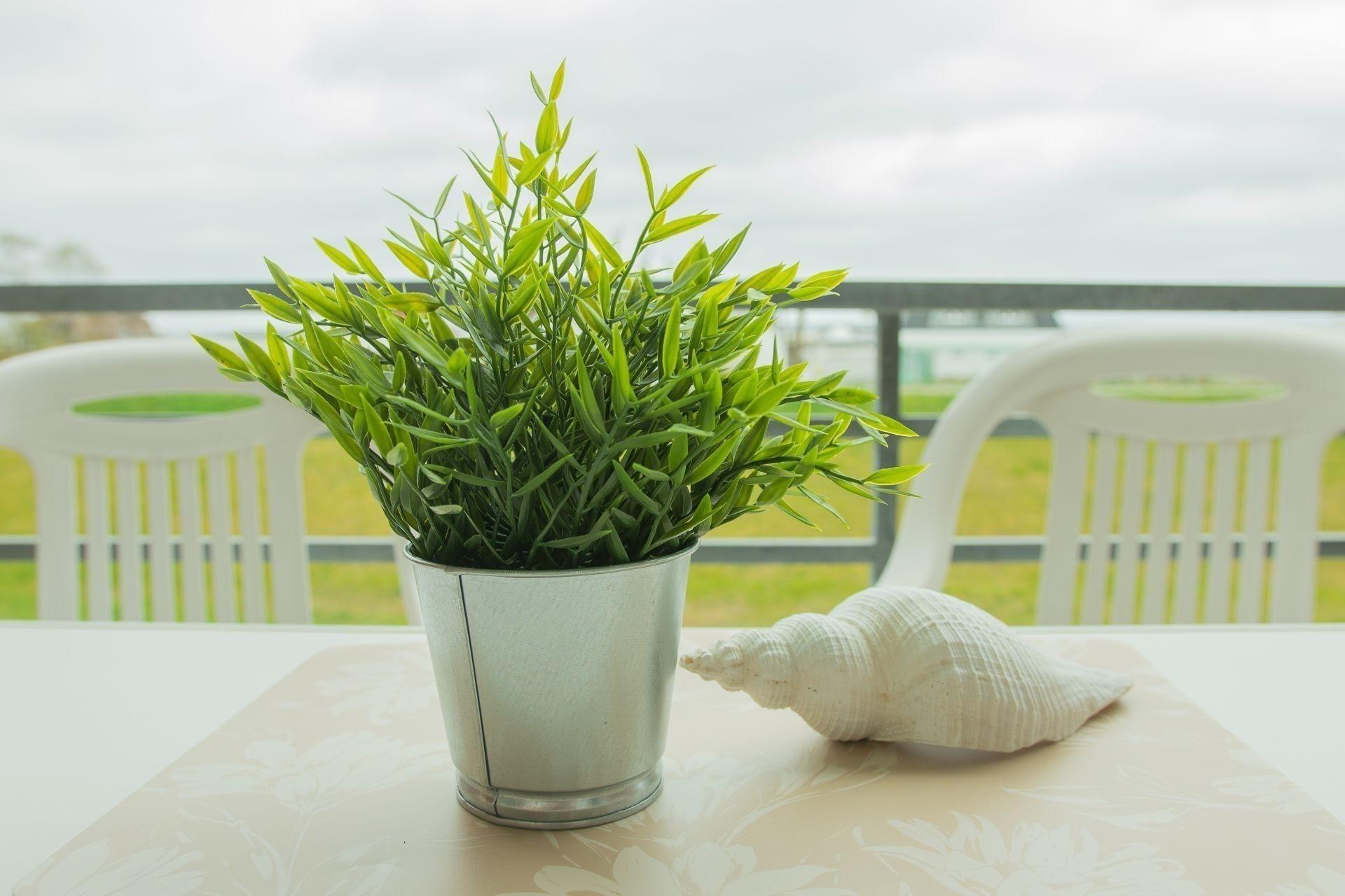 Zur Wohnung gehört ein Parkplatz und ein Balkon mit Meerblick.