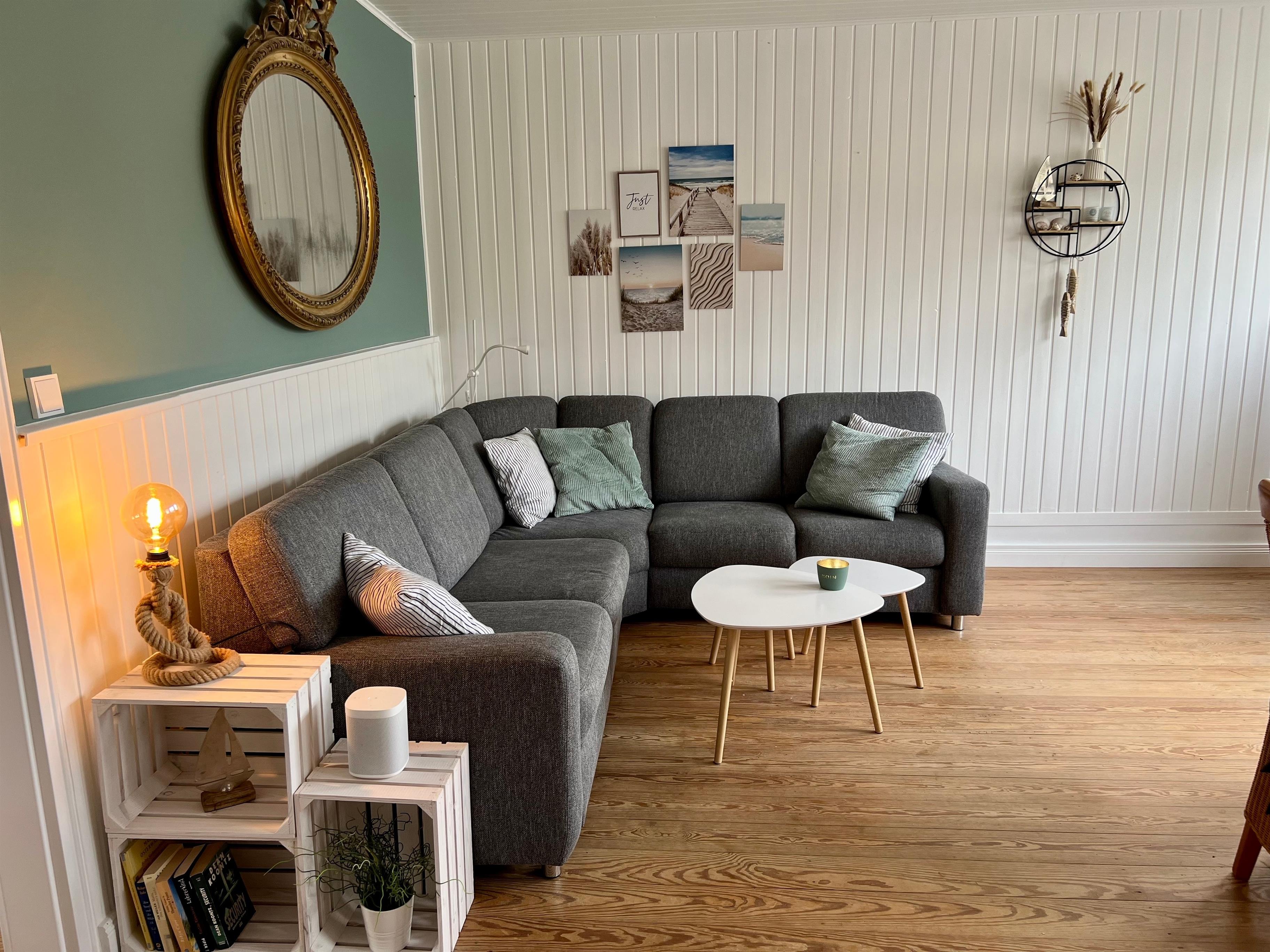In unserem Wohnzimmer steht euch eine gemütliche Couch, ein schöner Esstisch, W-Lan, TV, Stereoanlage und eine Sonos-Musik-Box zur Verfügung. Die offene Küche ist perfekt ausgestattet und lädt zum Kochen ein.